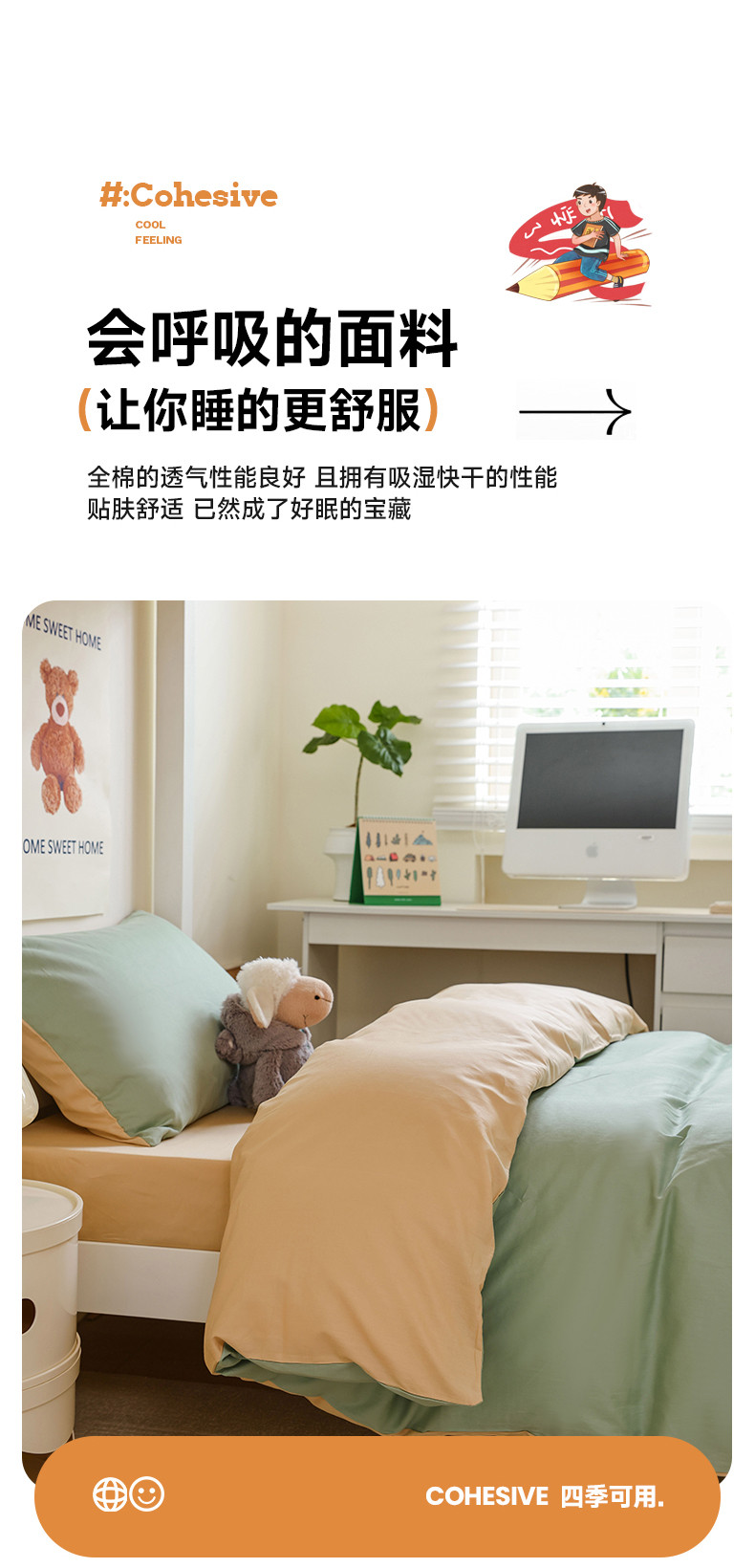 (总)寐眠 23款13372纯棉40s纯色双拼学生三件套四件套
