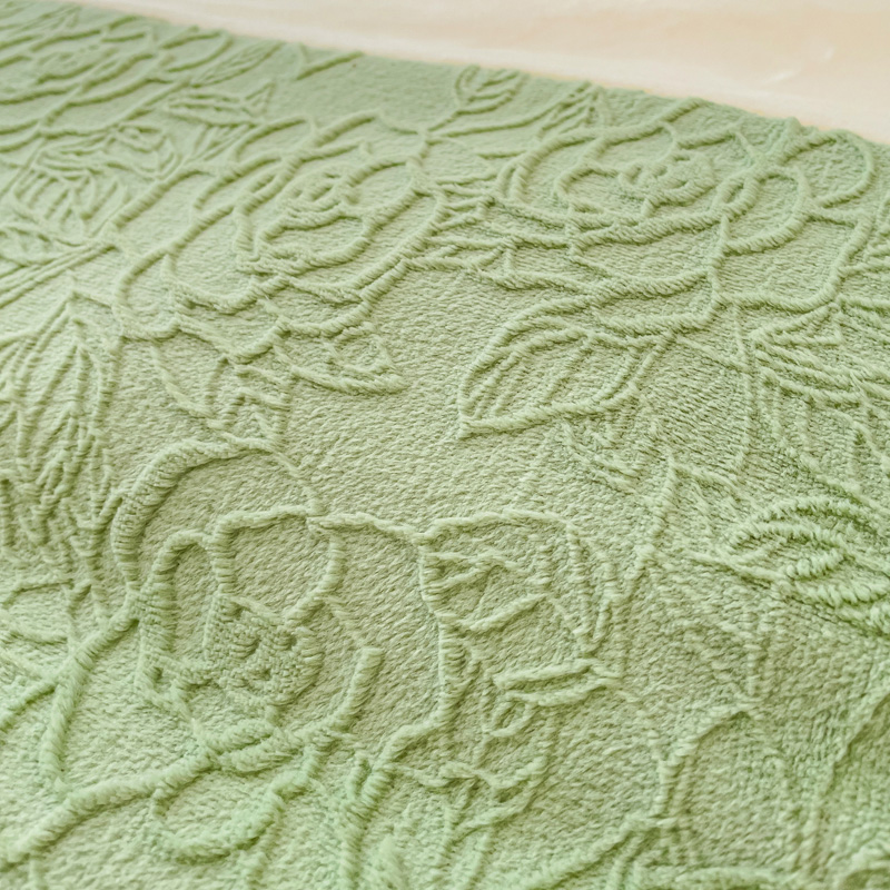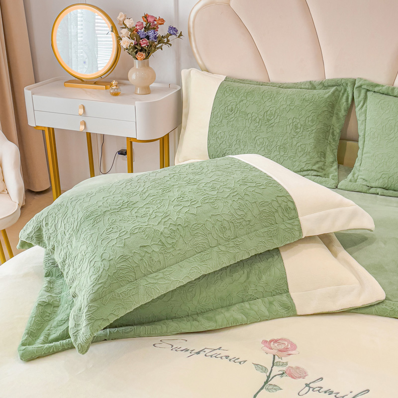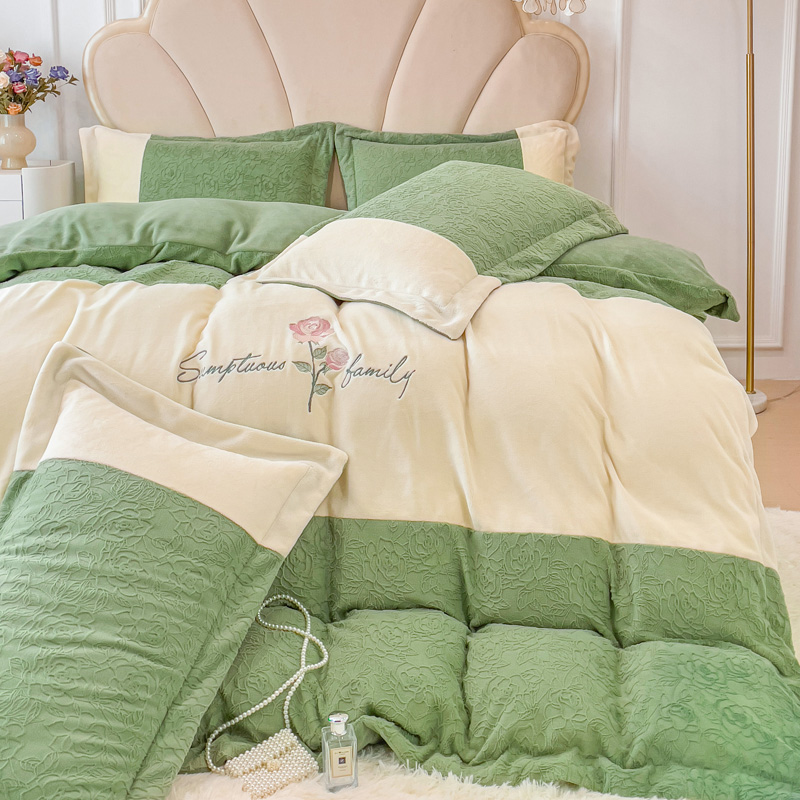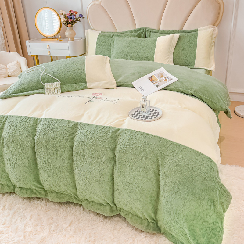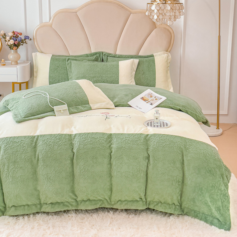 宜家坊 2023新款A类牛奶绒雕花拼接刺绣款四件套-假日玫瑰 山茶绿