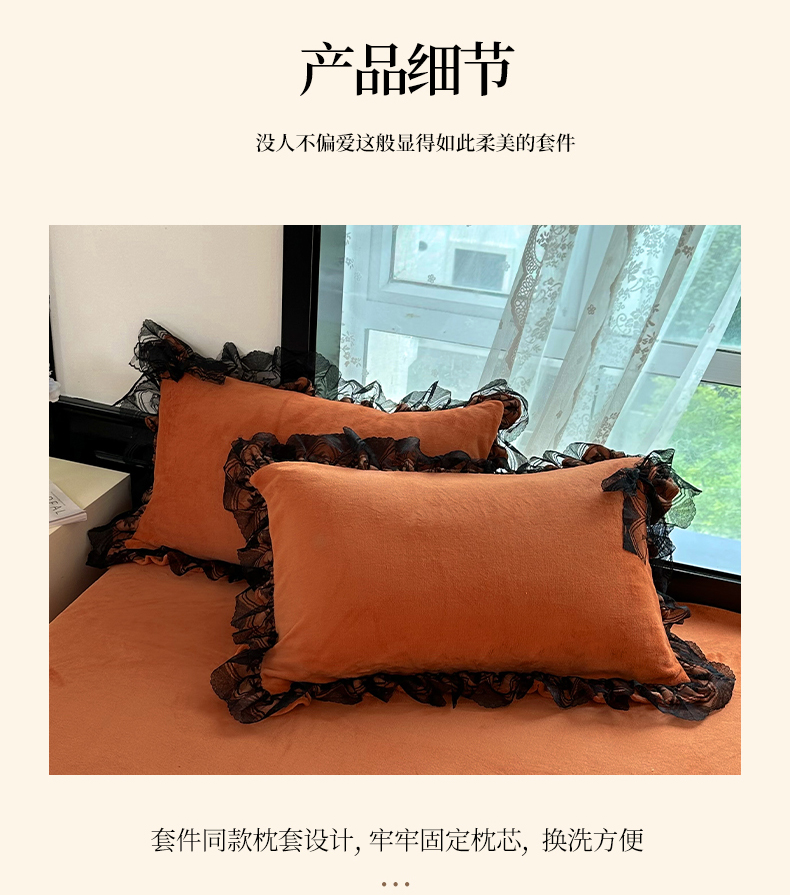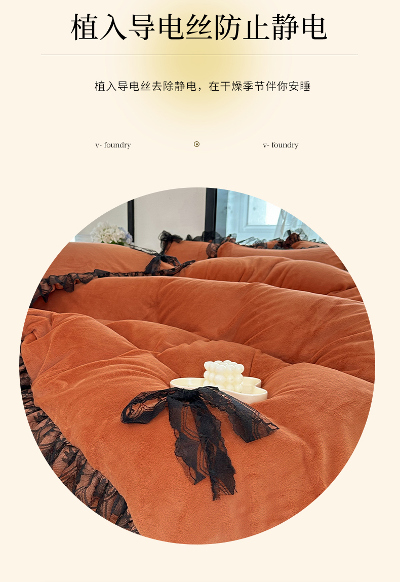 商品名称:言熙居 2024新款直播爆款8.5斤法莱绒牛奶绒纯色韩版小清新蕾丝四件套 蕾丝款-深桔