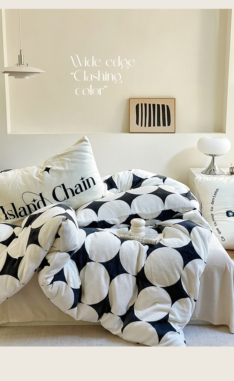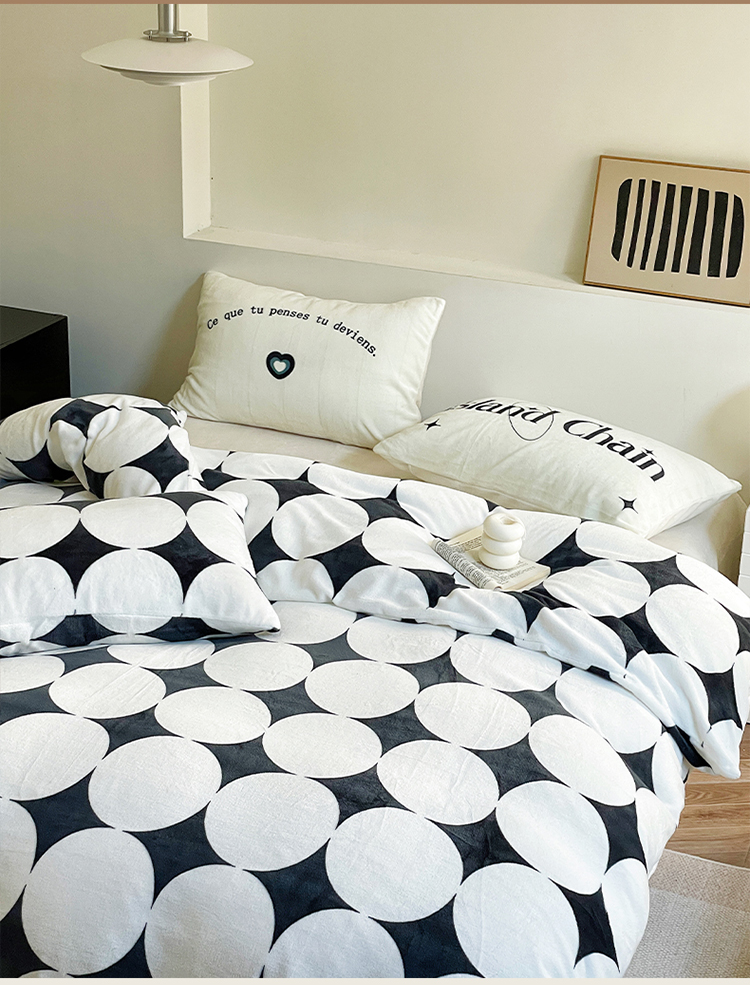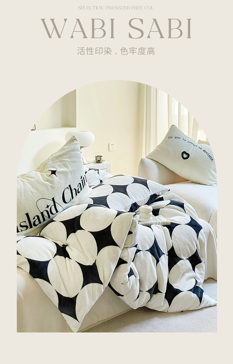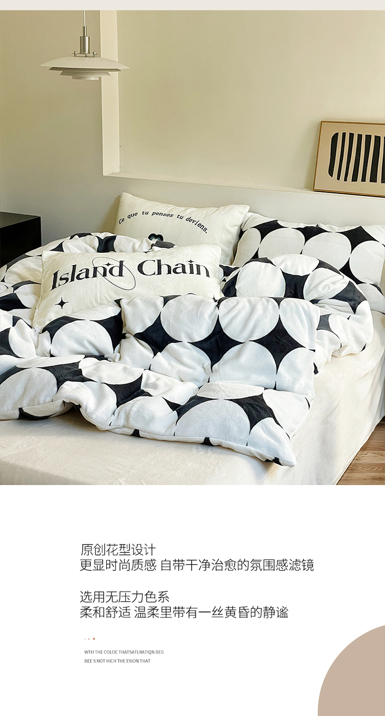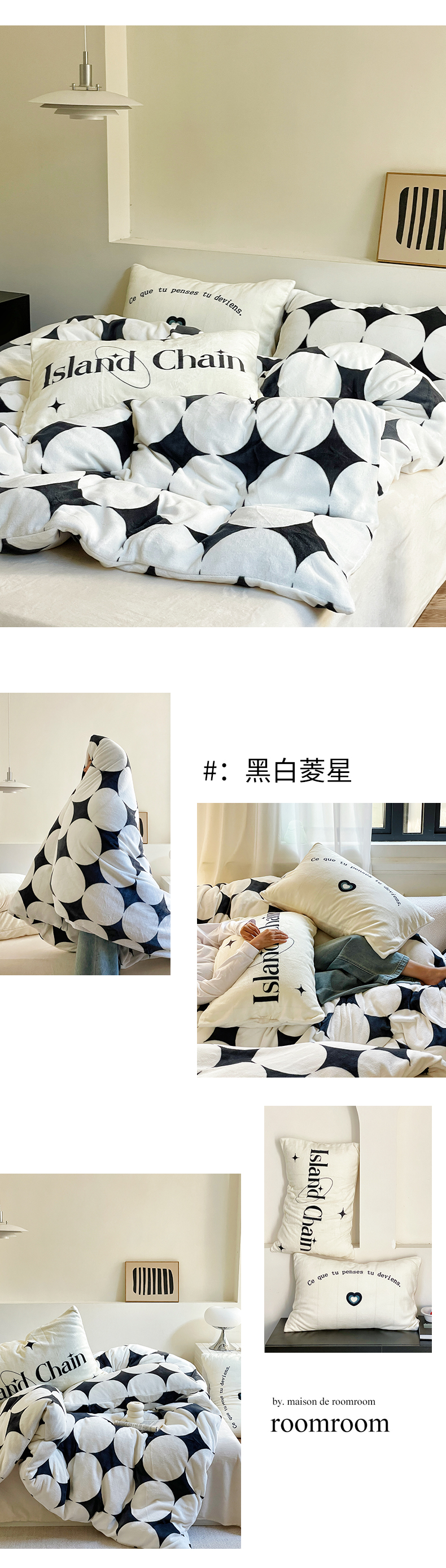 圆岛家纺 2023新款原创牛奶绒印花保暖四件套 黑白菱星