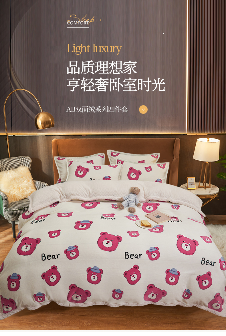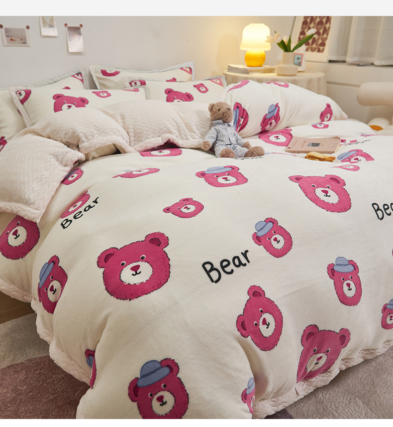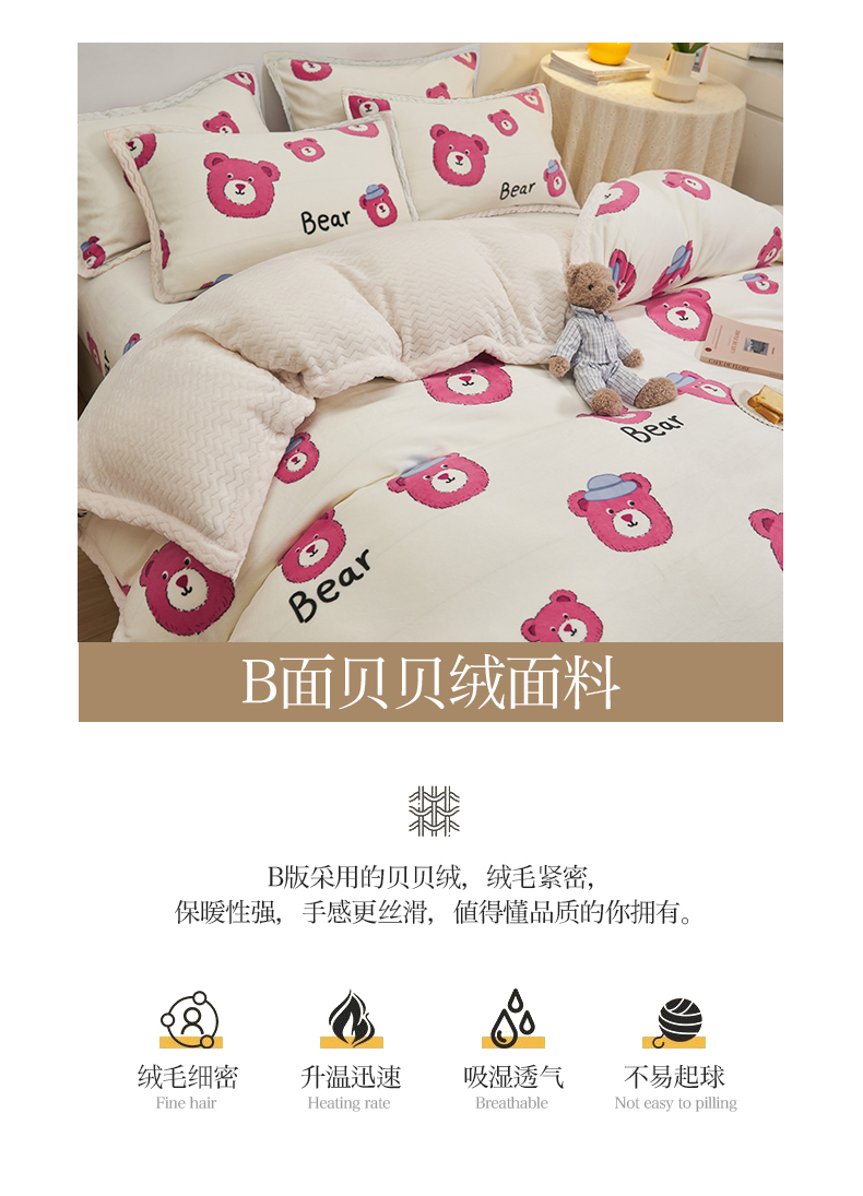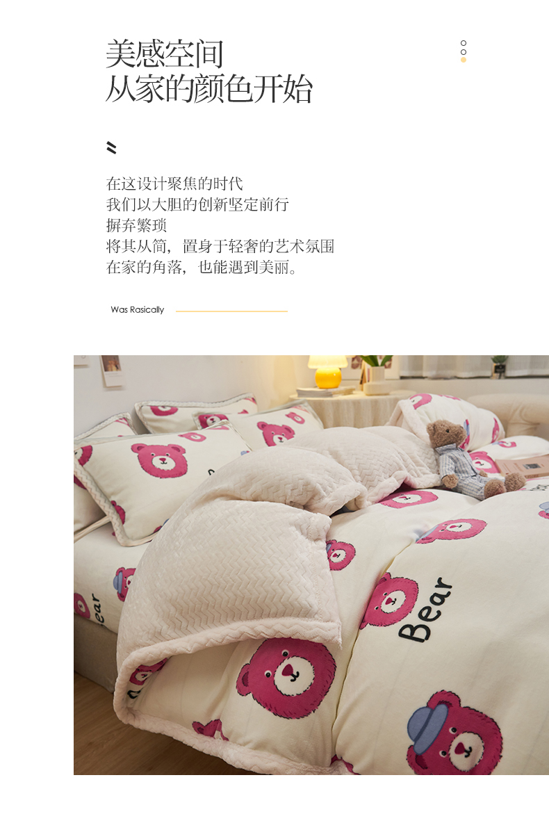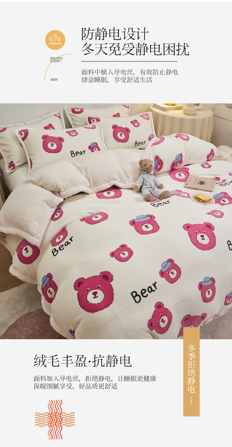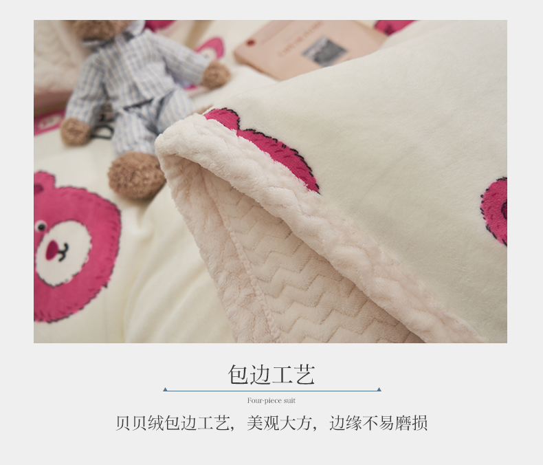 商品名称:全季家居2023新款纯色印花抗静电大包边牛奶绒贝贝绒四件套-印花 粉熊派