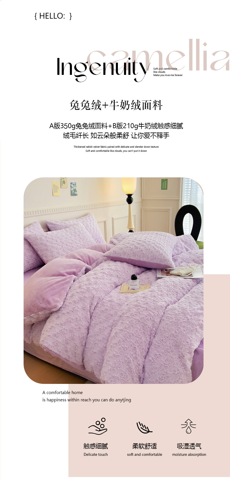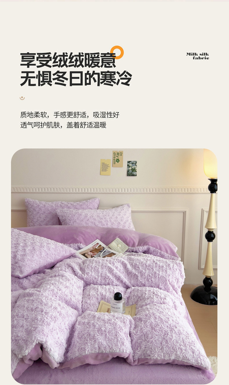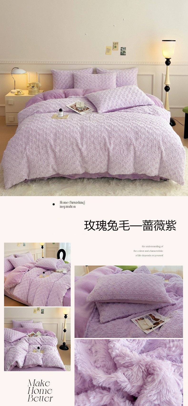 商品名称:宜家坊 2023新款立体玫瑰兔毛绒四件套 玫瑰兔毛-蔷薇紫