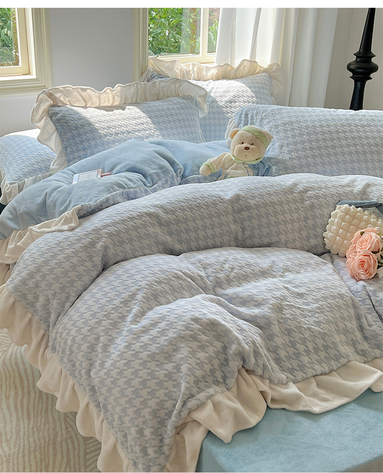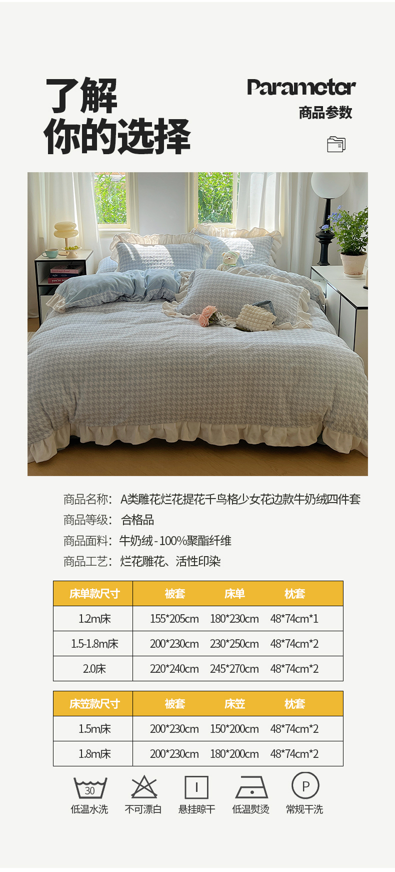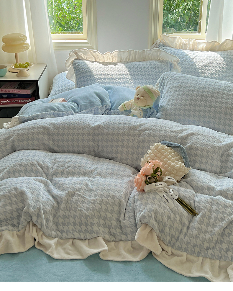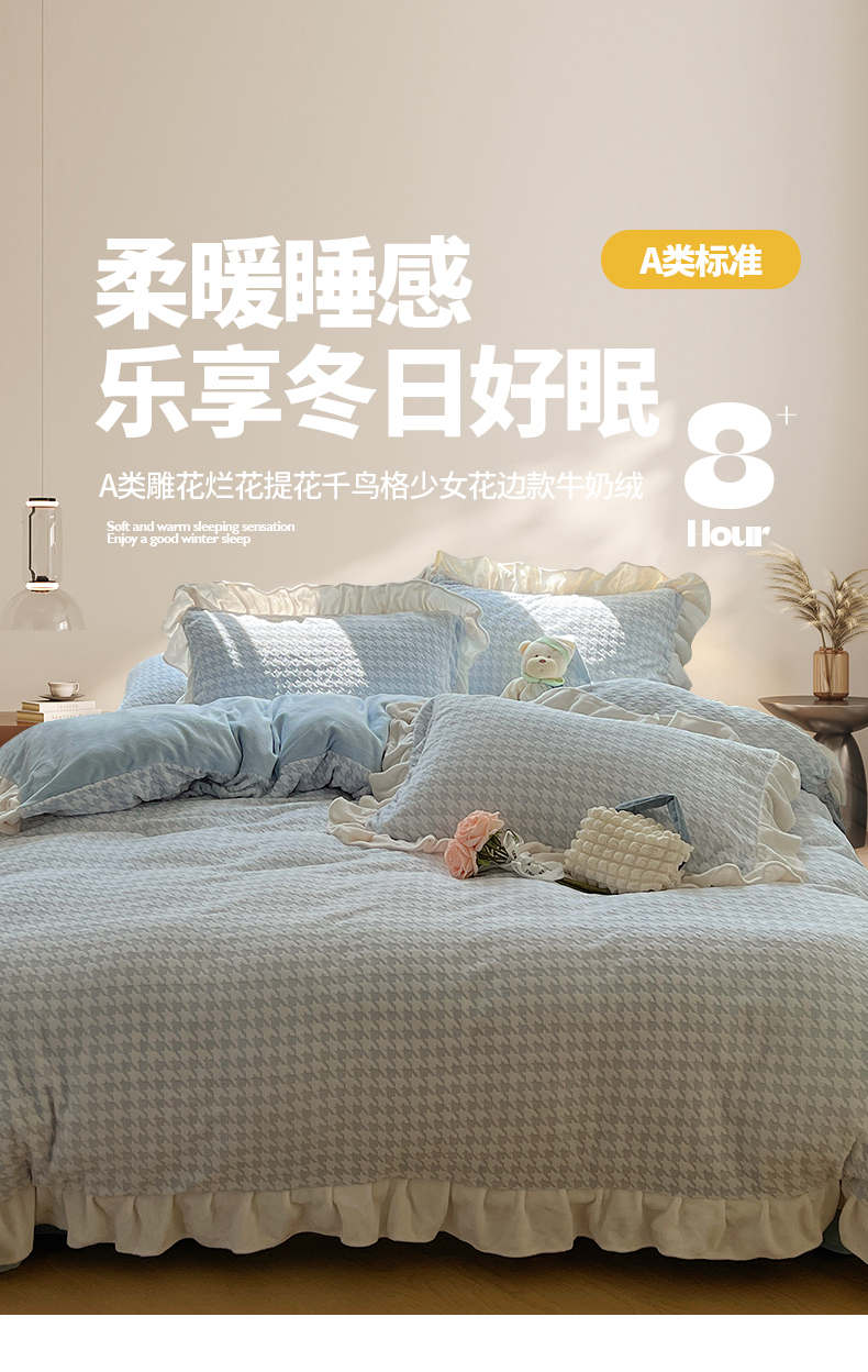 当前位置: 91家纺网 > 商品网购 > 床品套件 > 四件套 > 牛奶绒四件套 > 桃子家居 2023新款A类高克重230克3D立体雕花烂花提花千鸟格少女花边款简单款牛奶绒四件套 绒花边烂花-千鸟格天蓝