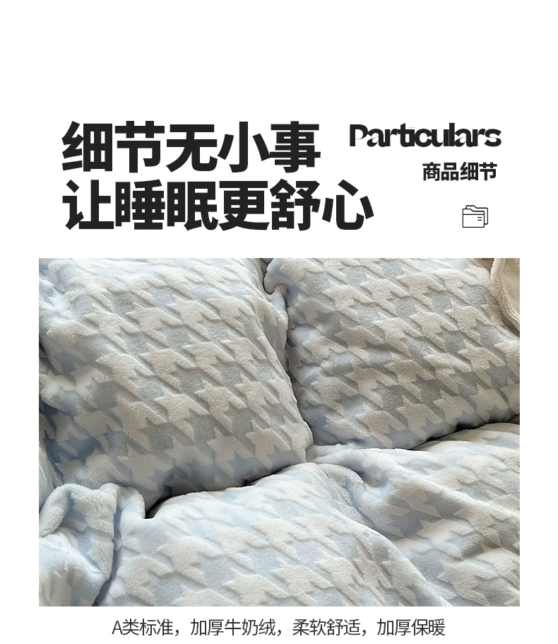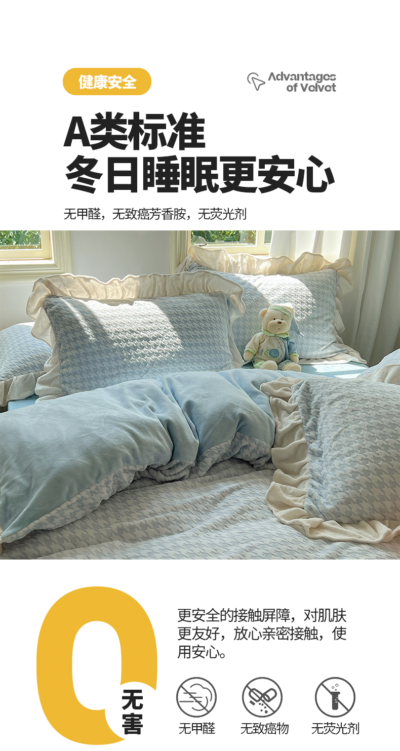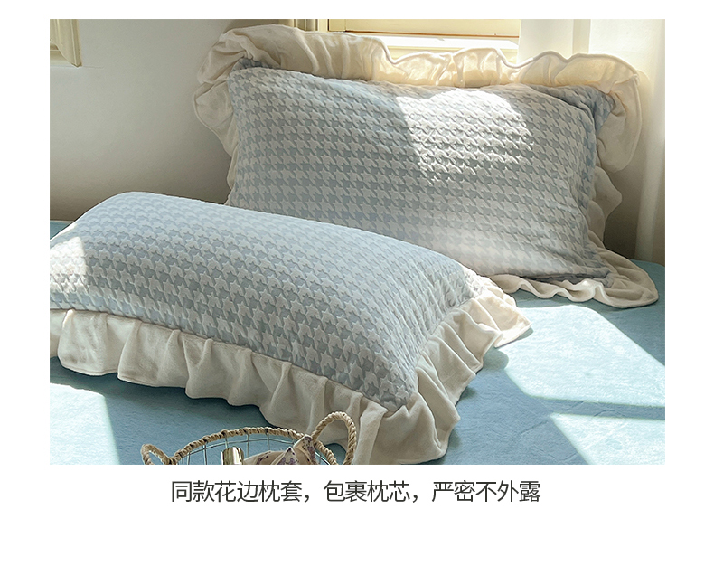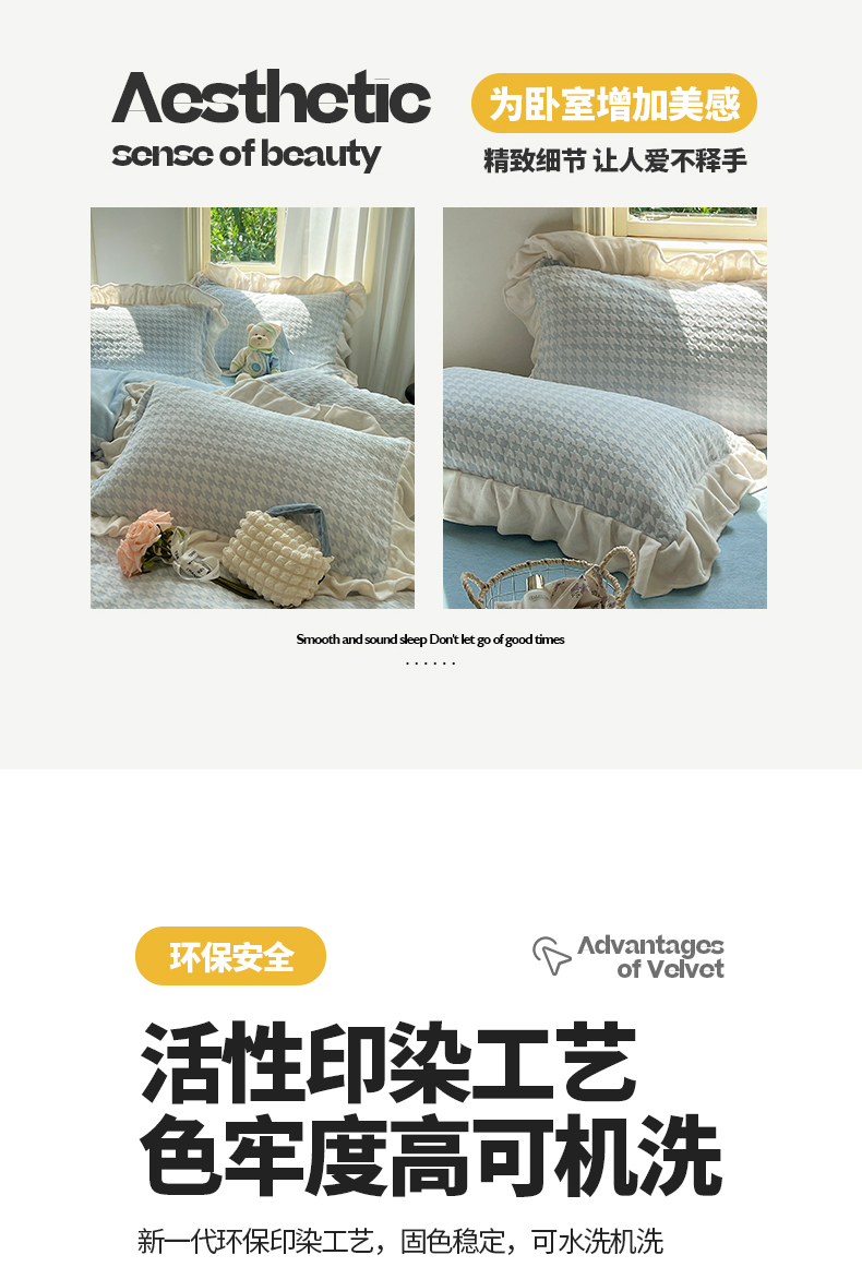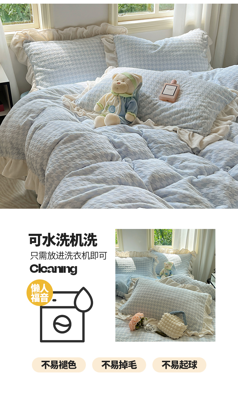 当前位置: 91家纺网 > 商品网购 > 床品套件 > 四件套 > 牛奶绒四件套 > 桃子家居 2023新款A类高克重230克3D立体雕花烂花提花千鸟格少女花边款简单款牛奶绒四件套 绒花边烂花-千鸟格天蓝