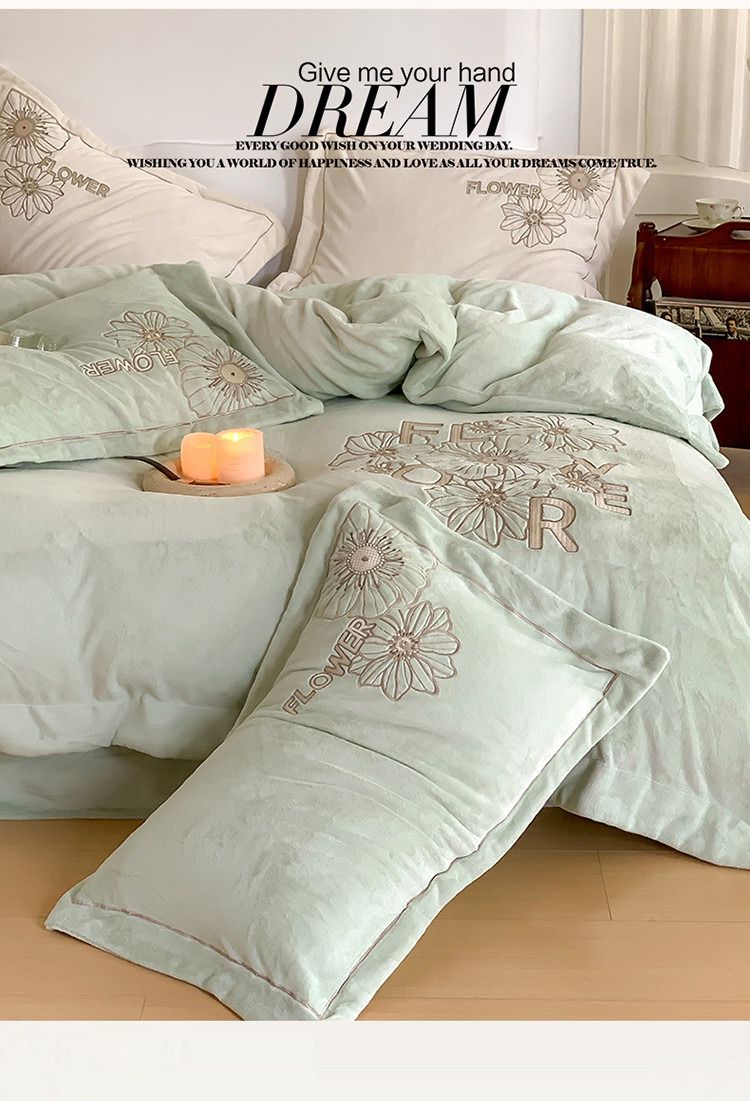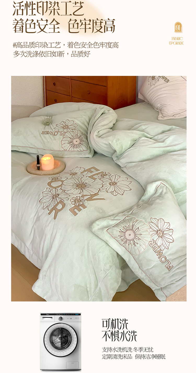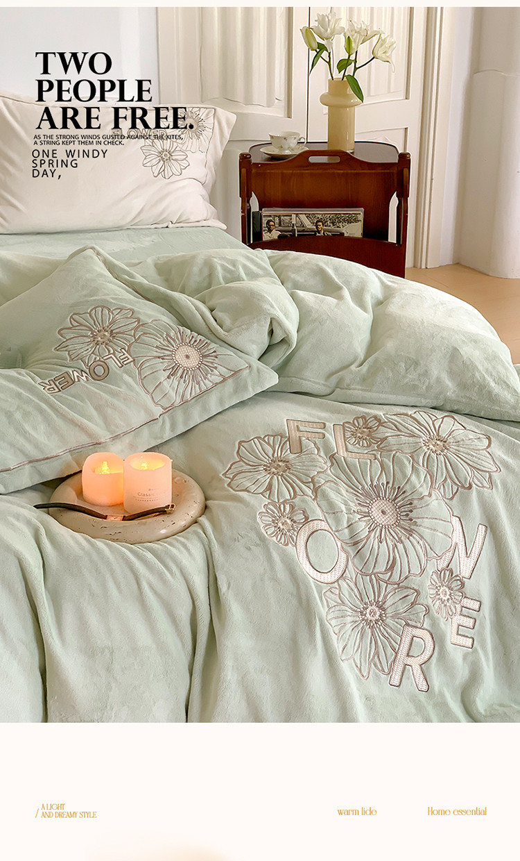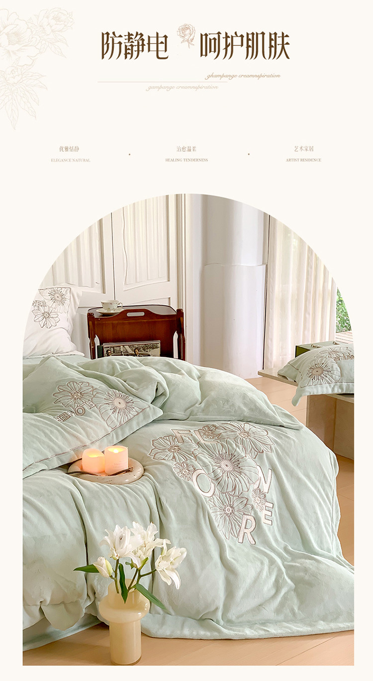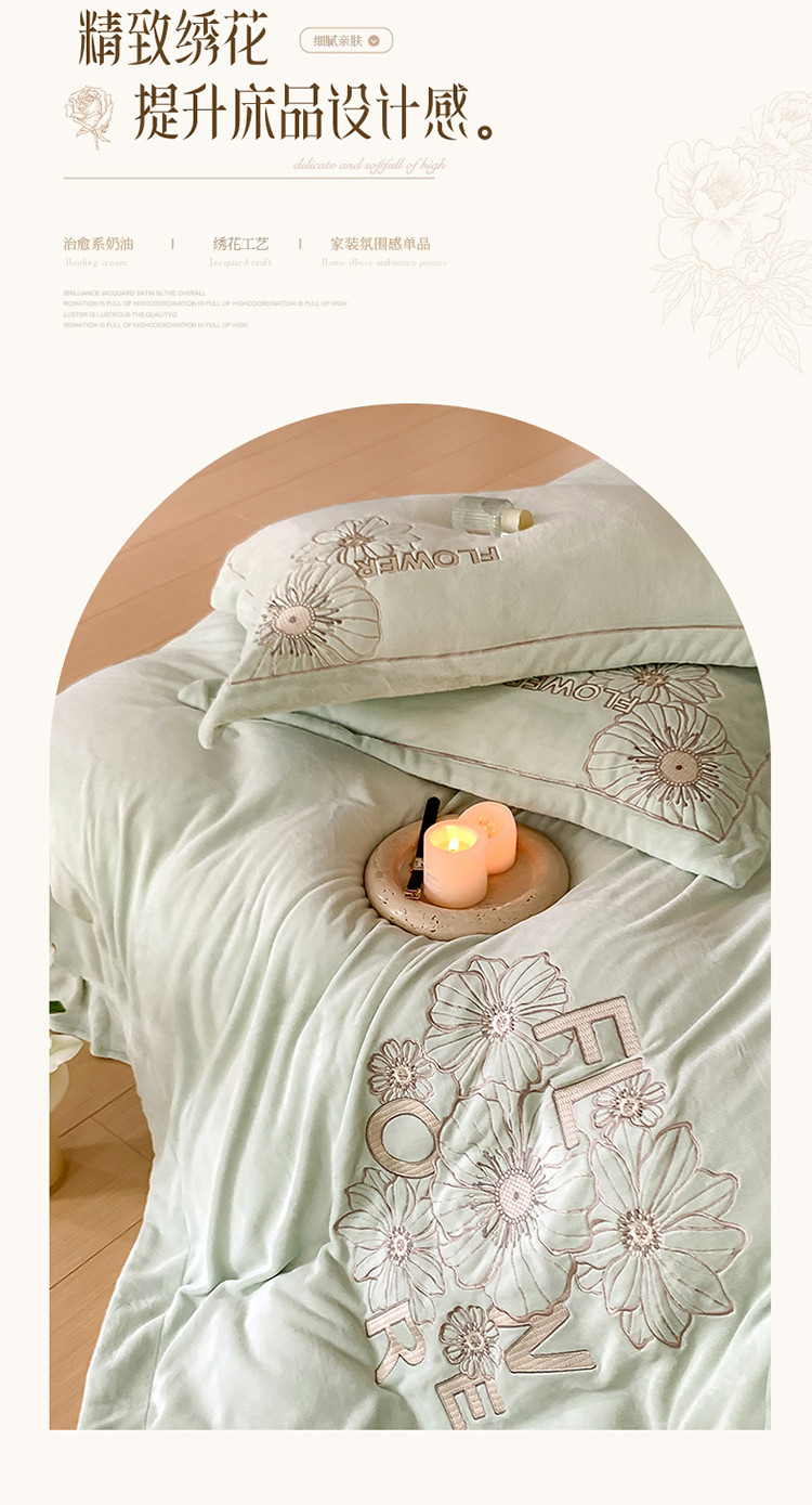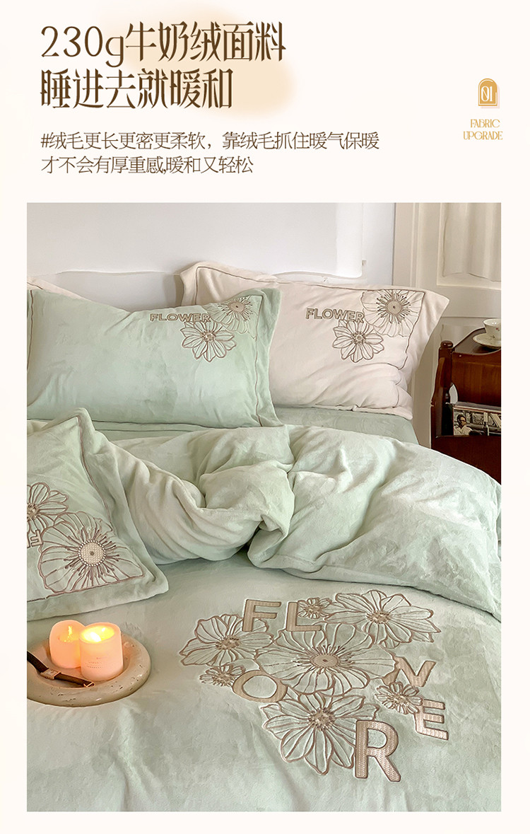 名品优仓 2023新款高克重230克牛奶绒绣花款四件套-伊莲娜 伊莲娜-新芽绿