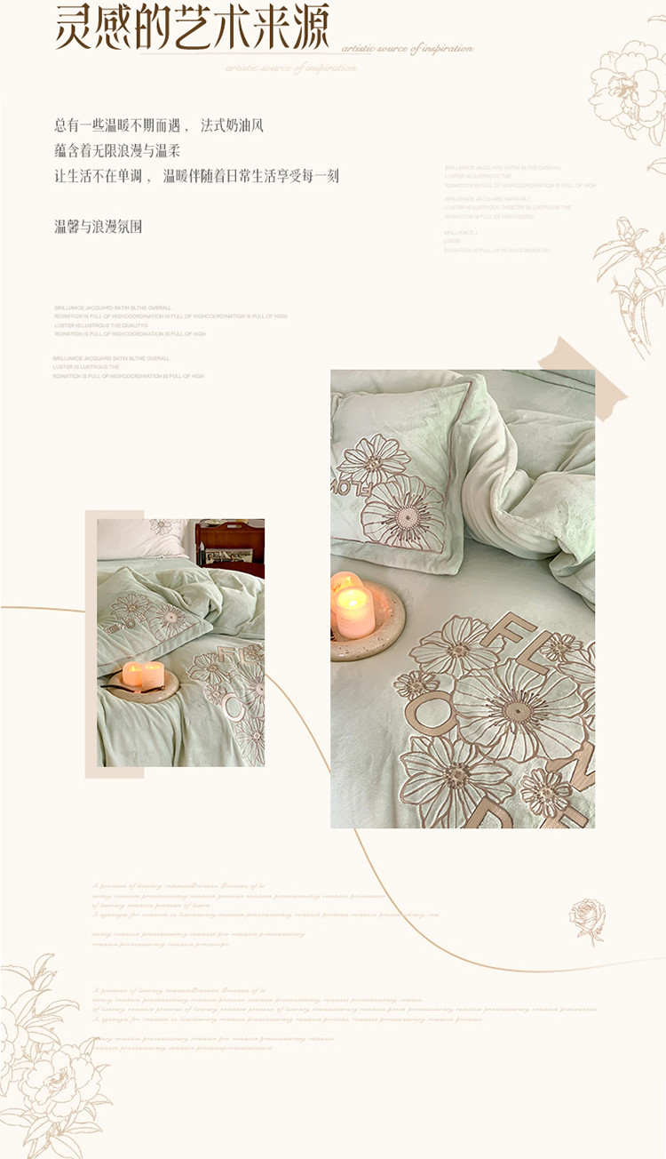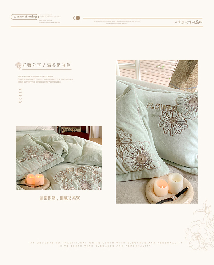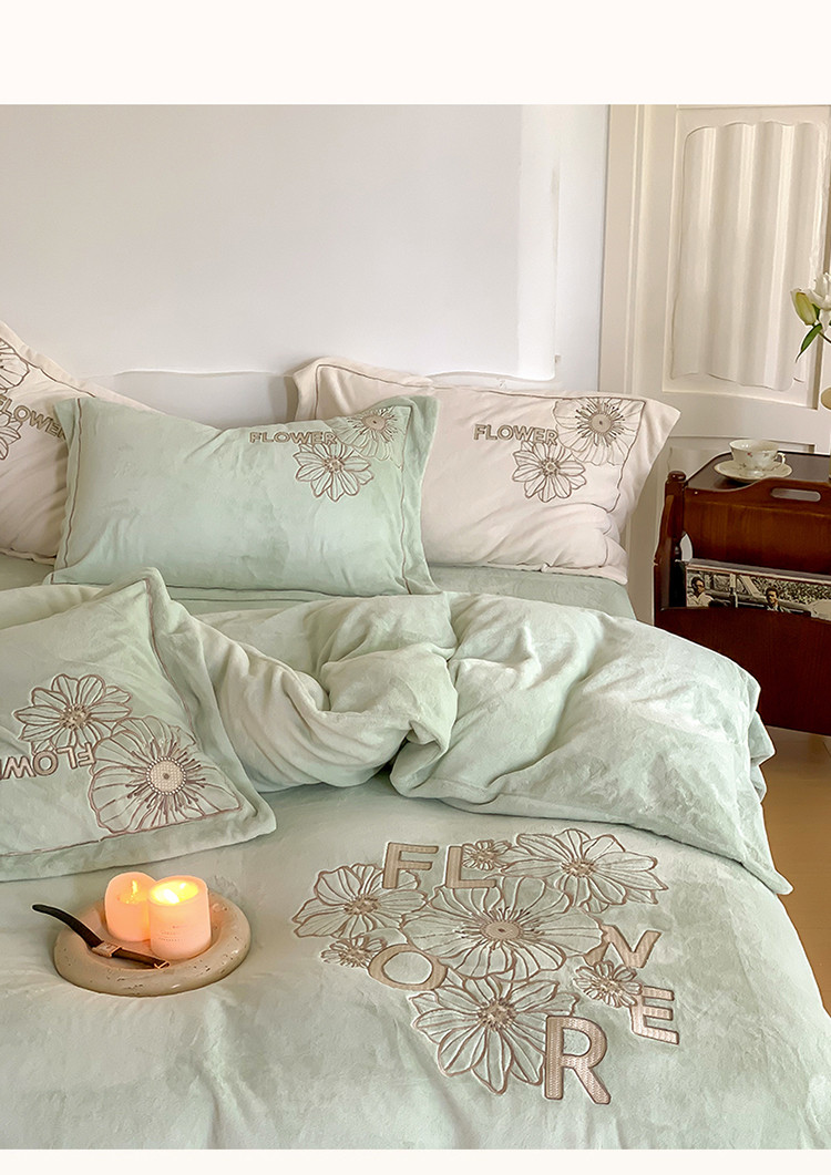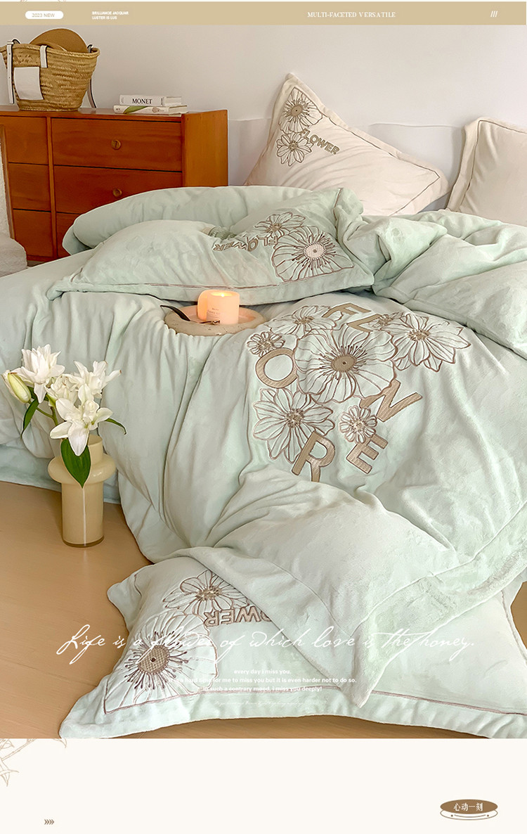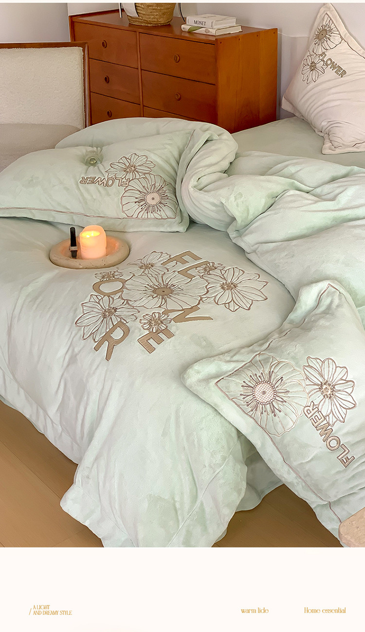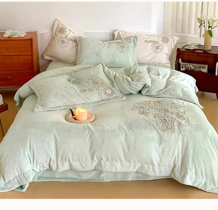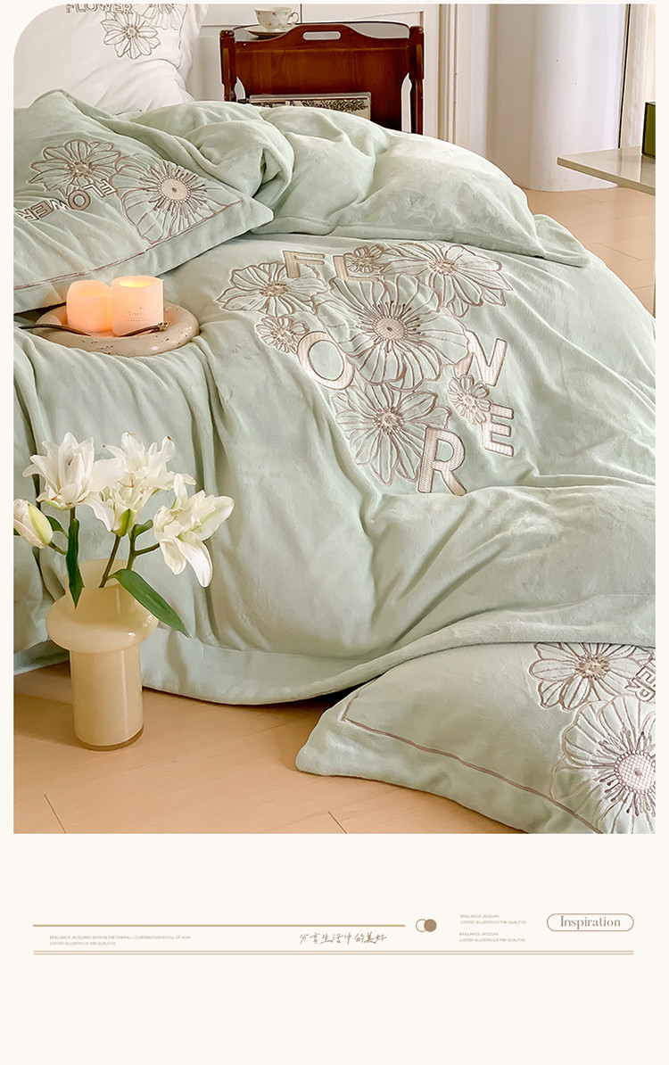 名品优仓 2023新款高克重230克牛奶绒绣花款四件套-伊莲娜 伊莲娜-新芽绿