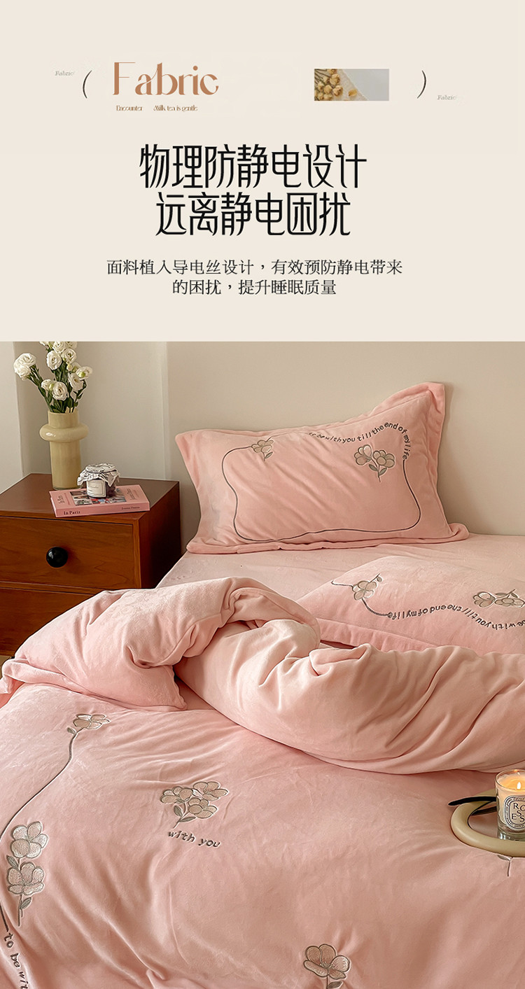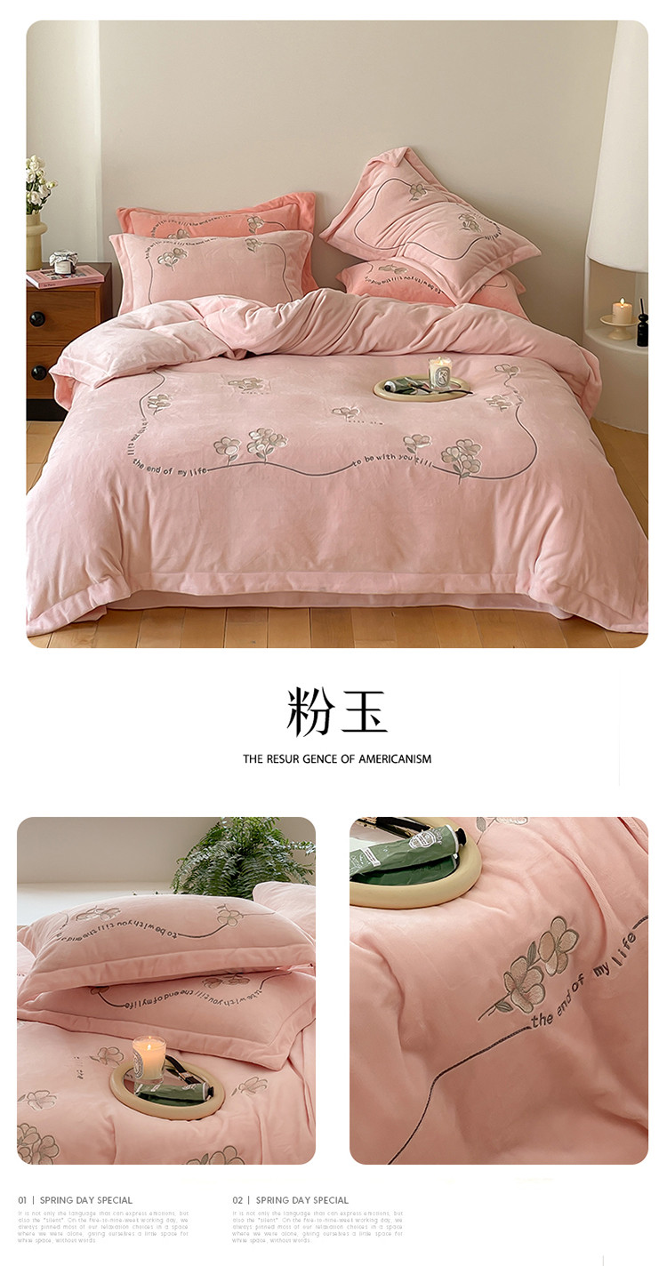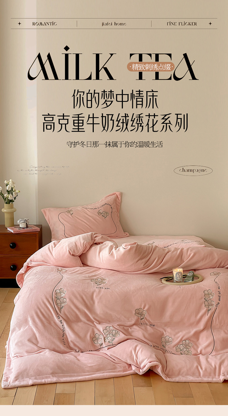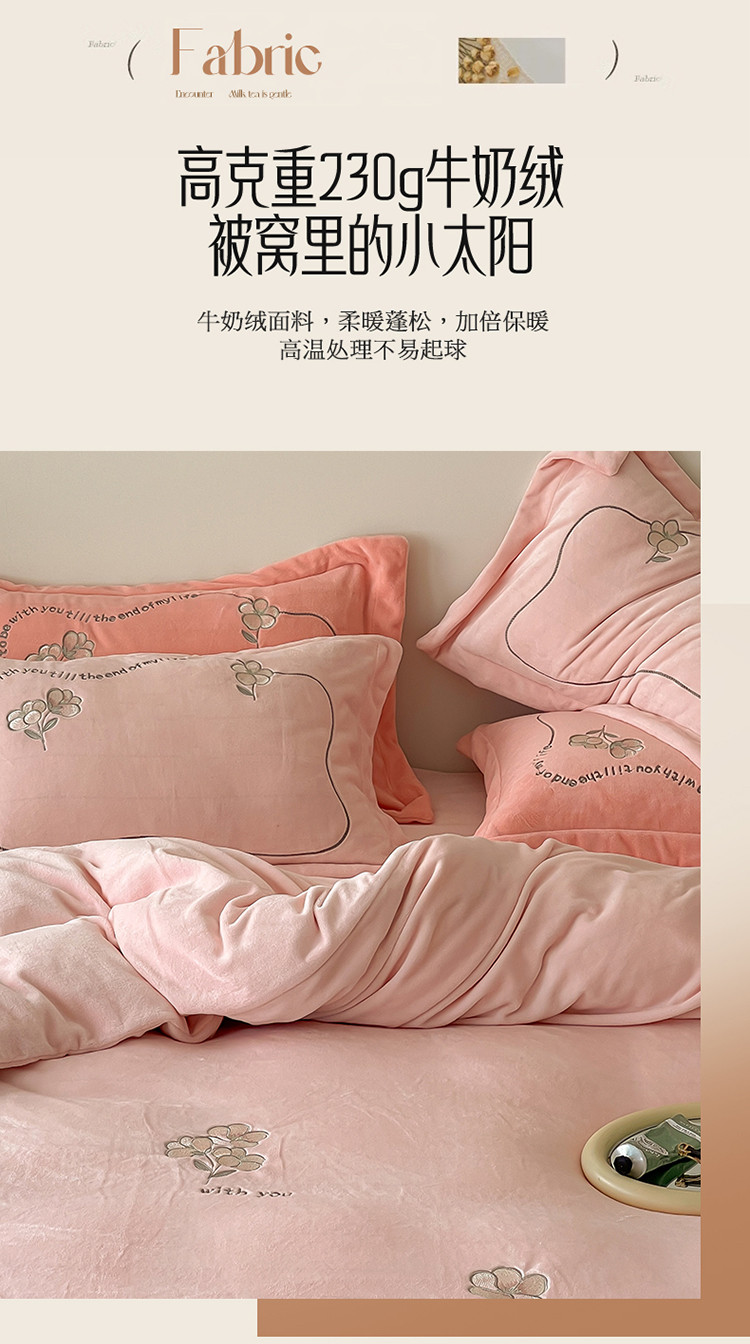 名品优仓 2023新款高克重230克牛奶绒绣花款四件套-小时光 小时光-粉玉