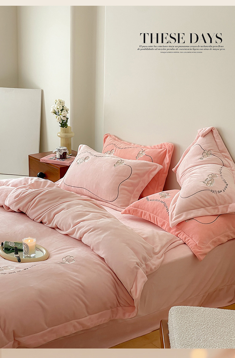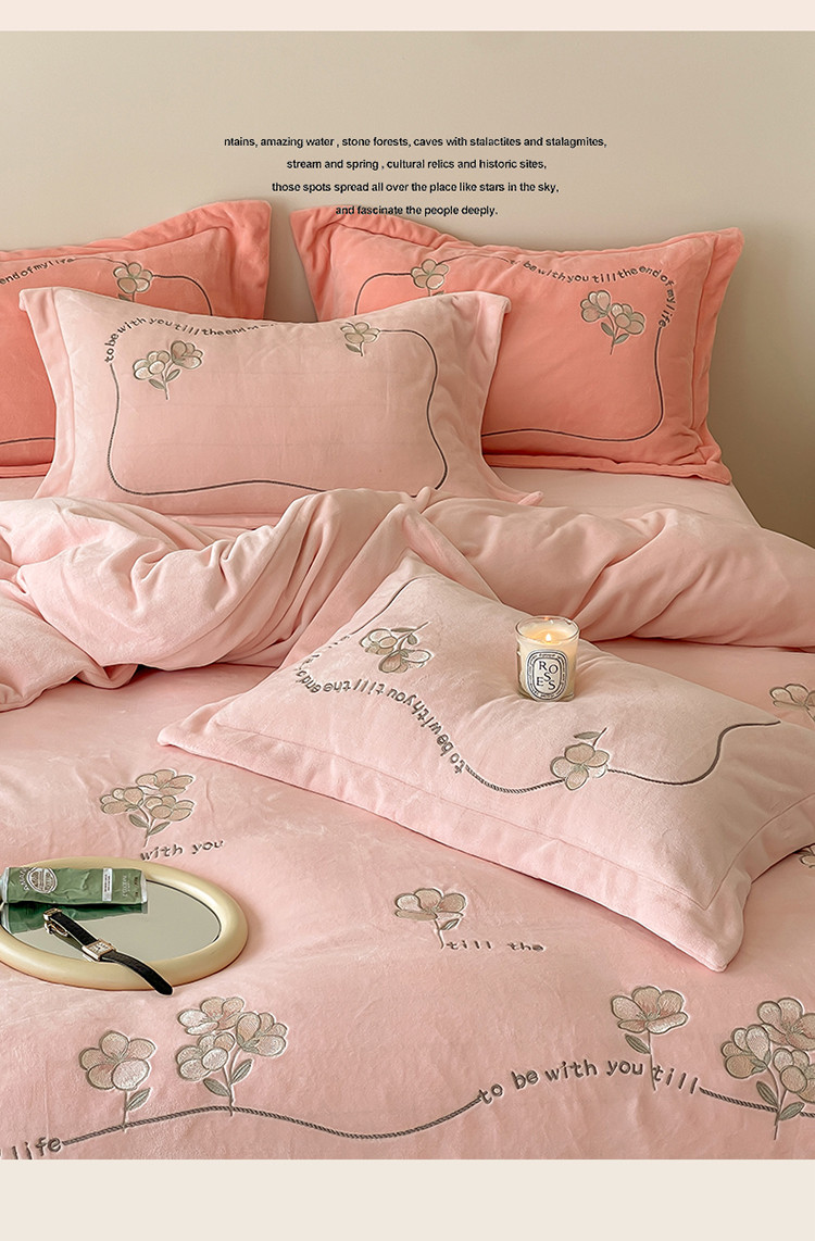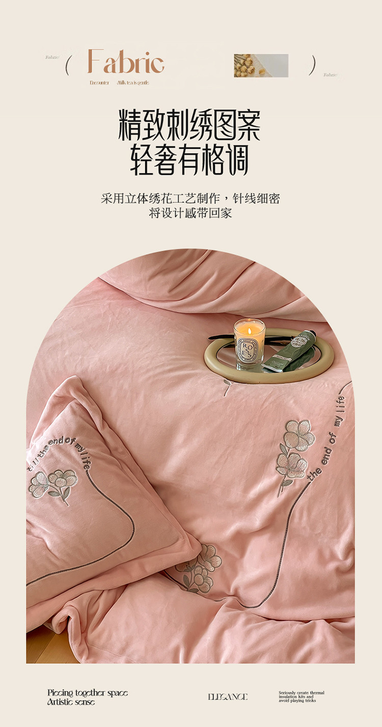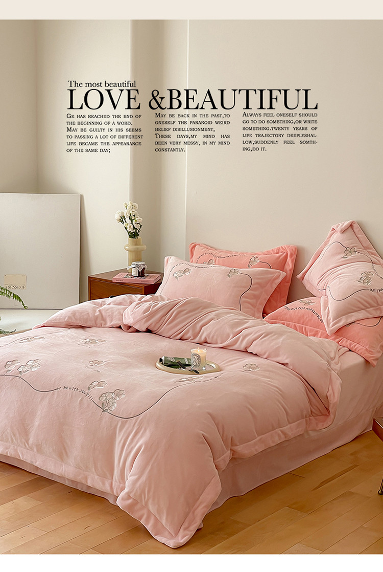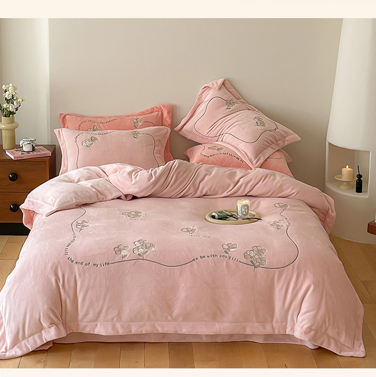 名品优仓 2023新款高克重230克牛奶绒绣花款四件套-小时光 小时光-粉玉
