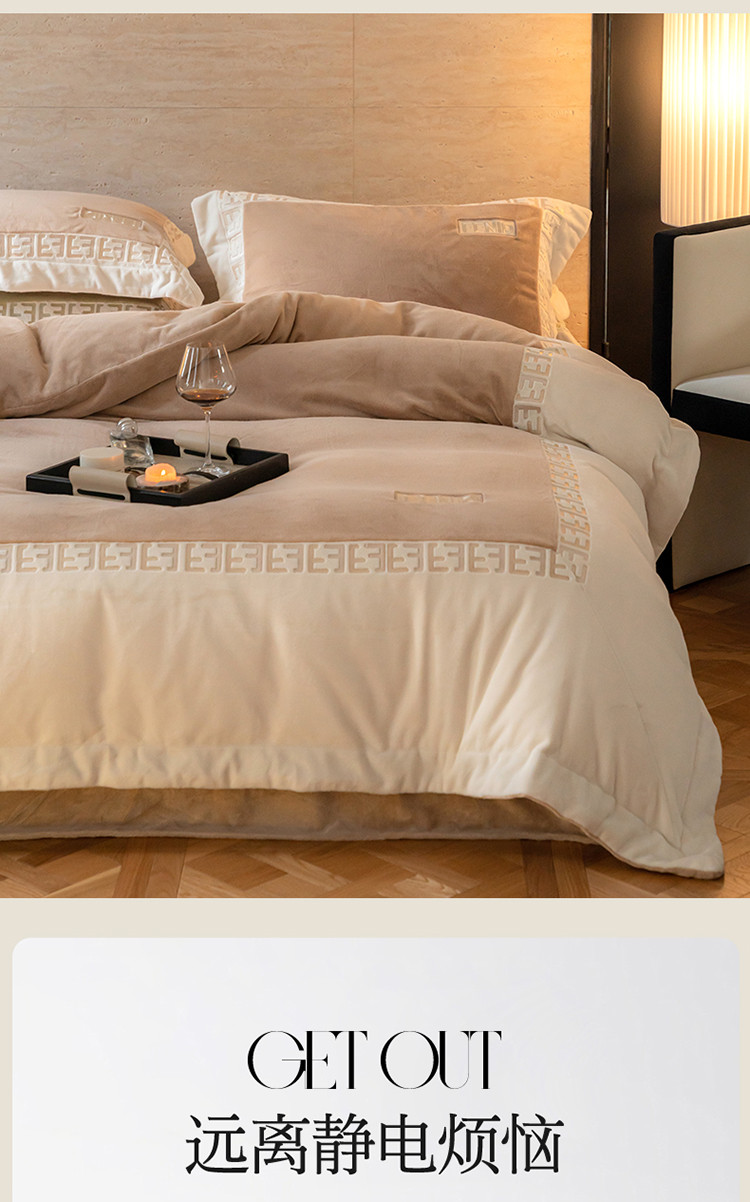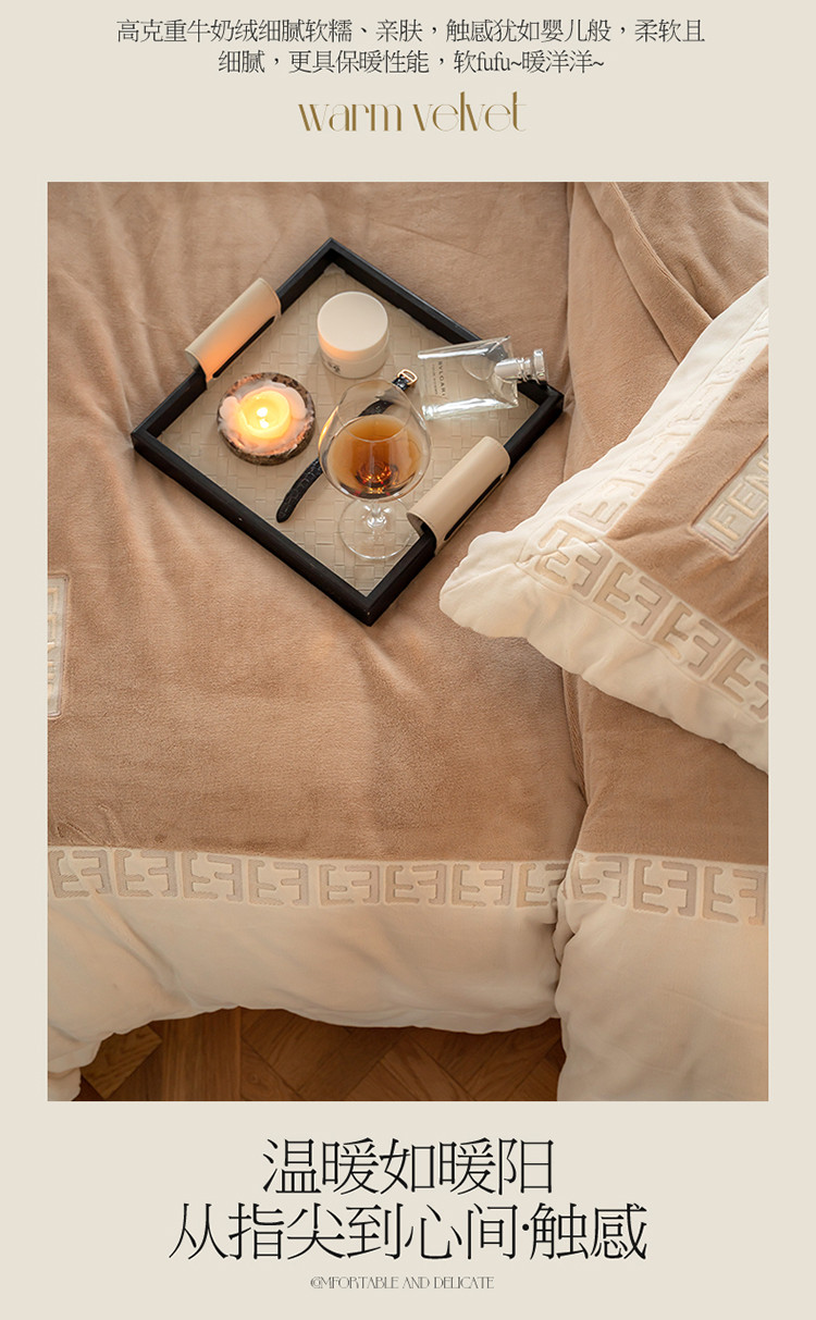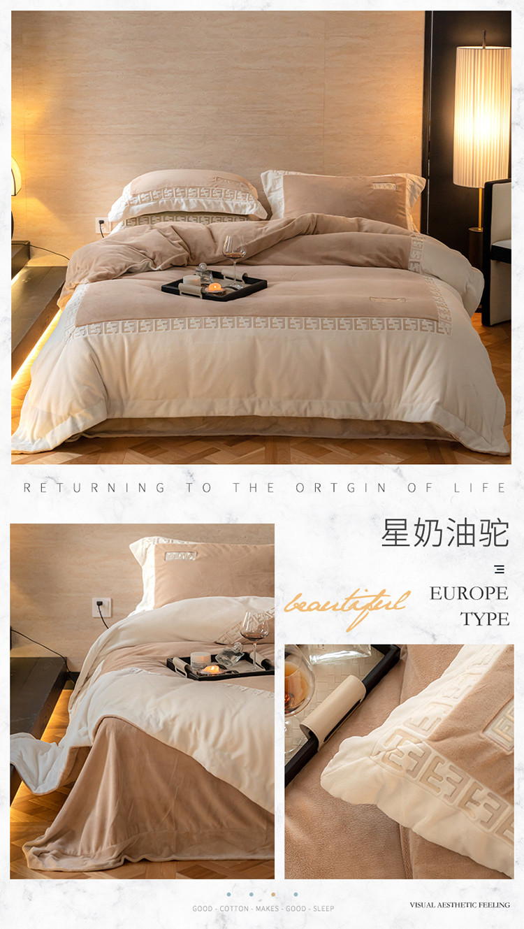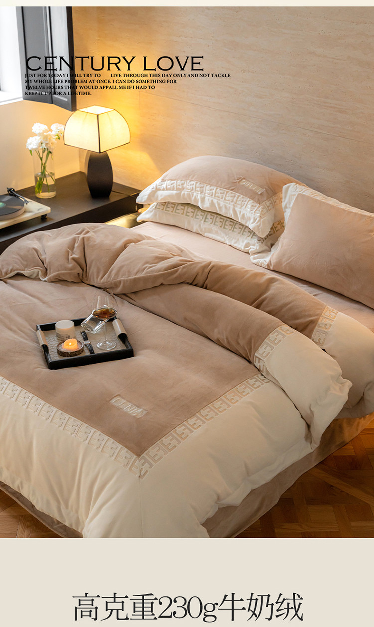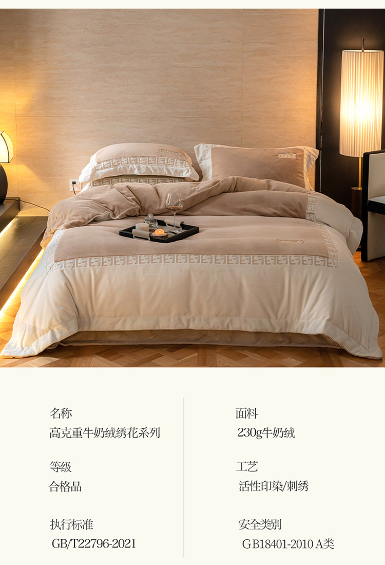 名品优仓 2023新款高克重230克牛奶绒绣花款四件套-玛丽 玛丽-星奶油驼