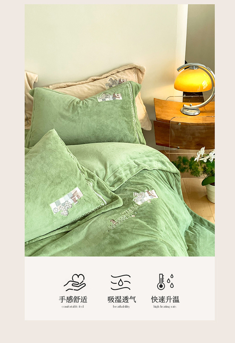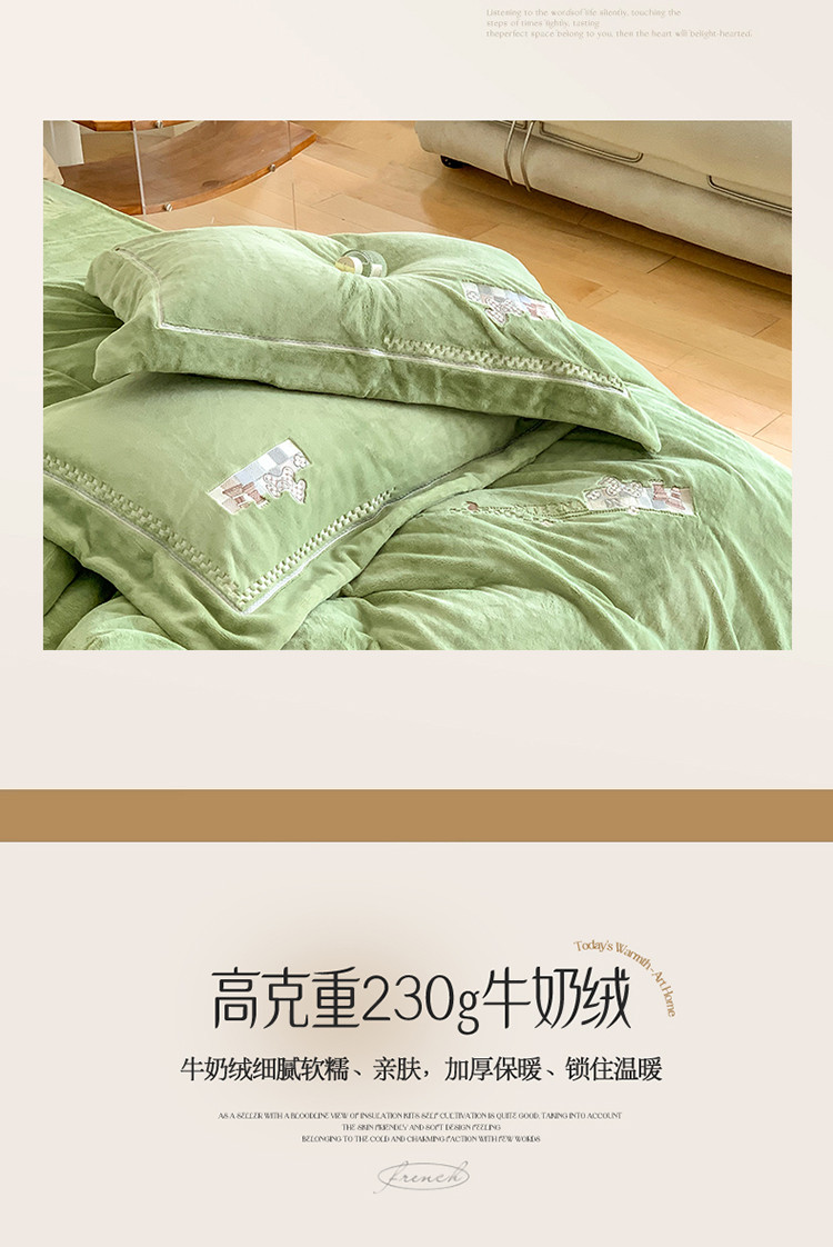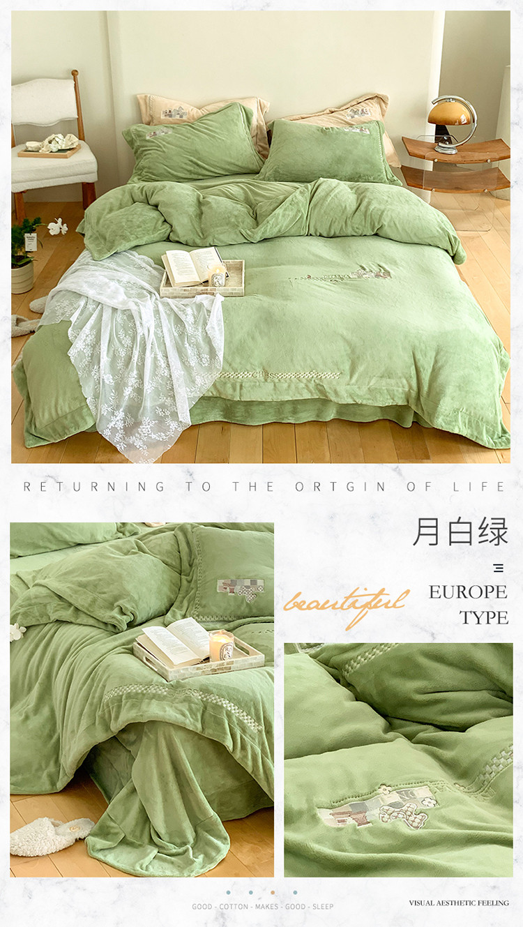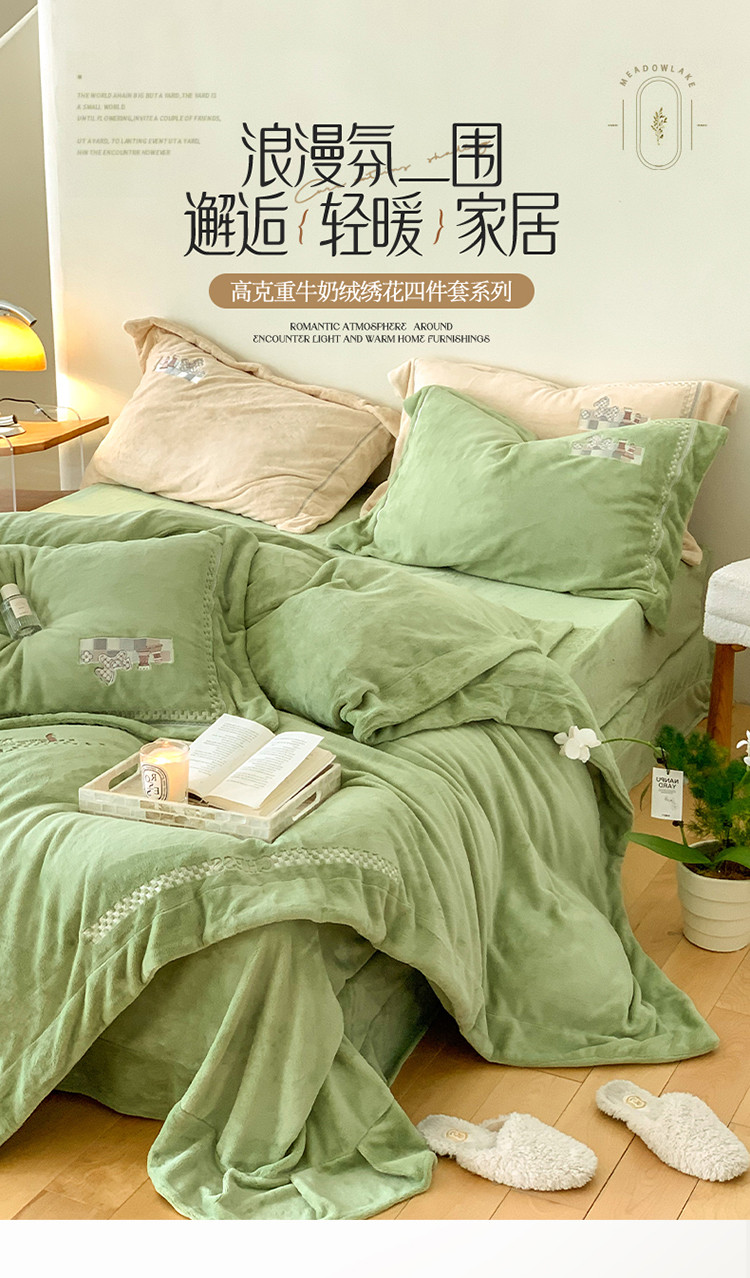 名品优仓 2023新款高克重230克牛奶绒绣花款四件套-极简 极简-月白绿