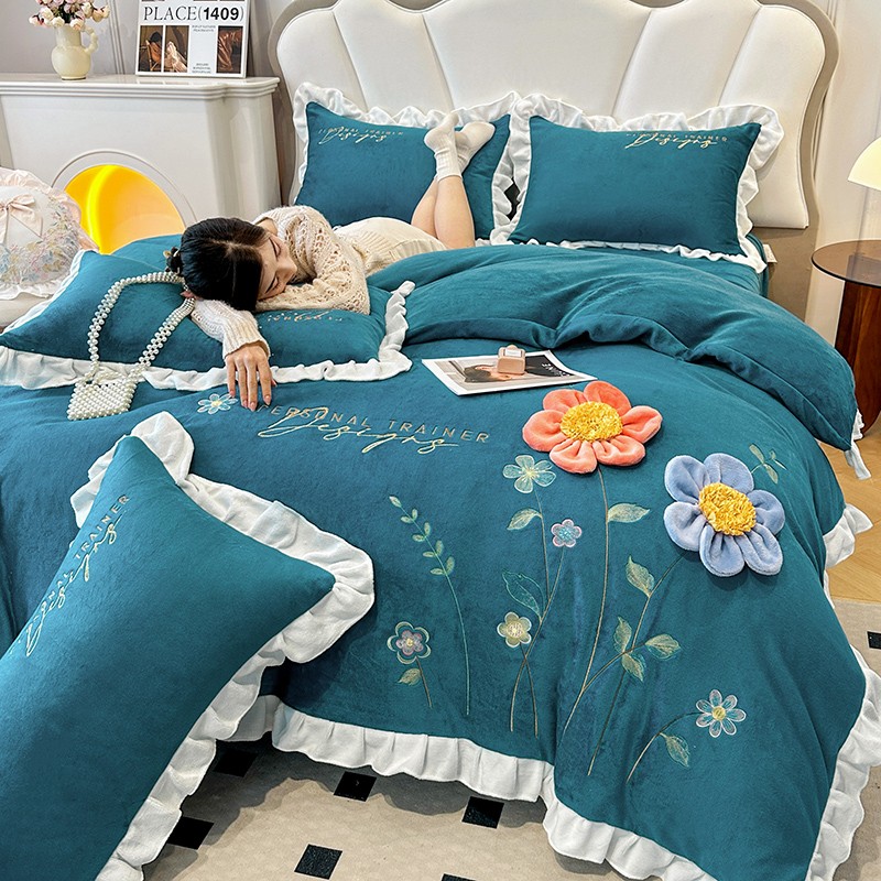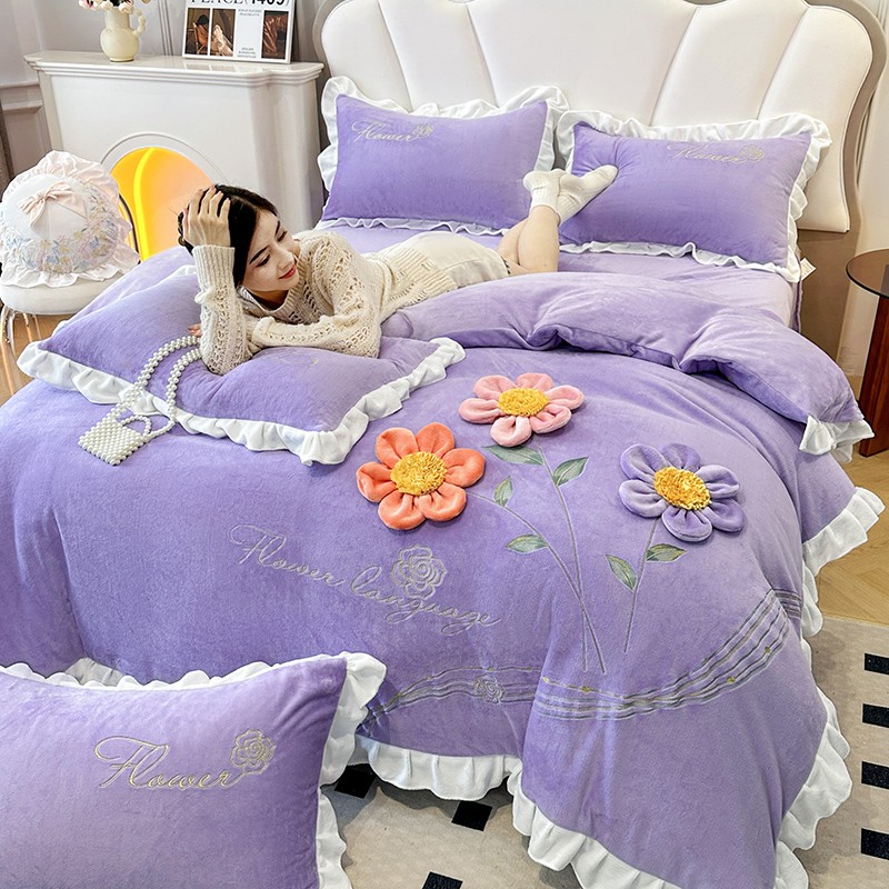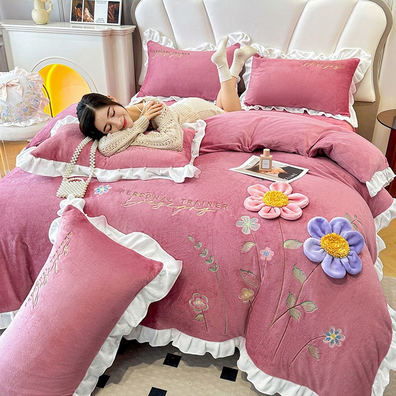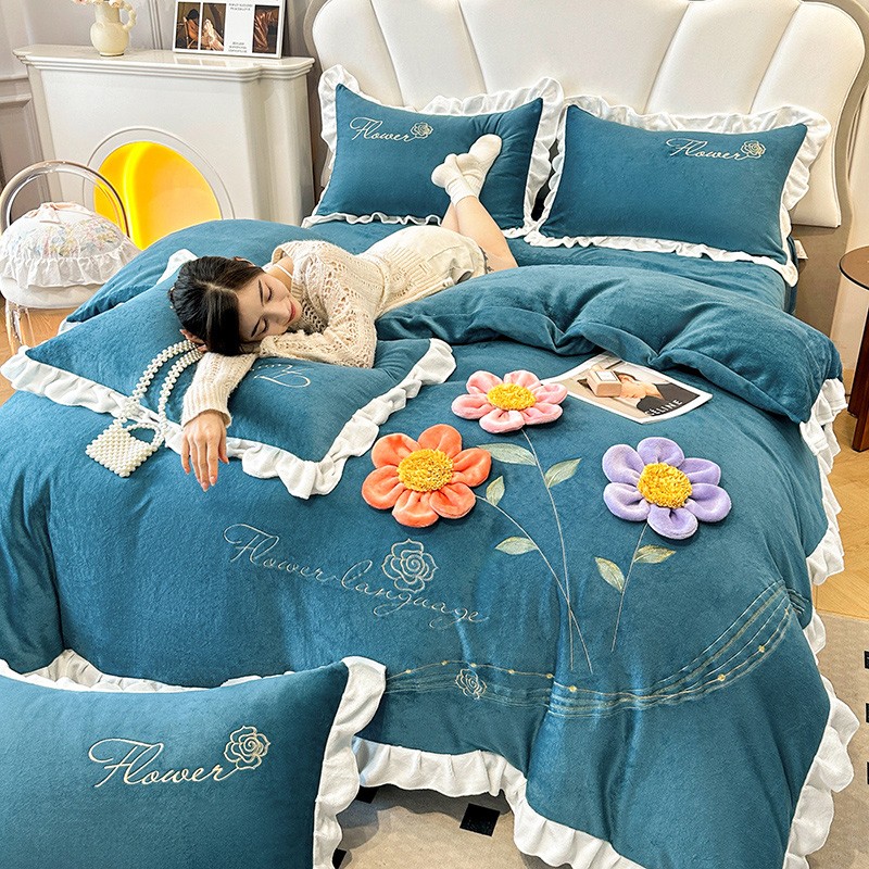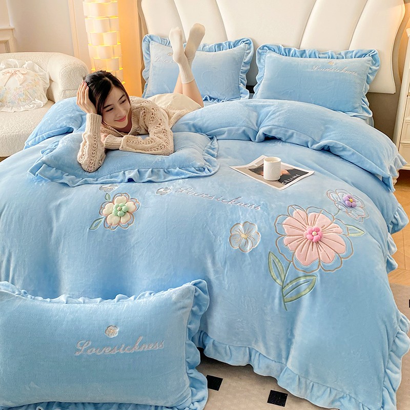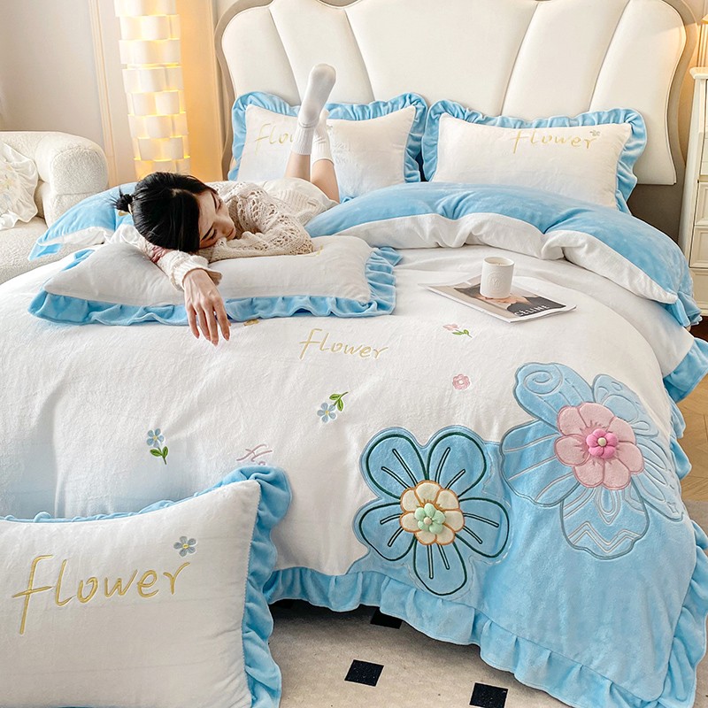 (总)漫布云 2025新款230g高克重韩版立体盘花牛奶蚕丝绒绣花四件套床裙款被套-洛丽塔系列,洛丽塔-嫩黄 ,洛丽塔-香芋紫,洛丽塔-珍珠粉, 洛丽塔-婴儿蓝