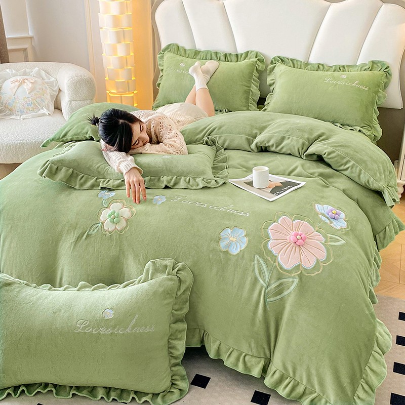 漫布云2025秋冬新款11斤230g全消光牛奶绒夹棉床盖款四件套纯色蕾丝花边刺绣床裙款床盖,蝶恋花-梦幻紫, 蝶恋花-嫩黄 ,蝶恋花-新芽绿, 蝶恋花-婴儿蓝, 蝶恋花-樱花粉