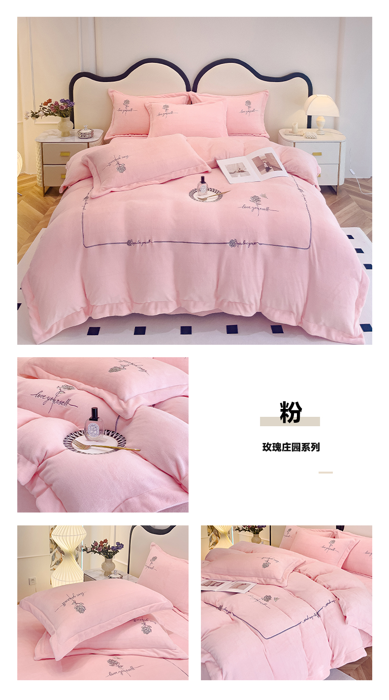 (总)宜家坊 2023新款A类牛奶绒雕花拼接刺绣款四件套-假日玫瑰,冰桃粉,迷雾蓝,奶芋白,山茶绿,香芋紫