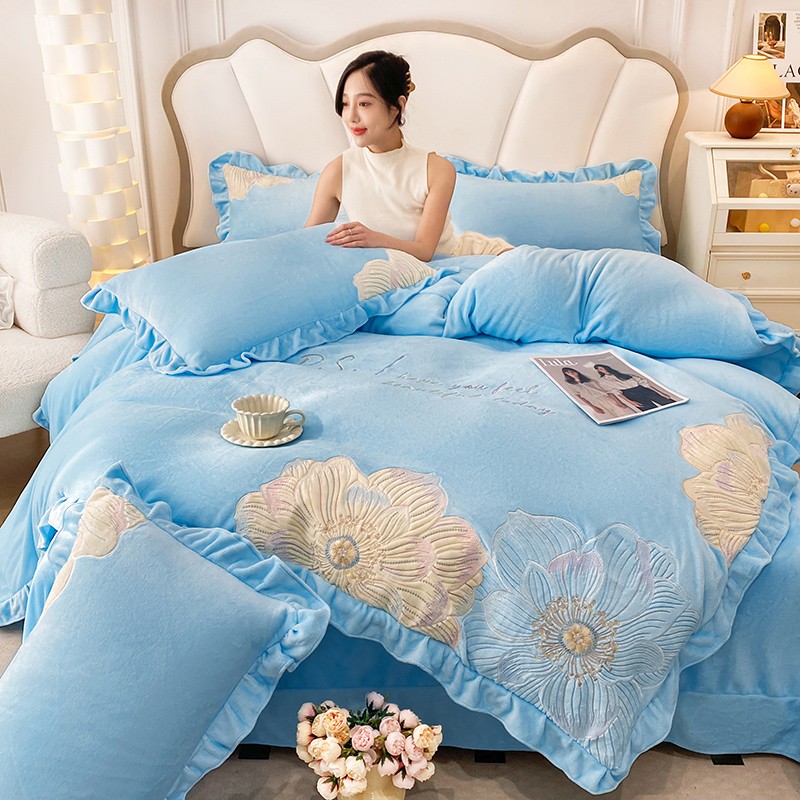 漫布云秋冬230g9.5斤全消光牛奶绒四件套法式公主风婴儿绒雪纺花边款