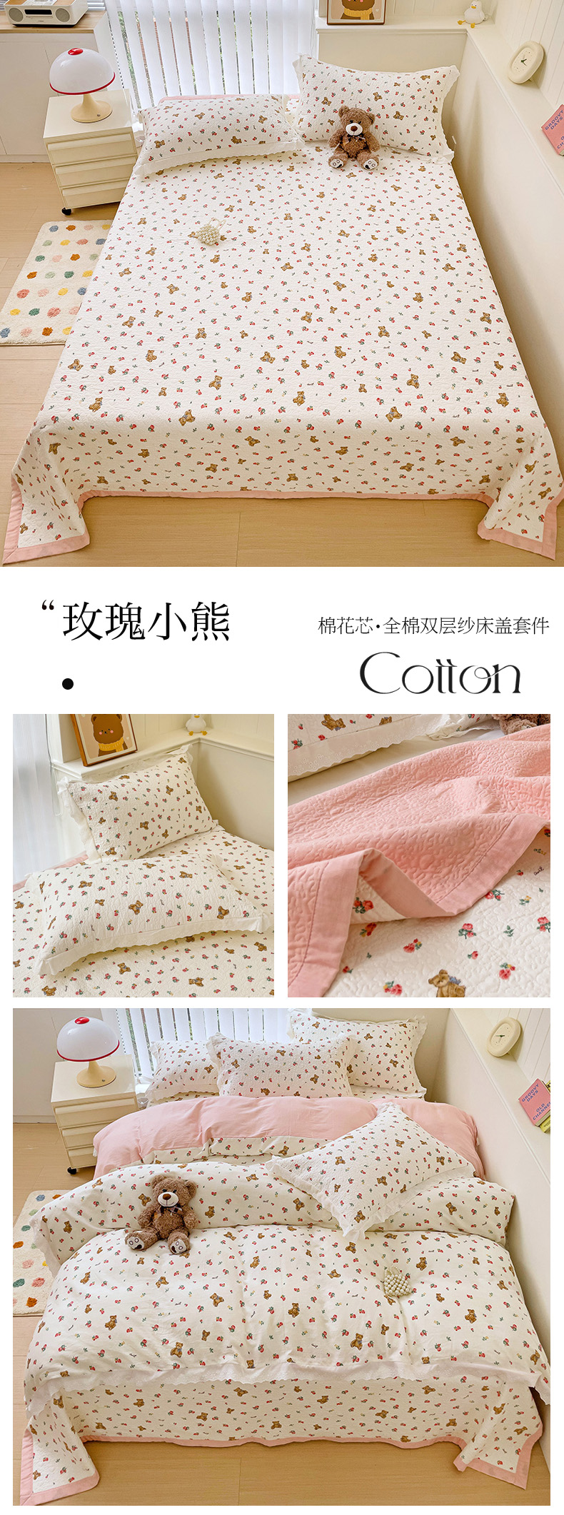 羽爱家纺 2024新款A类双层纱棉花芯床盖套件 玫瑰小熊