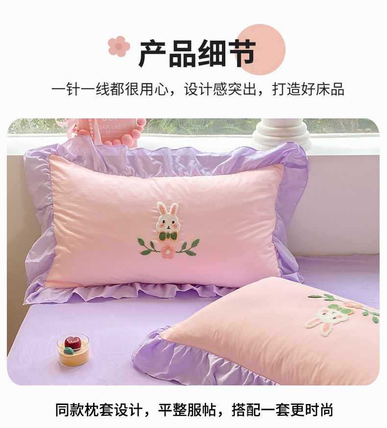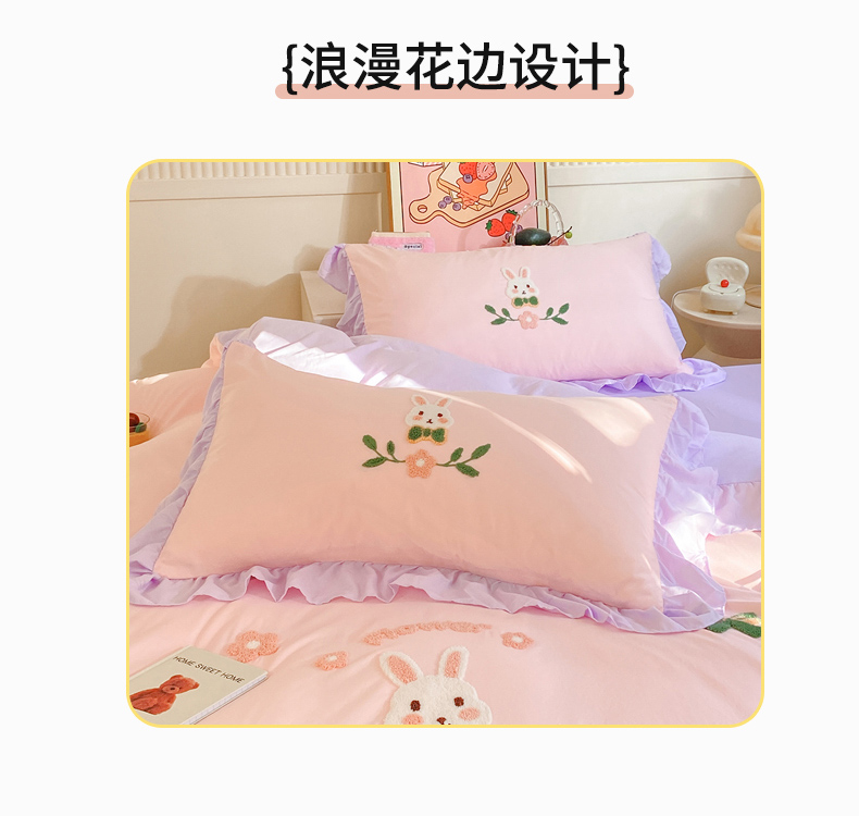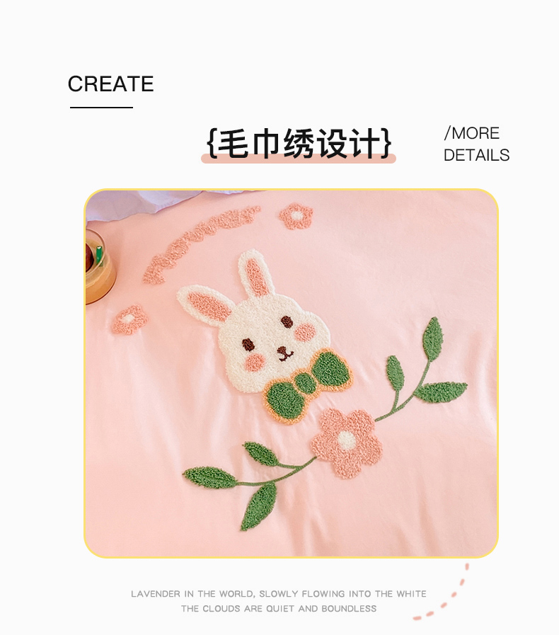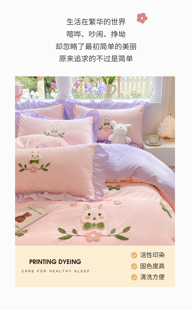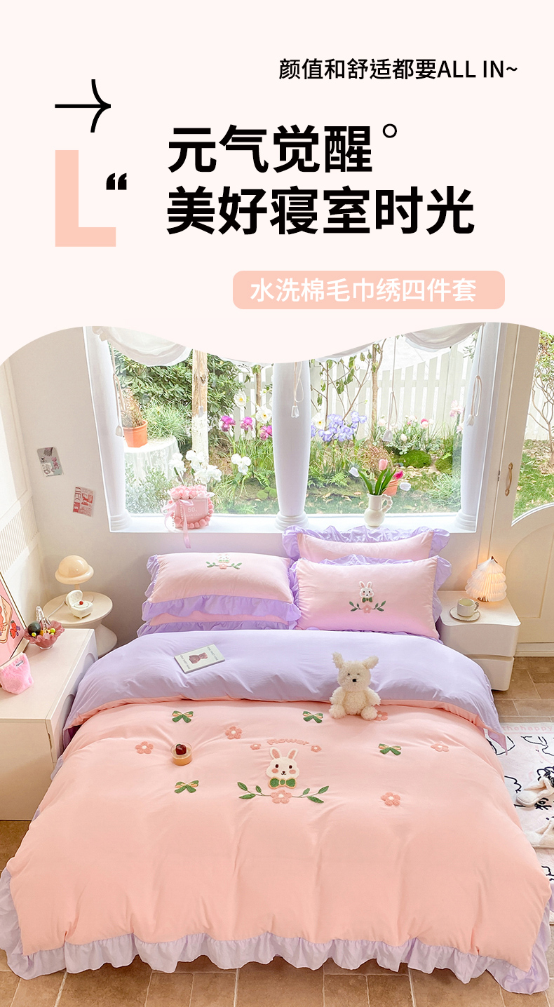 当前位置: 91家纺网 > 商品网购 > 床品套件 > 四件套 > 水洗棉四件套 > 你好美丽 2025新款水洗棉萌兔毛巾绣花边四件套 萌兔粉紫