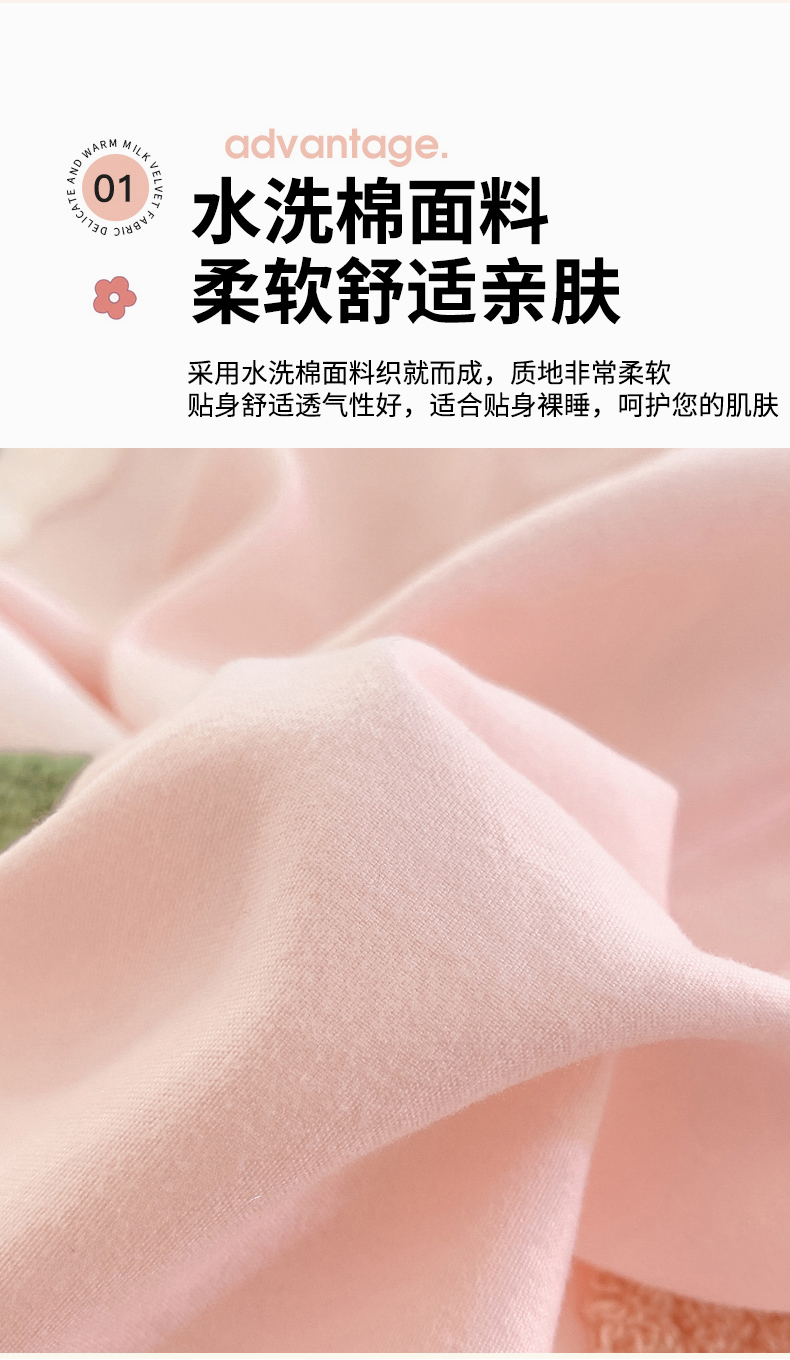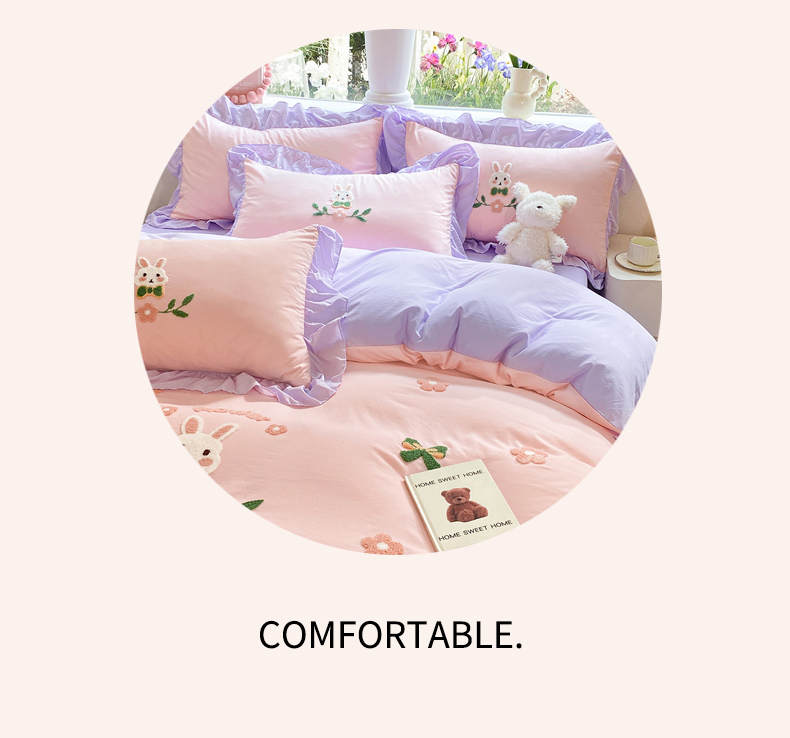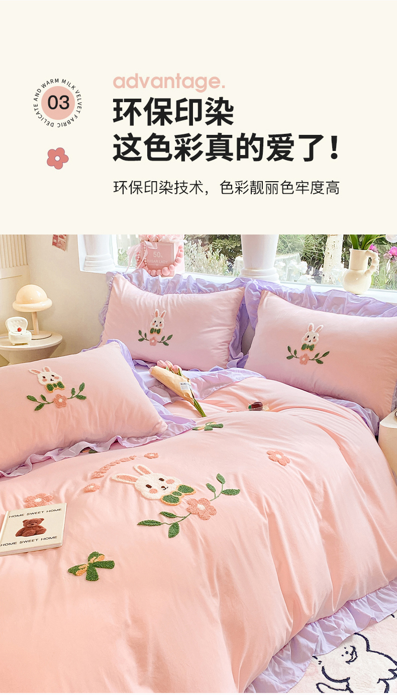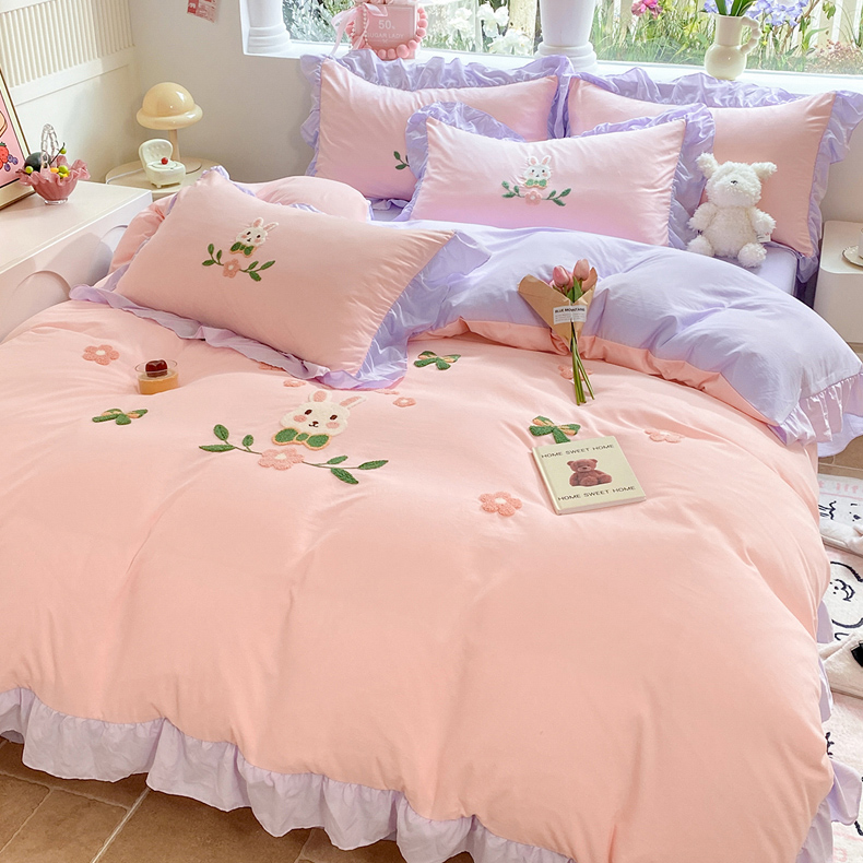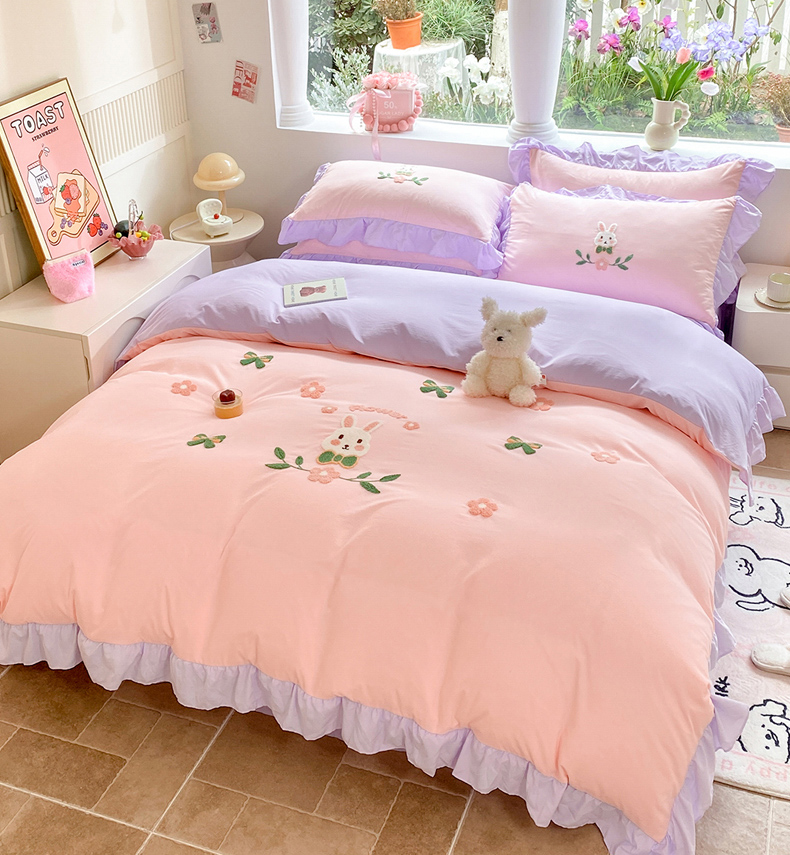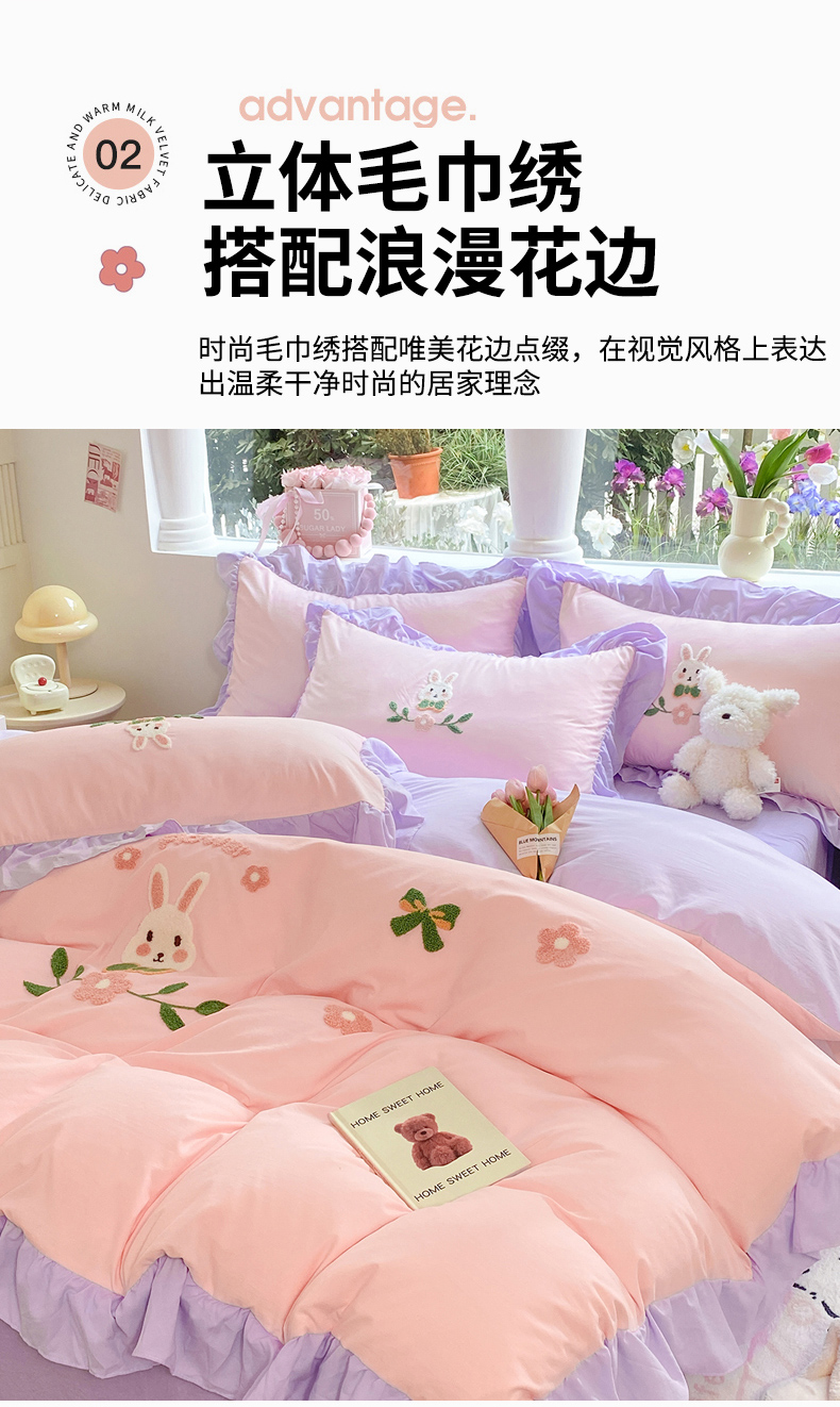当前位置: 91家纺网 > 商品网购 > 床品套件 > 四件套 > 水洗棉四件套 > 你好美丽 2025新款水洗棉萌兔毛巾绣花边四件套 萌兔粉紫