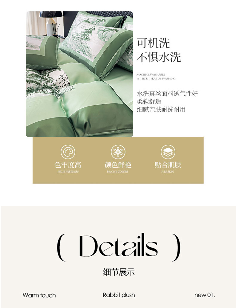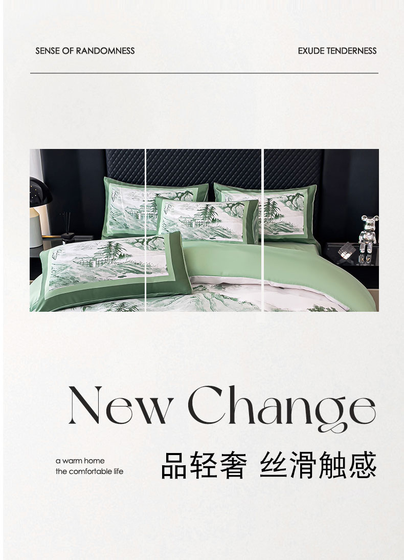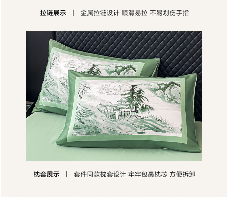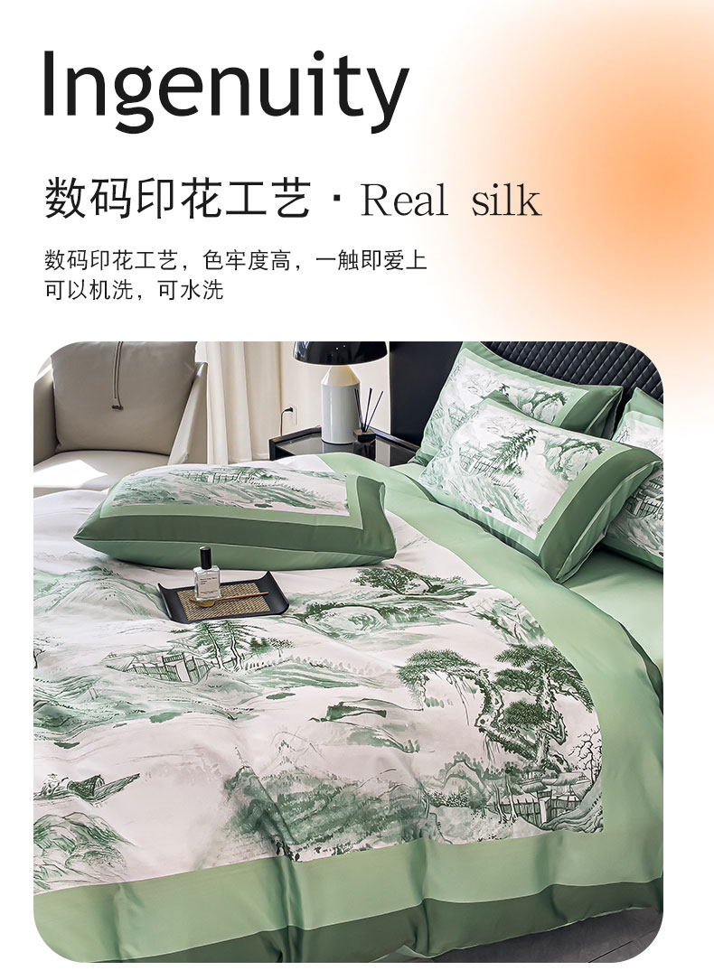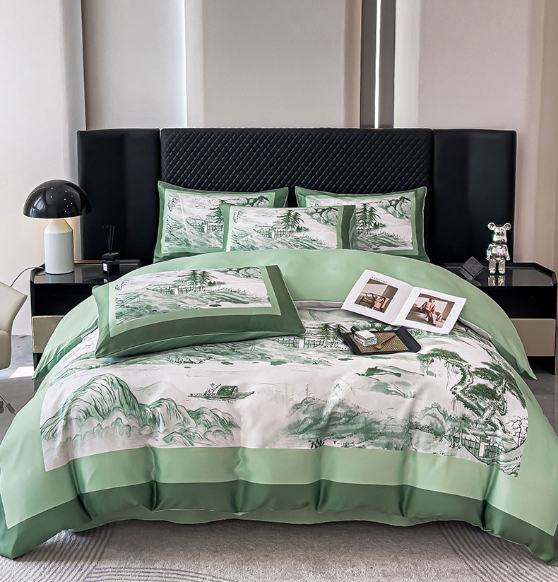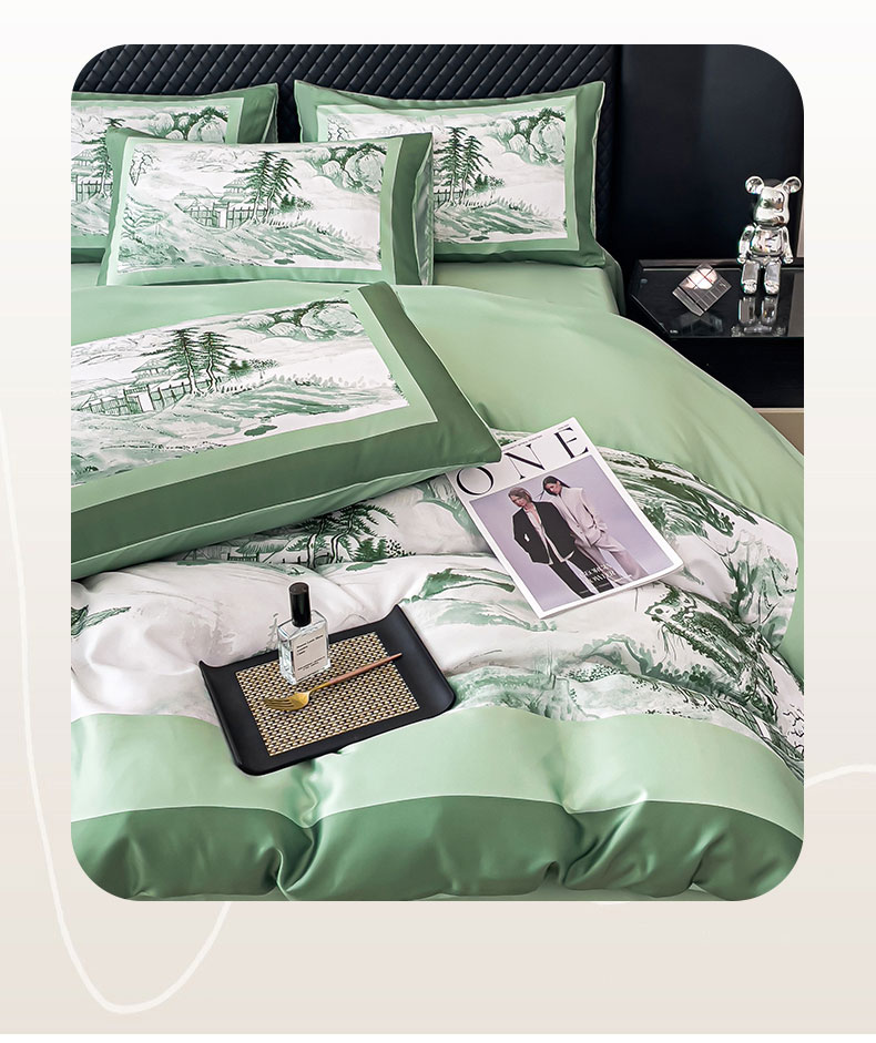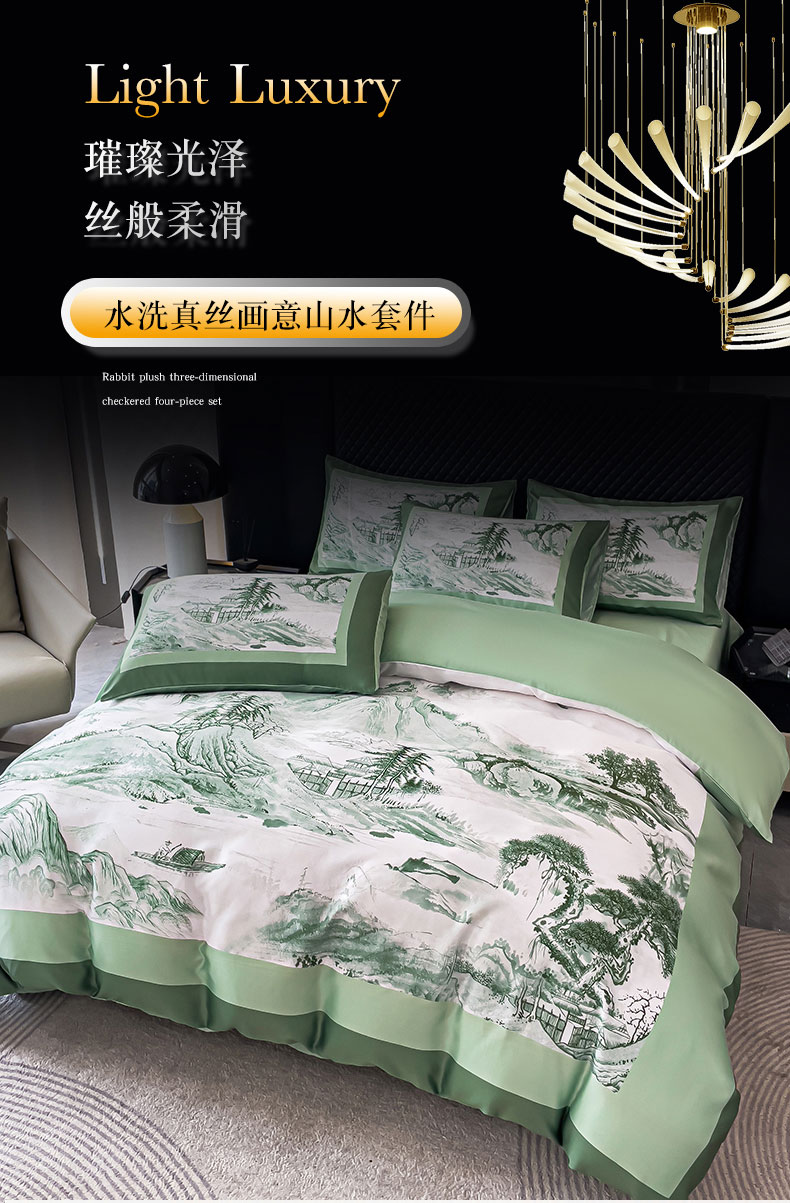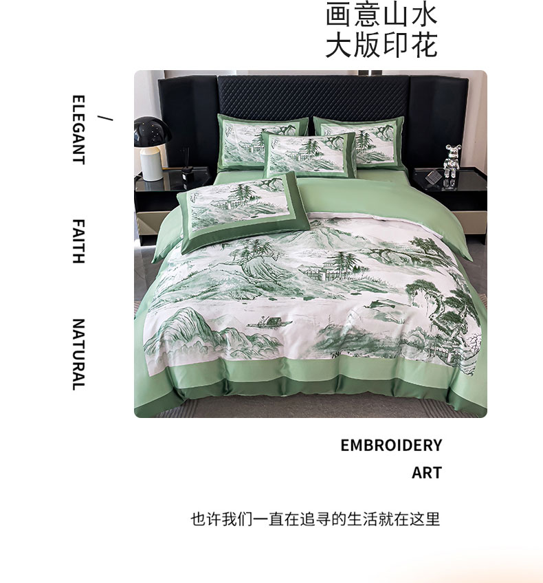 商品名称:2024新款水洗真丝画意山水系列四件套 画意山水-绿