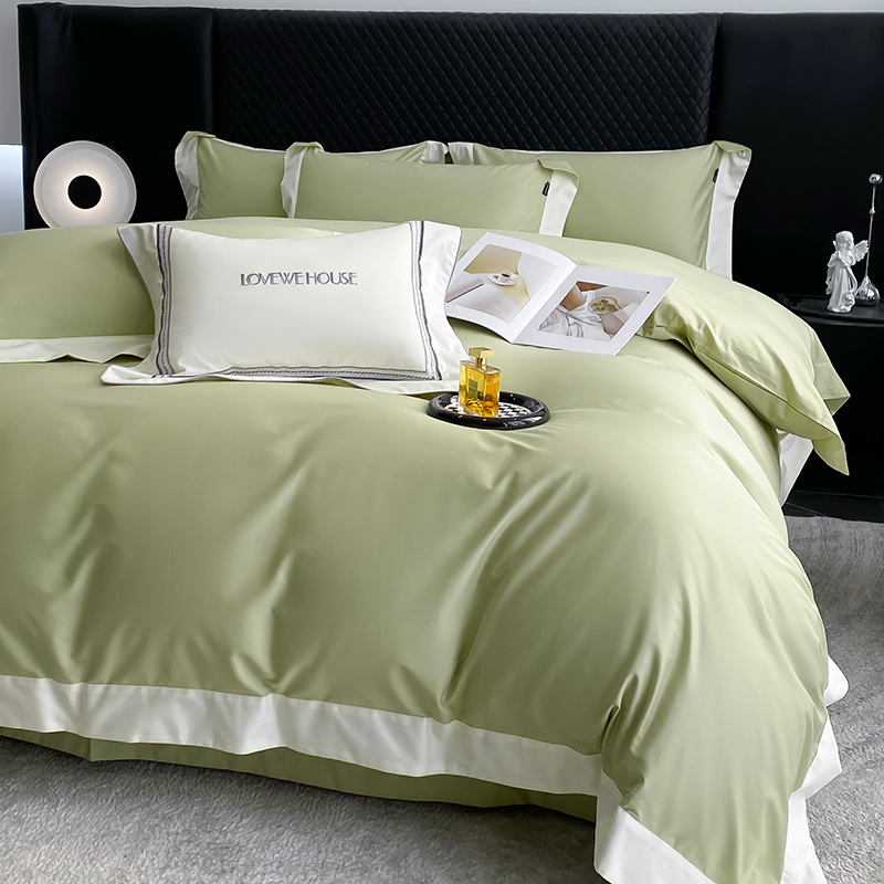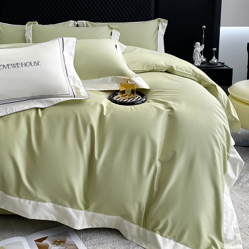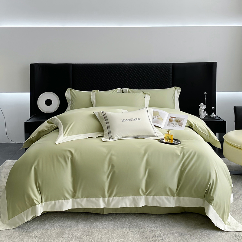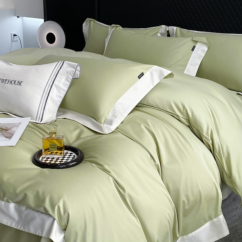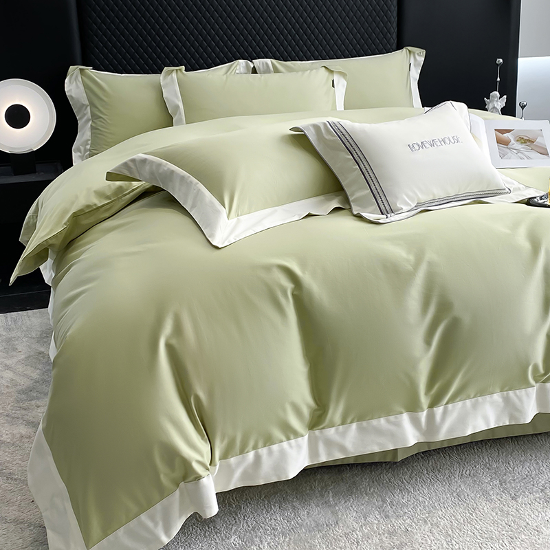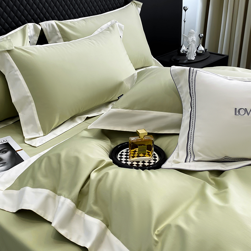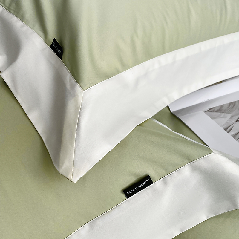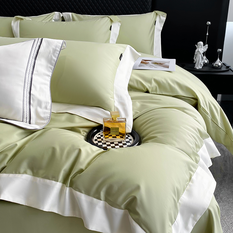 商品名称:2025新款50S长绒棉纯色撞色简约款拼角款四件套-洛斐 奶青