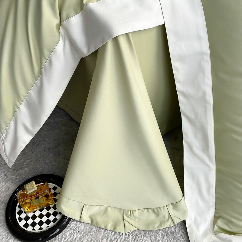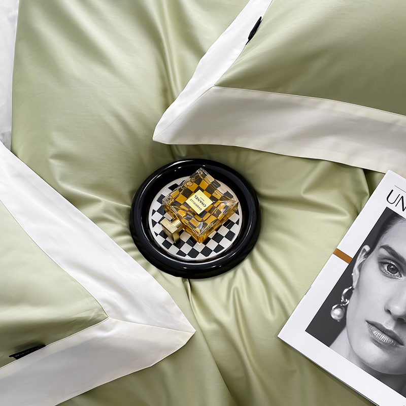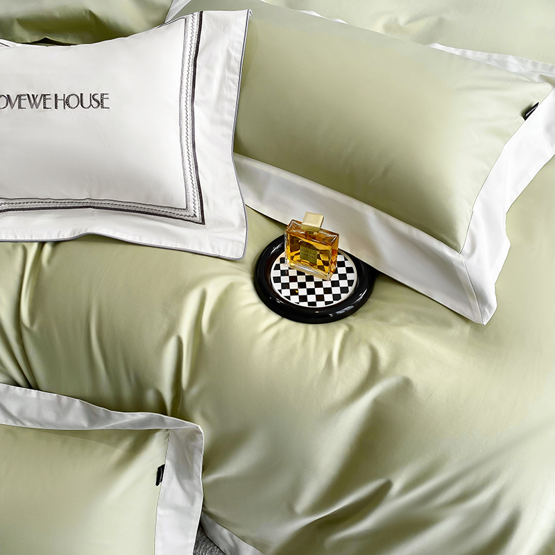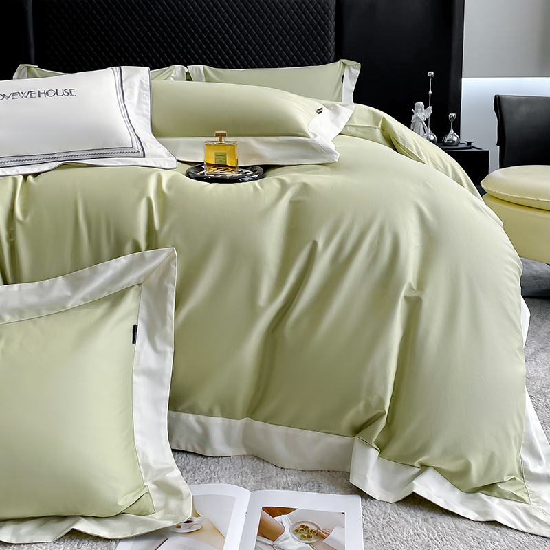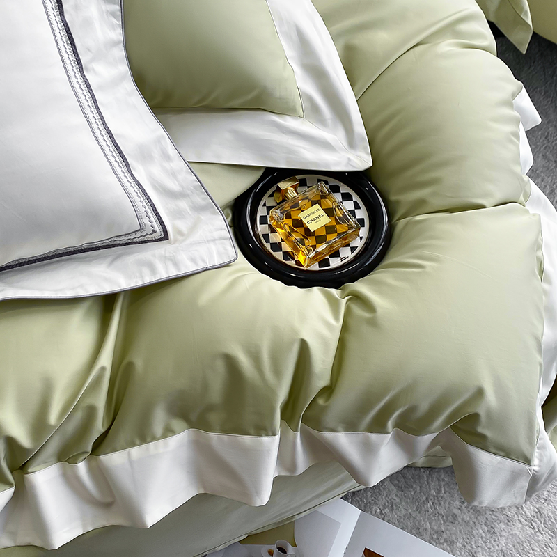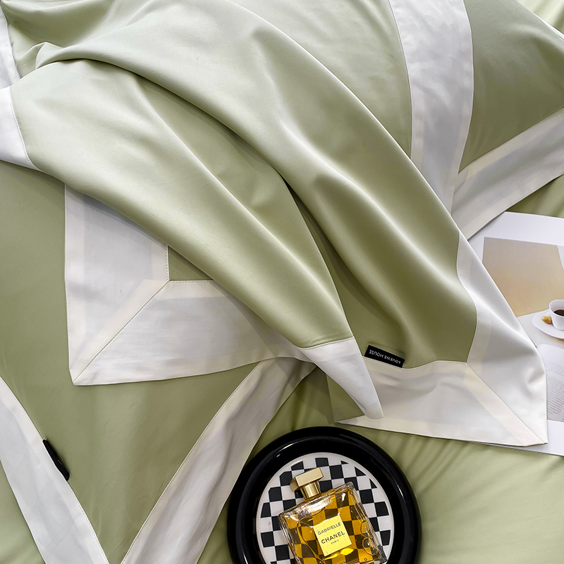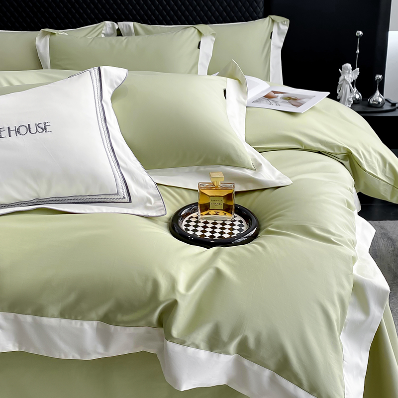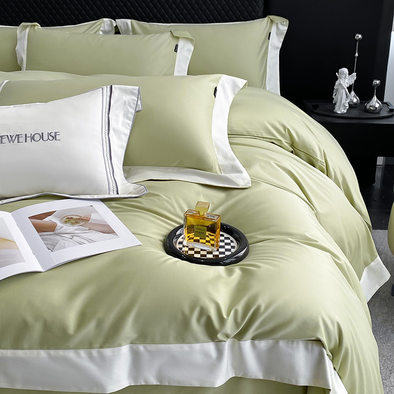 商品名称:2025新款50S长绒棉纯色撞色简约款拼角款四件套-洛斐 奶青