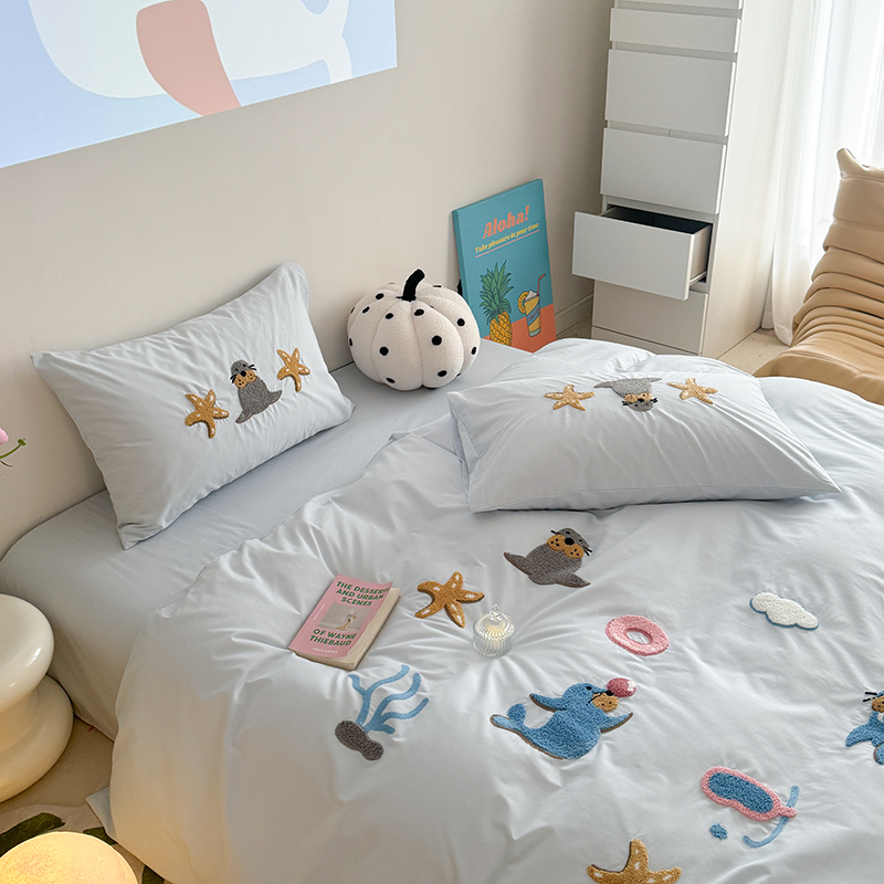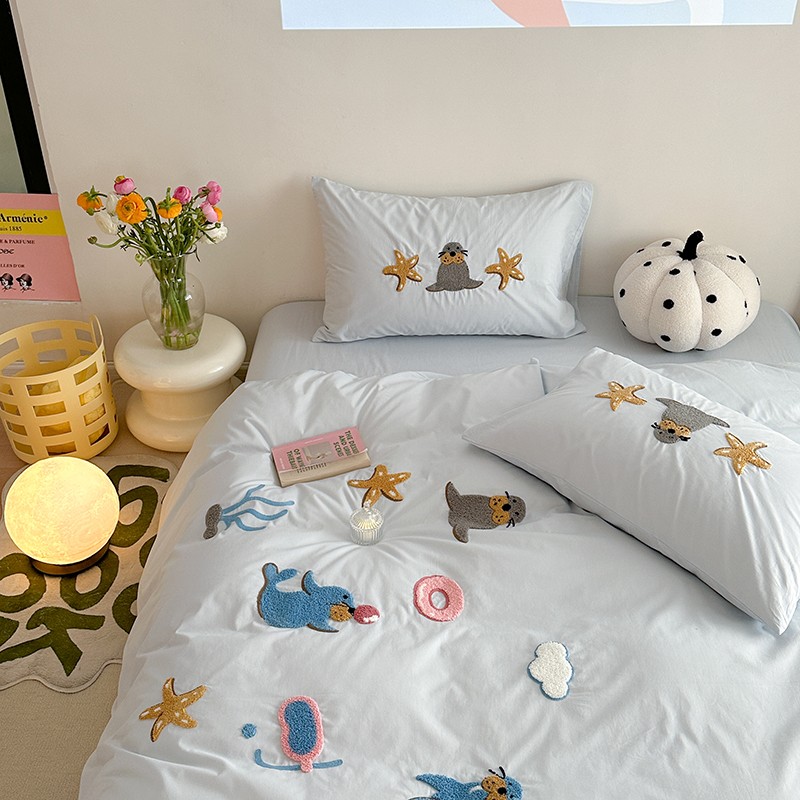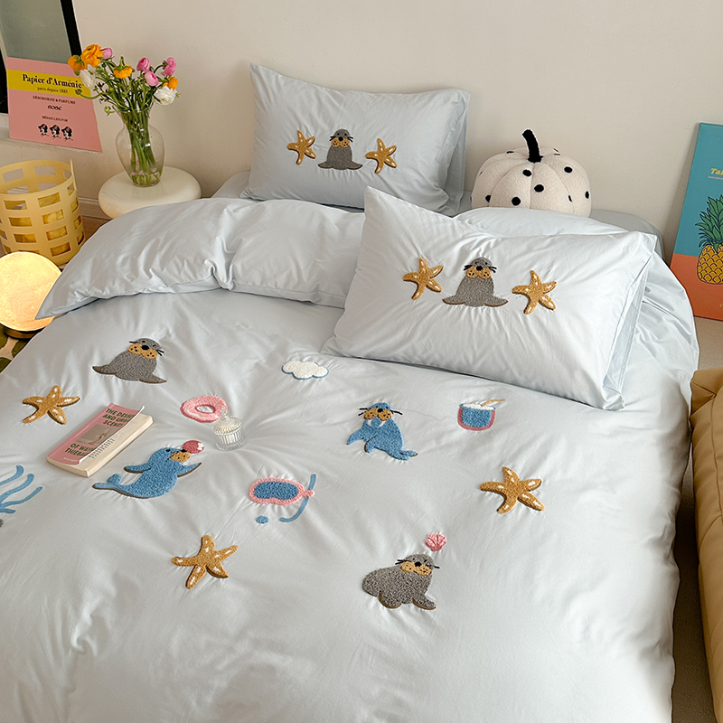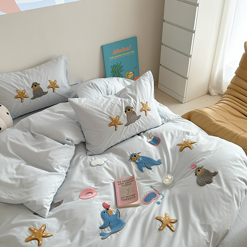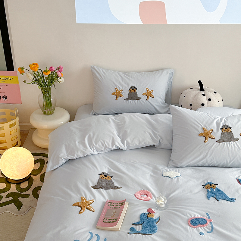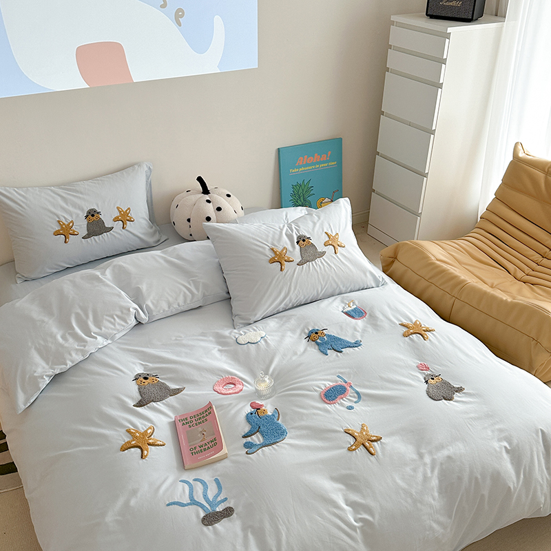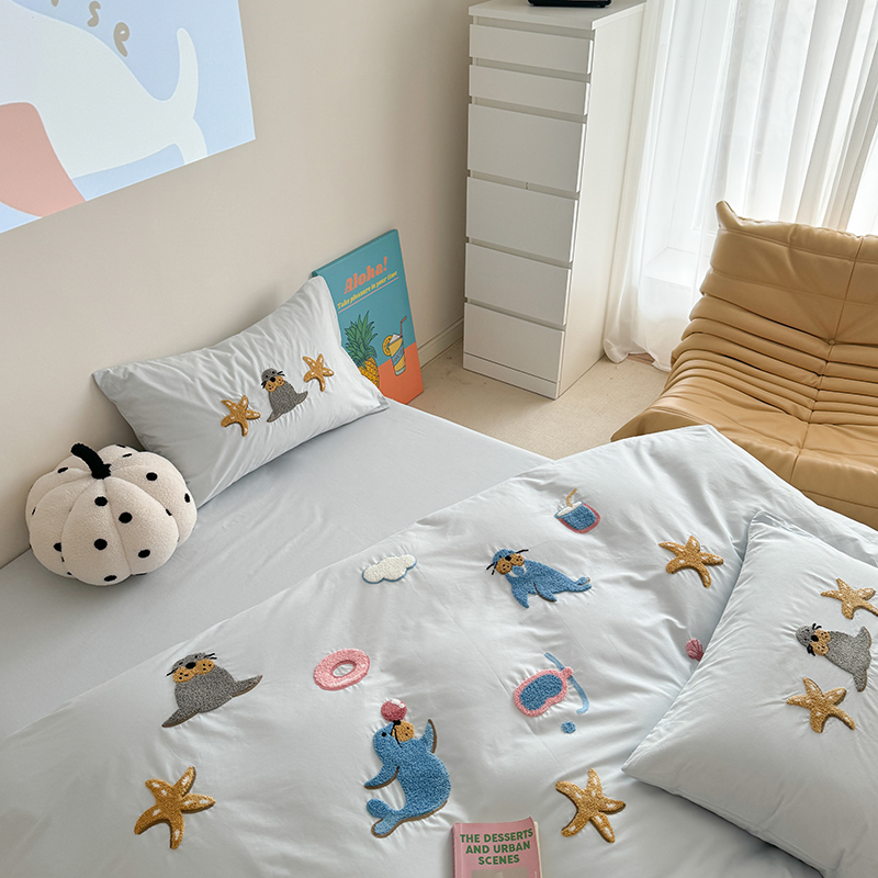 柚子YOUTH 2024新款全棉水洗棉毛巾绣散排卡通系列四件套 海狮