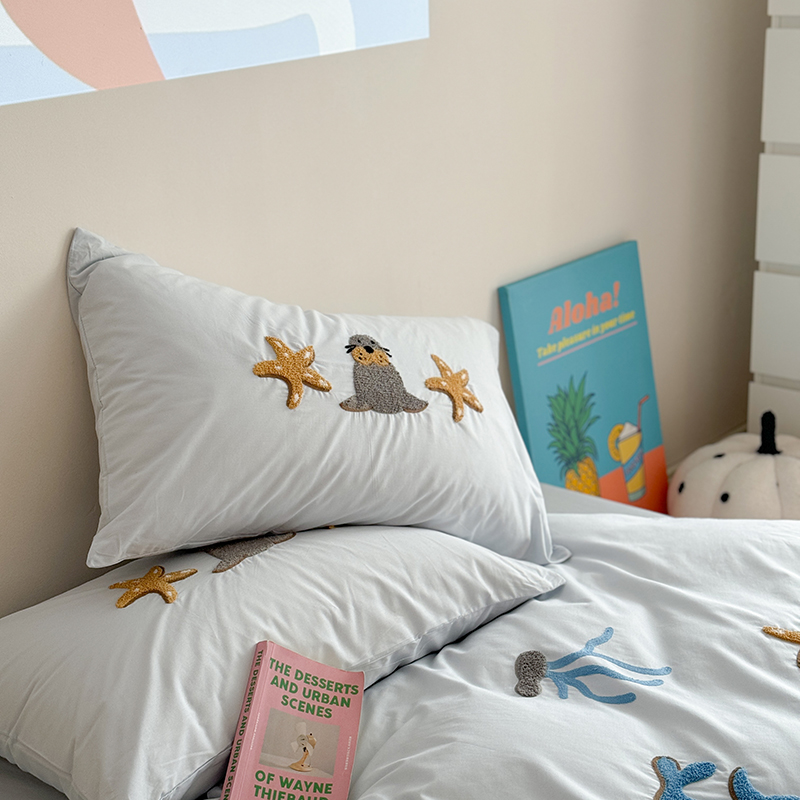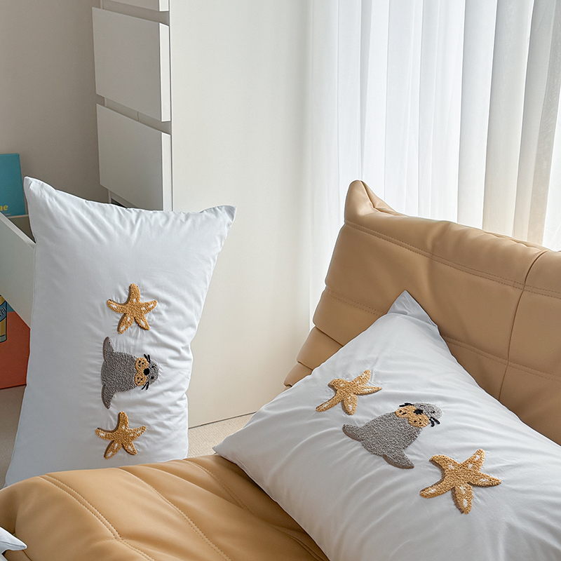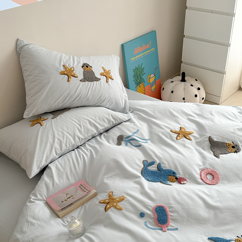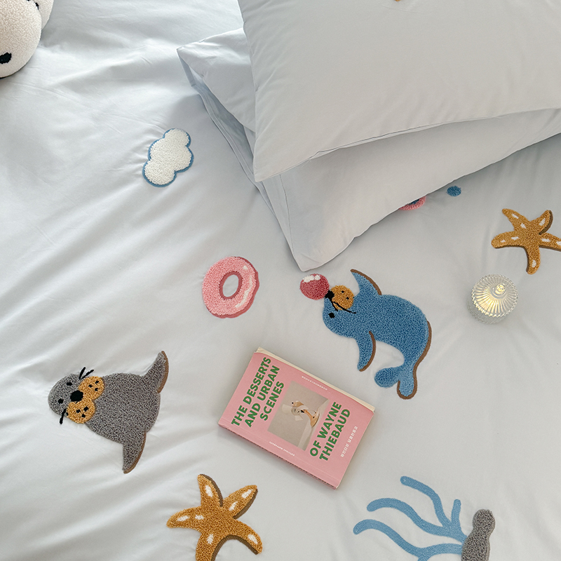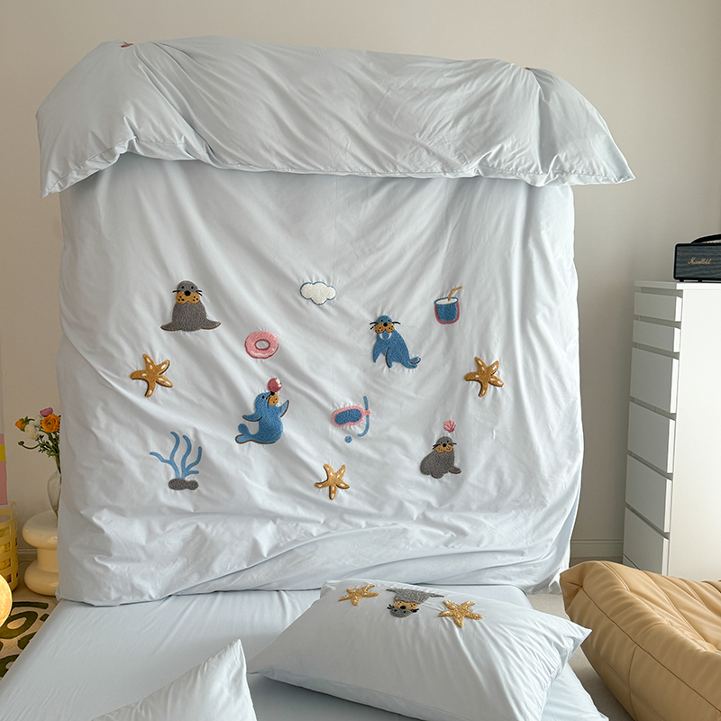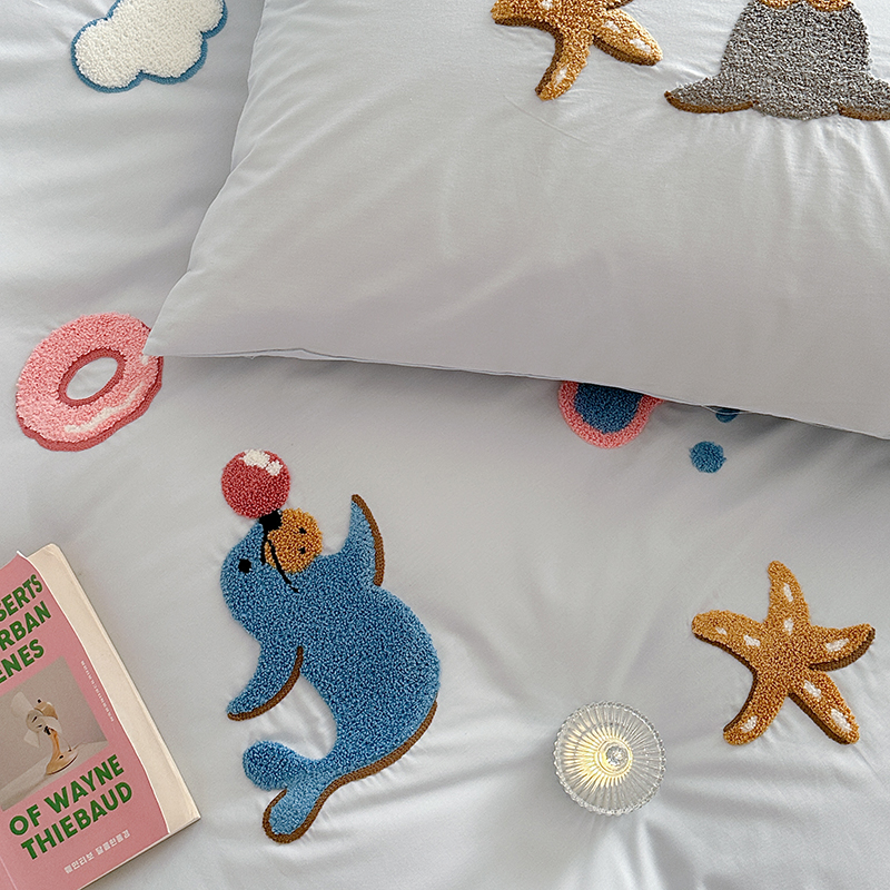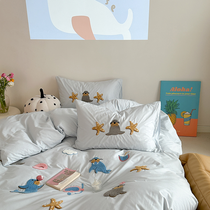 柚子YOUTH 2024新款全棉水洗棉毛巾绣散排卡通系列四件套 海狮
