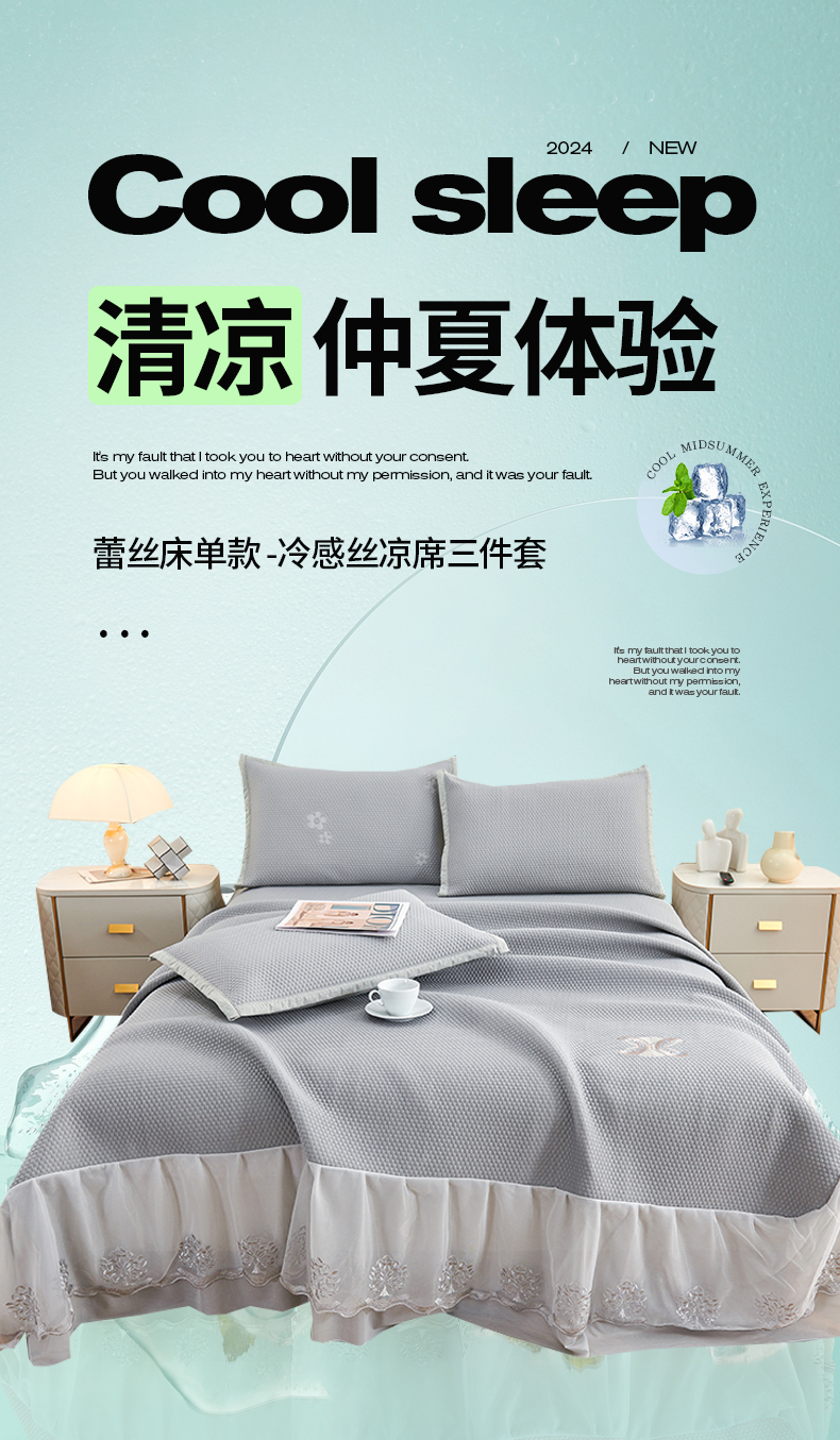 宜派家纺 2024新款雪花冷感席三件套床单式床裙款 凤尾-灰