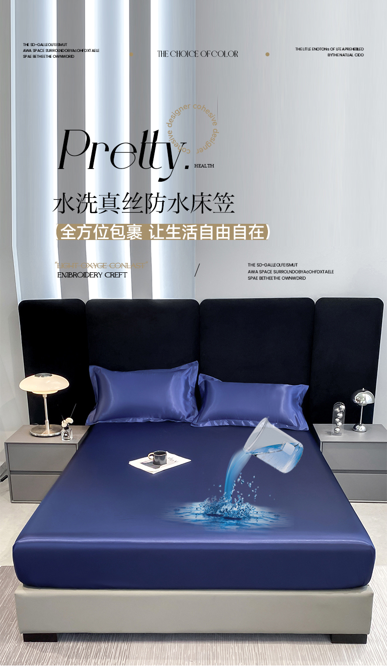 • 91家纺网 家纺一手货源 找家纺 (总)梦尚舒 2025新款水洗真丝防水床笠隔尿床单床垫保护套,巴黎蓝,天之蓝,月光蓝,樱花粉,淡雅玉,玛瑙红,珍珠白,紫罗兰,翡翠绿,胭脂玉,至尊黑,藏青色,银灰色,香槟金