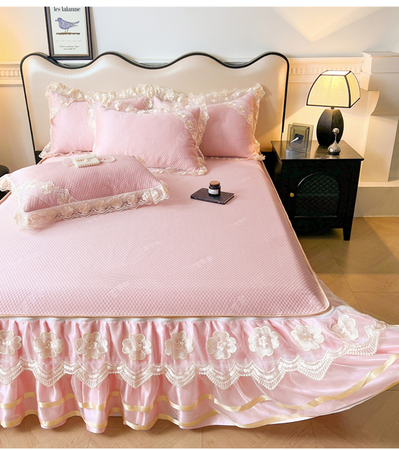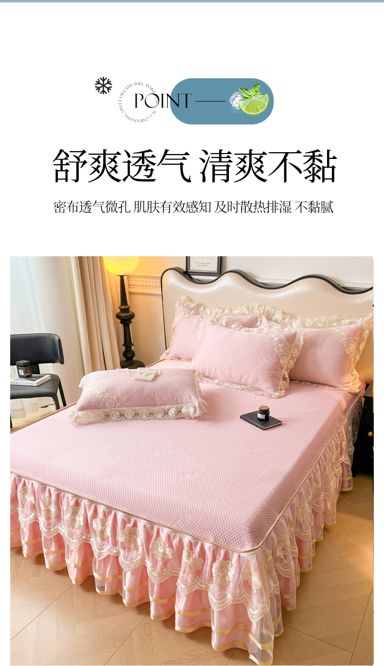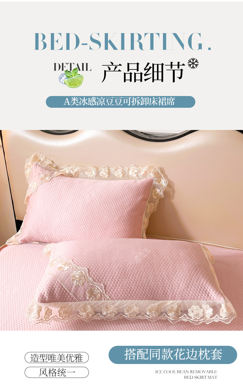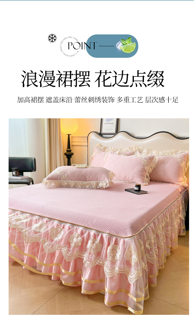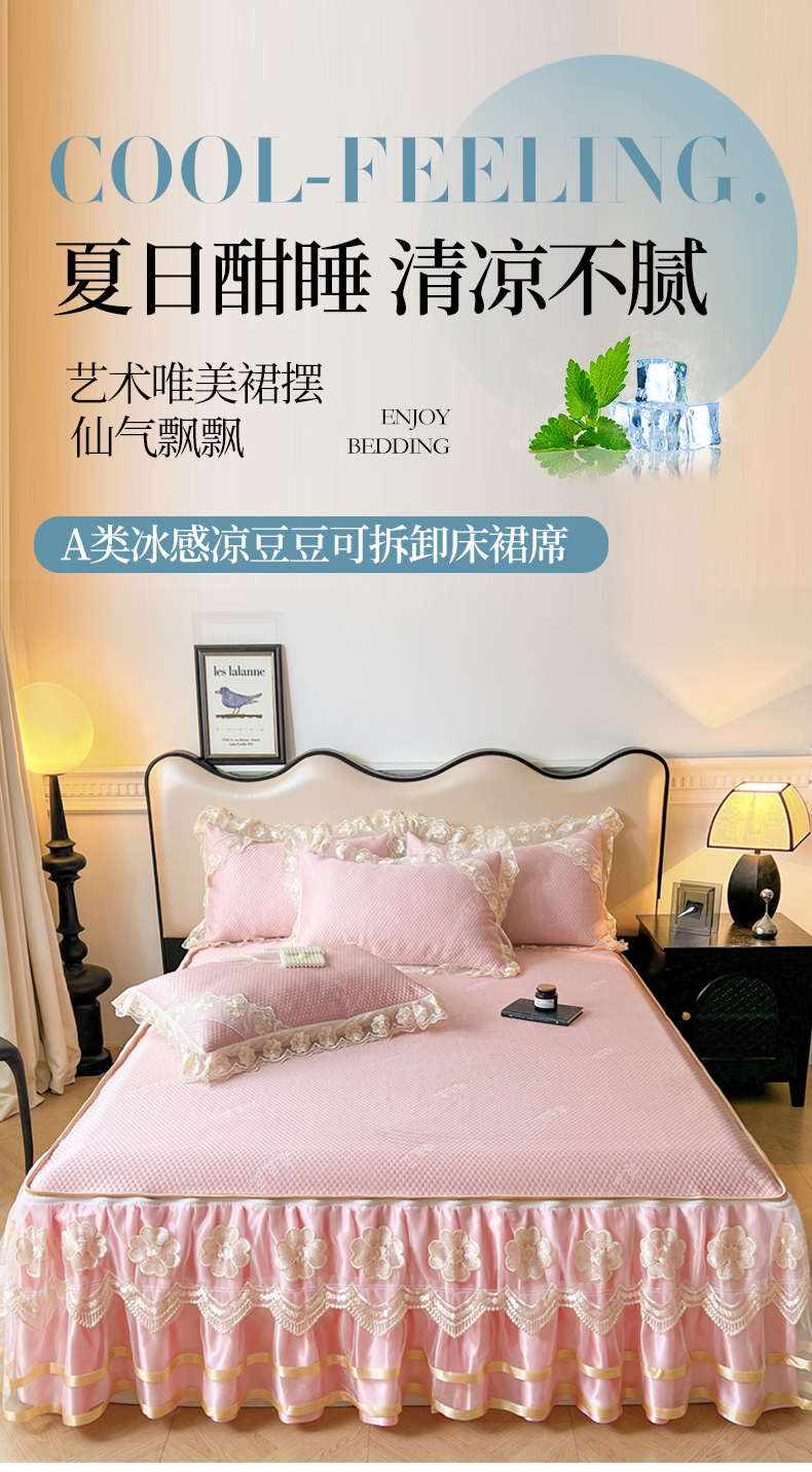 商品名称:虹星家纺 2024新款A类冰感凉豆豆可拆卸床裙席三件套 梦幻粉