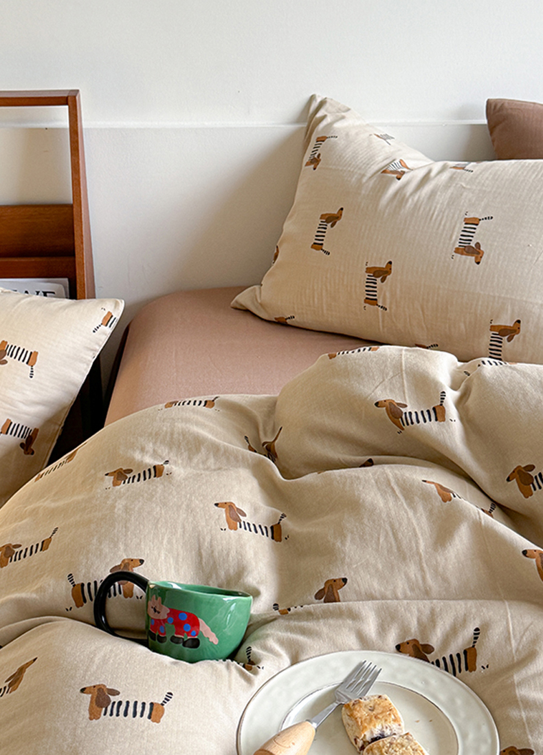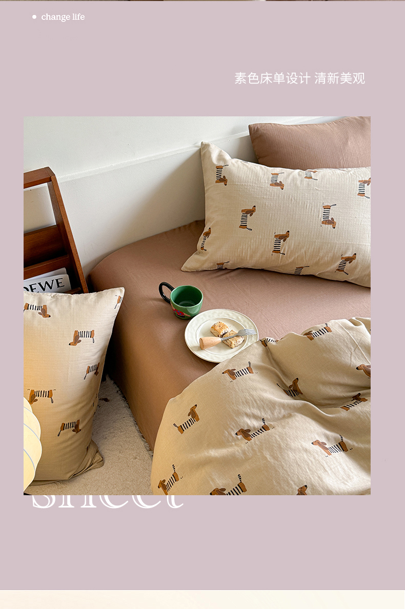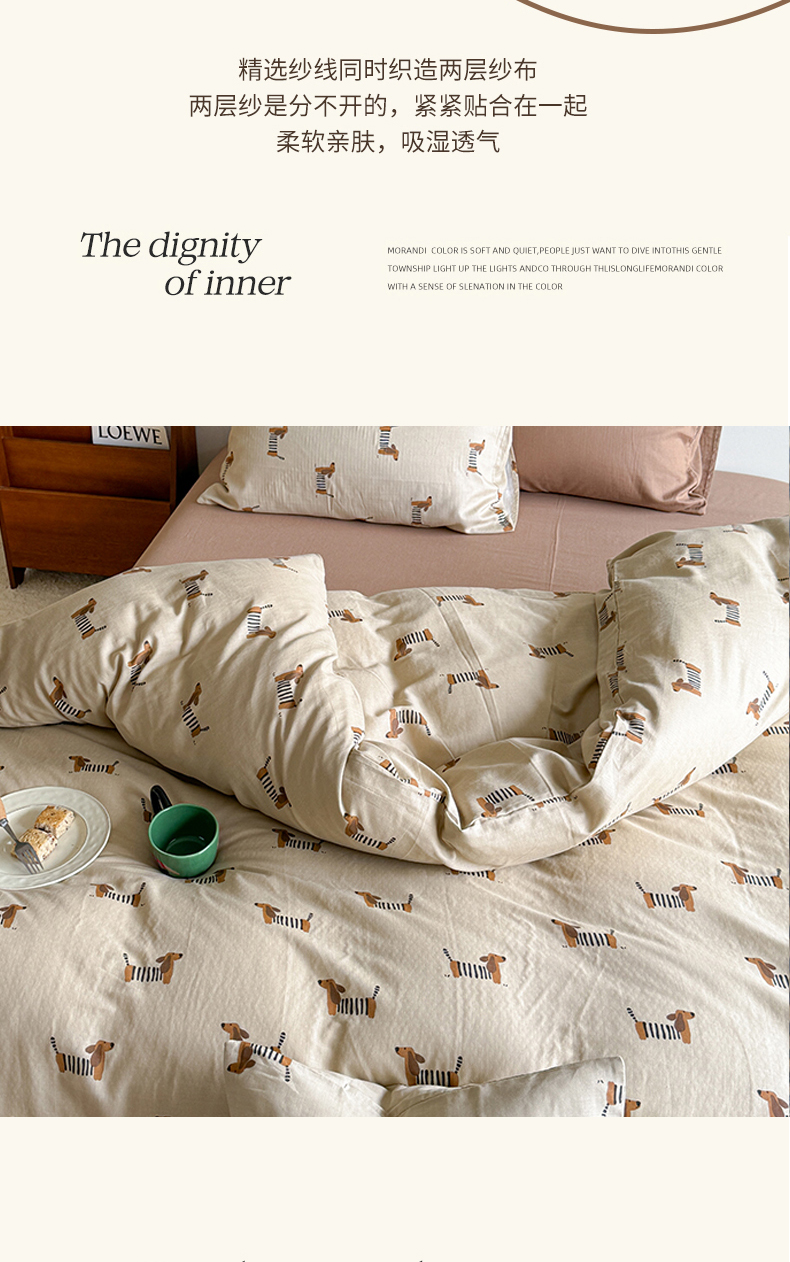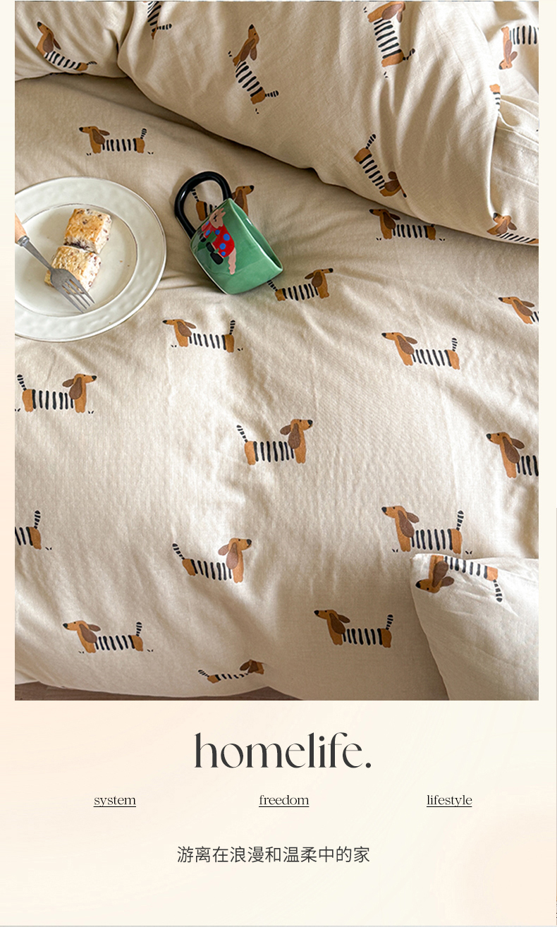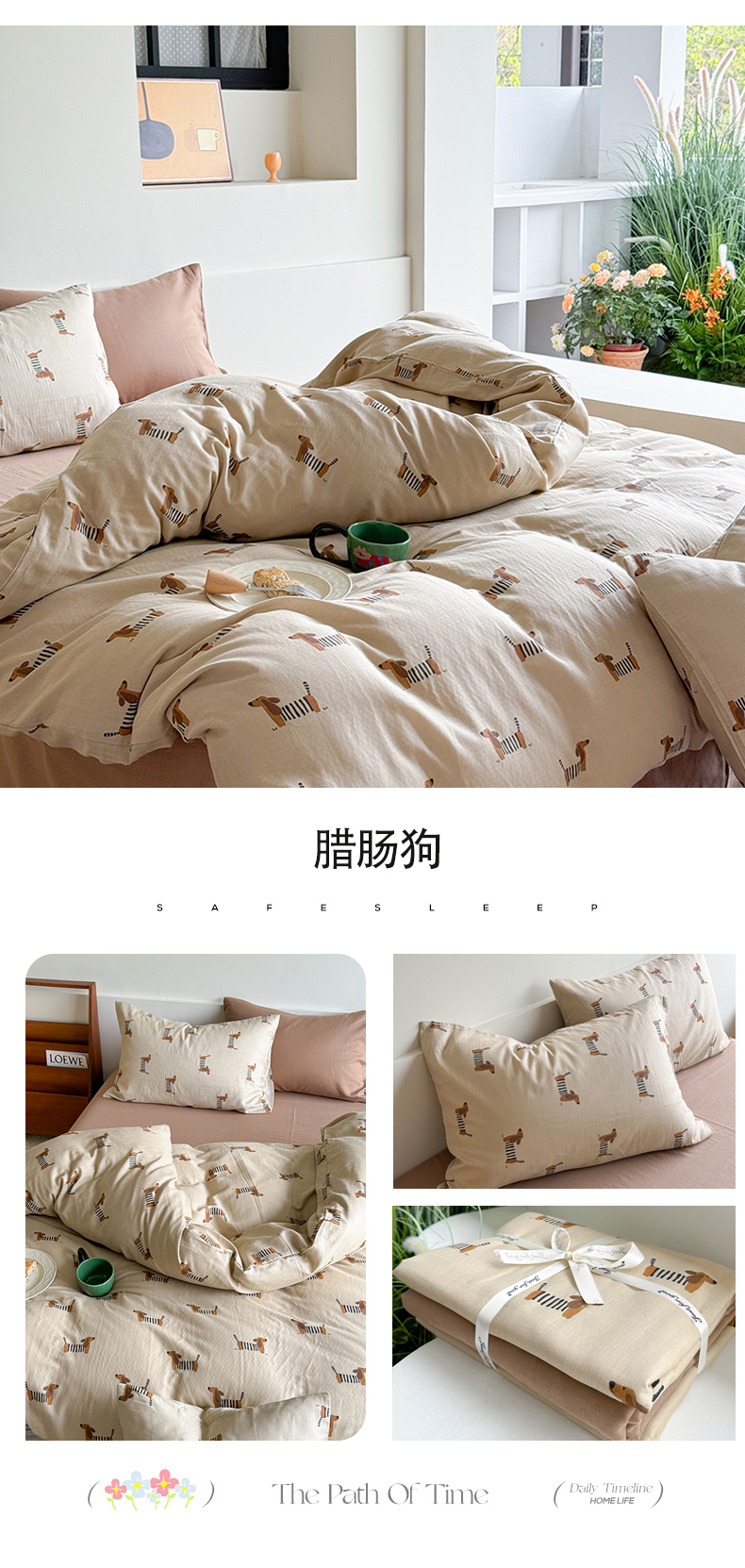 当前位置: 91家纺网 > 商品网购 > 床品套件 > 四件套 > 全棉普通四件套 > 麦伦家居 2024新款A类全棉双层纱系列四件套-影棚图 腊肠狗