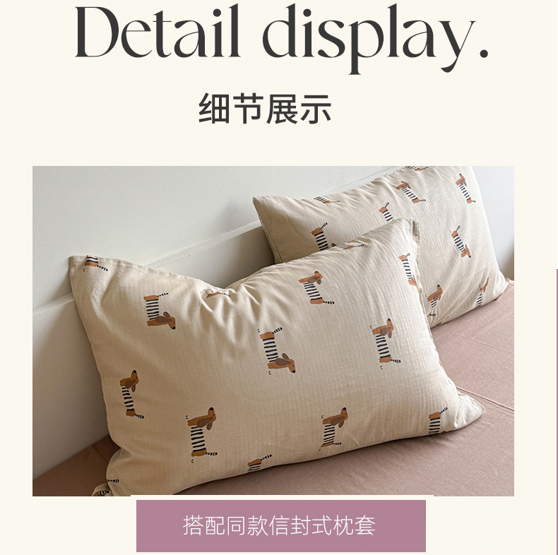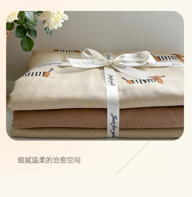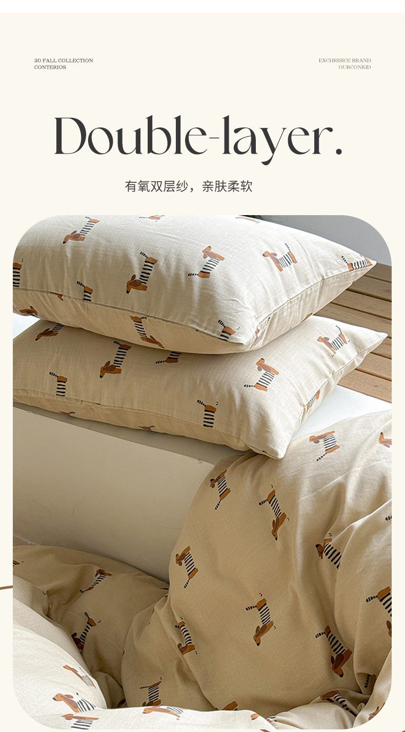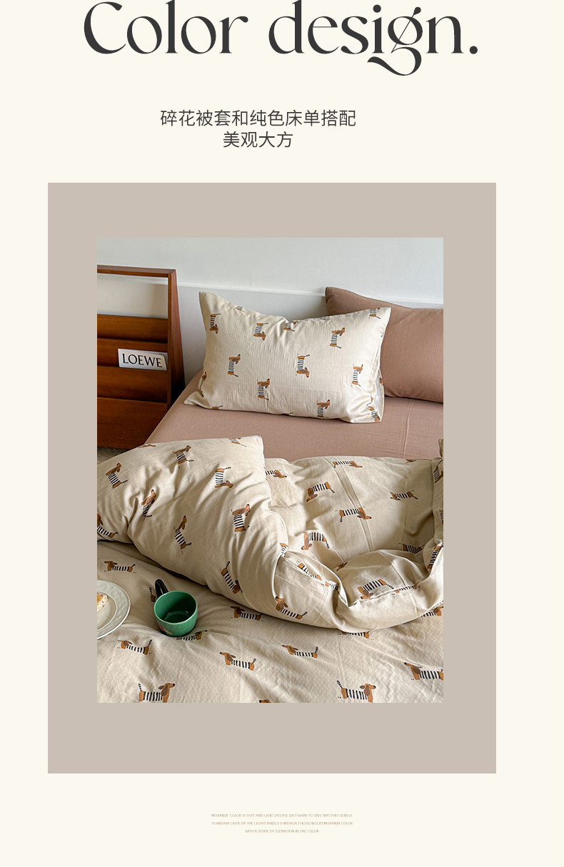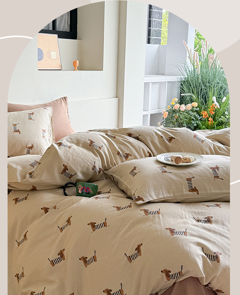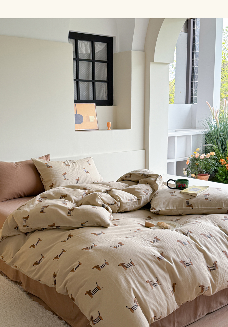 当前位置: 91家纺网 > 商品网购 > 床品套件 > 四件套 > 全棉普通四件套 > 麦伦家居 2024新款A类全棉双层纱系列四件套-影棚图 腊肠狗