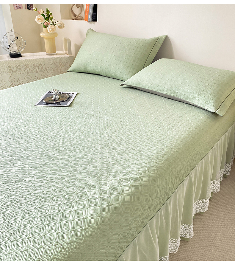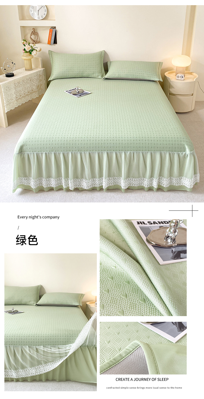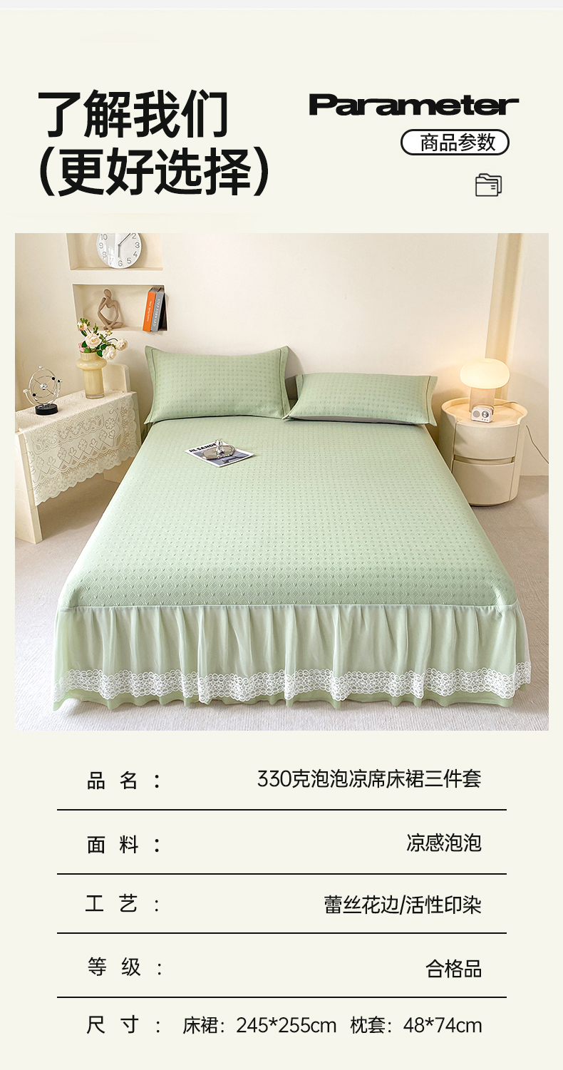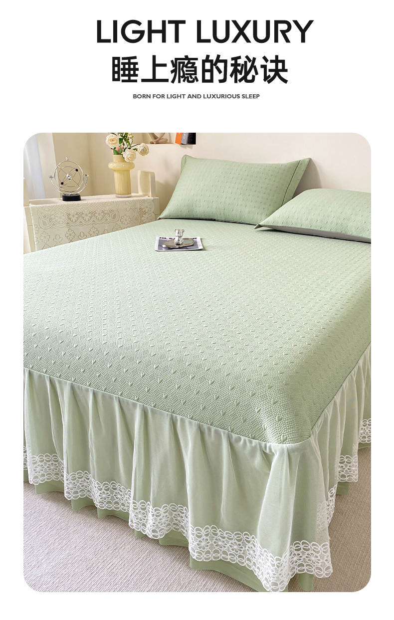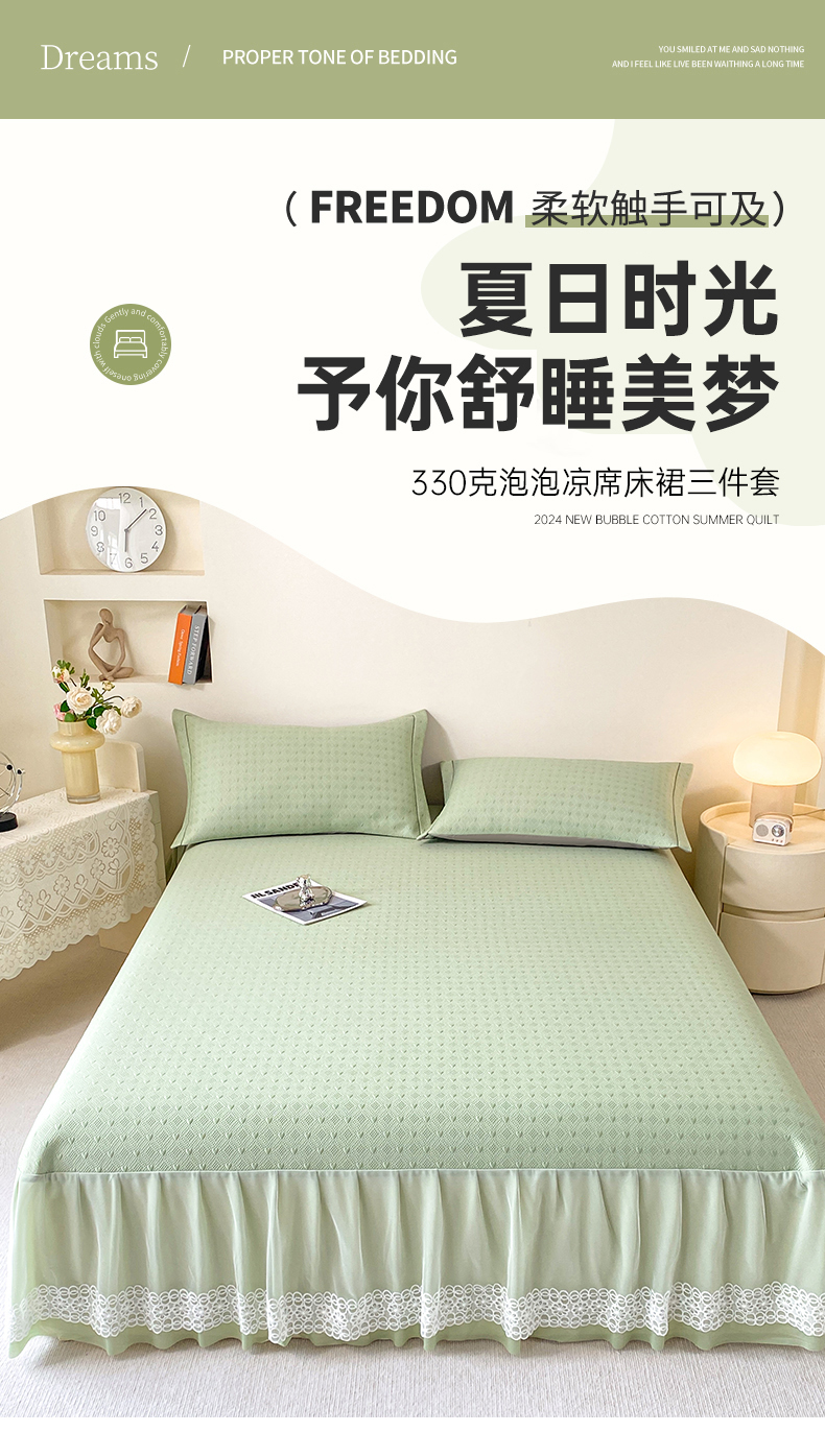 (总)美洲琳 2025新款650克凉豆豆凉席床裙三件套,湖蓝,浅灰,水绿,香槟,心粉