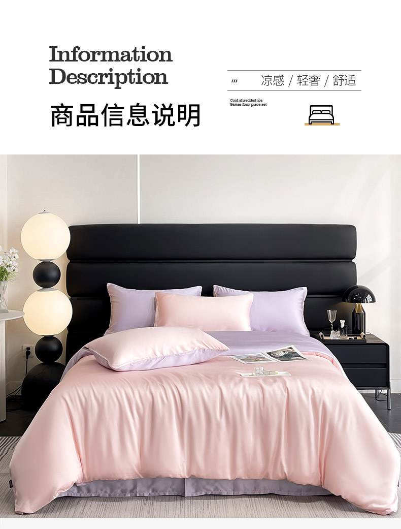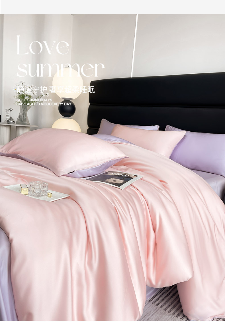 商品名称:【A类100支兰精天丝】夏季轻奢风真丝四件套拼色纯色简约凉感冰丝绸床上用品 樱花粉+熏衣紫