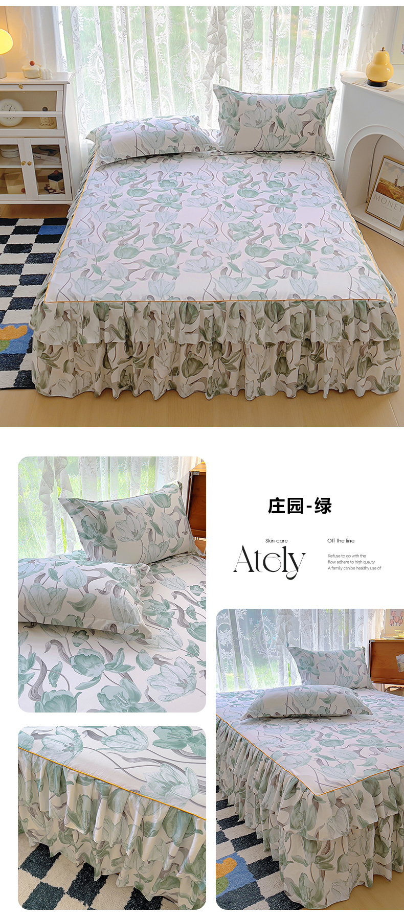 易辰美 2024新款芦荟棉床裙三件套 庄园-绿