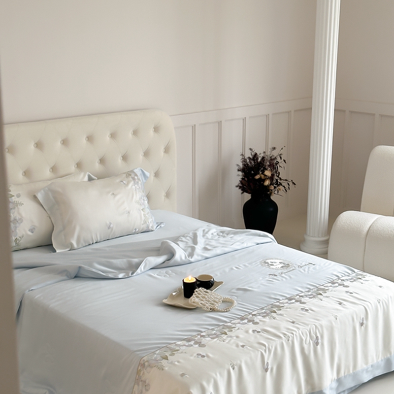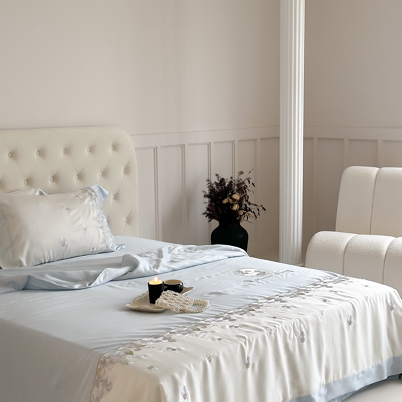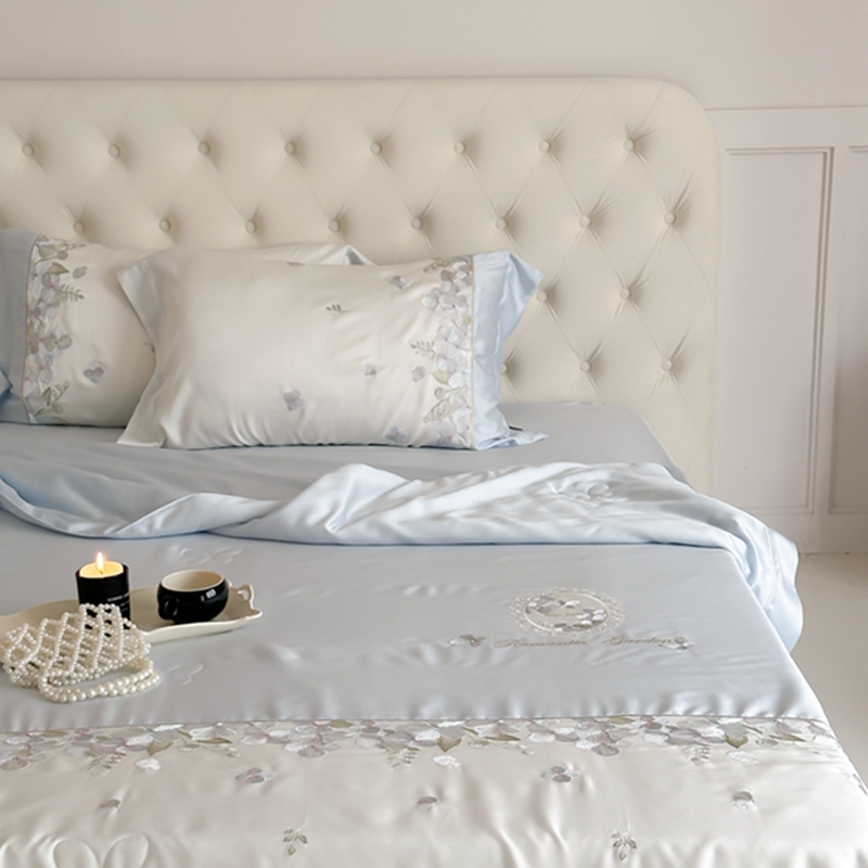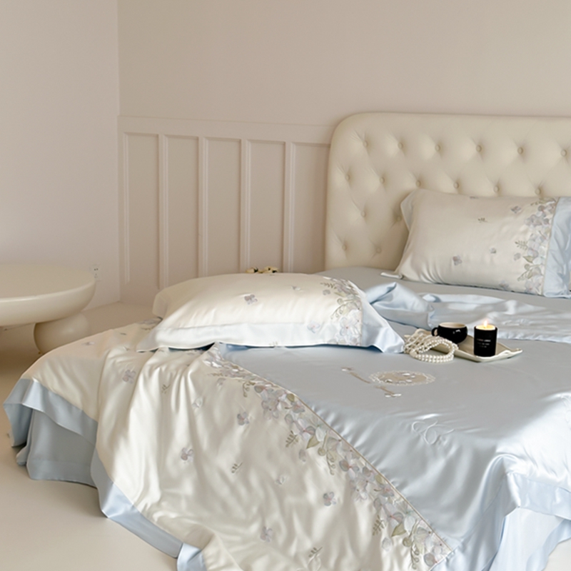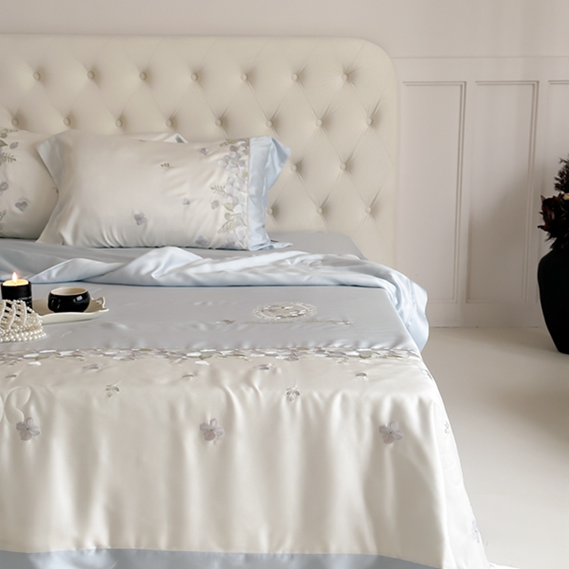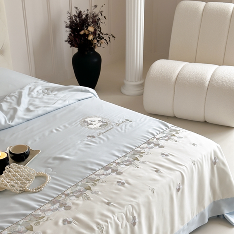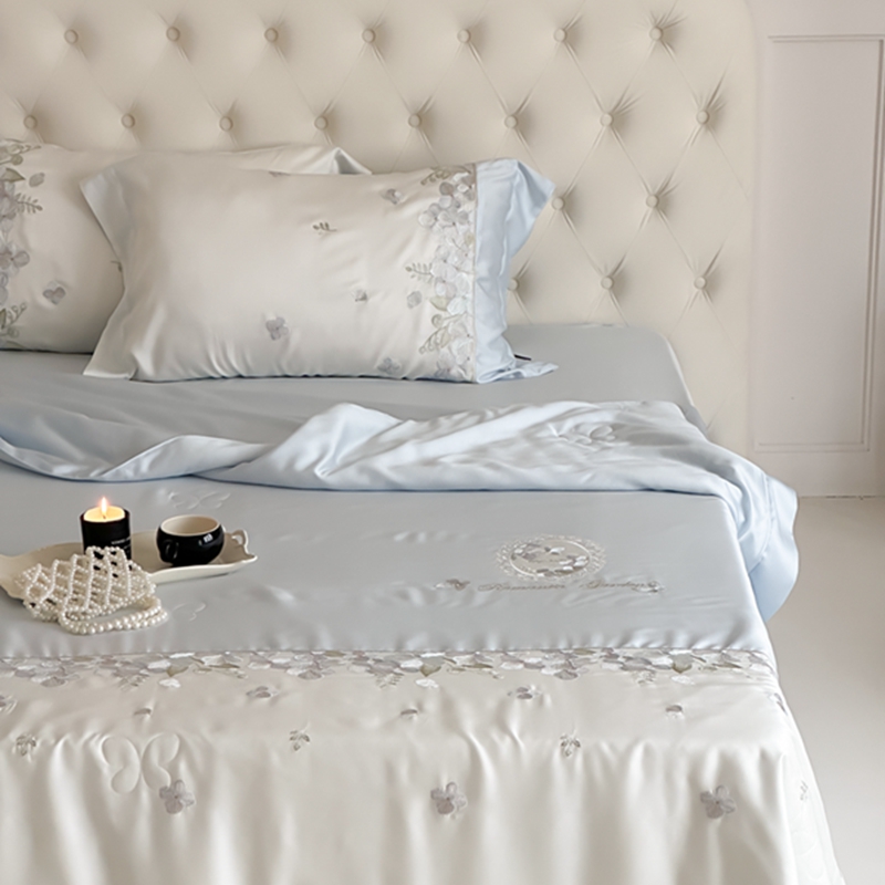 (总)佳汐蓝家纺 2025新款春夏新品TENCEL兰精天丝四件套绣花系列,花颜如梦·珍珠粉,花颜如梦·珍珠绿