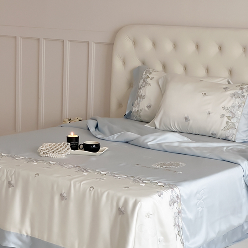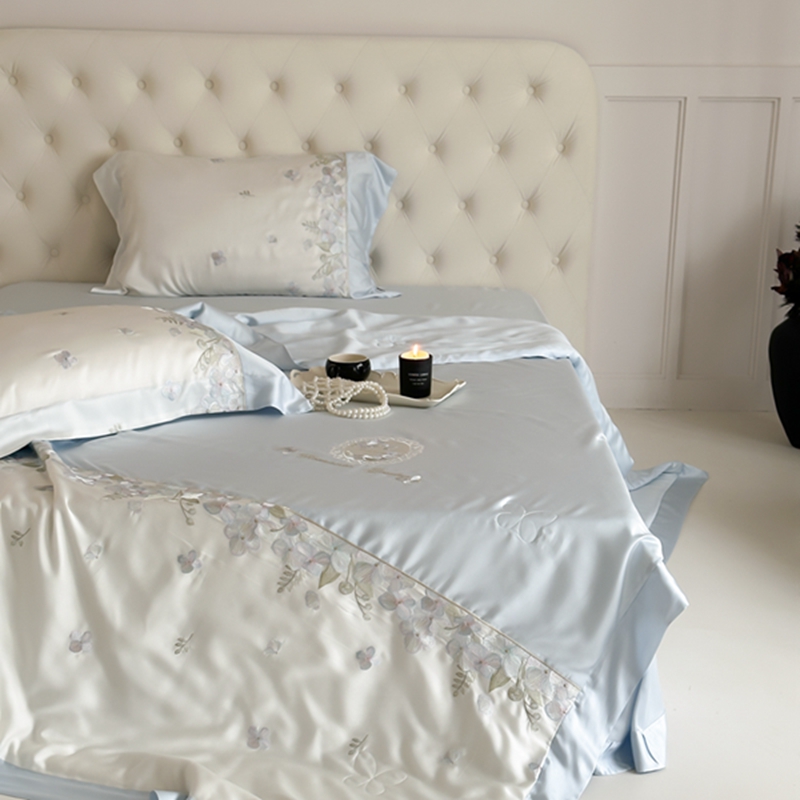 (总)佳汐蓝家纺 2025春夏新款天丝棉蝶舞繁花绣花天丝四件套,蝶舞繁花·粉,蝶舞繁花·蓝