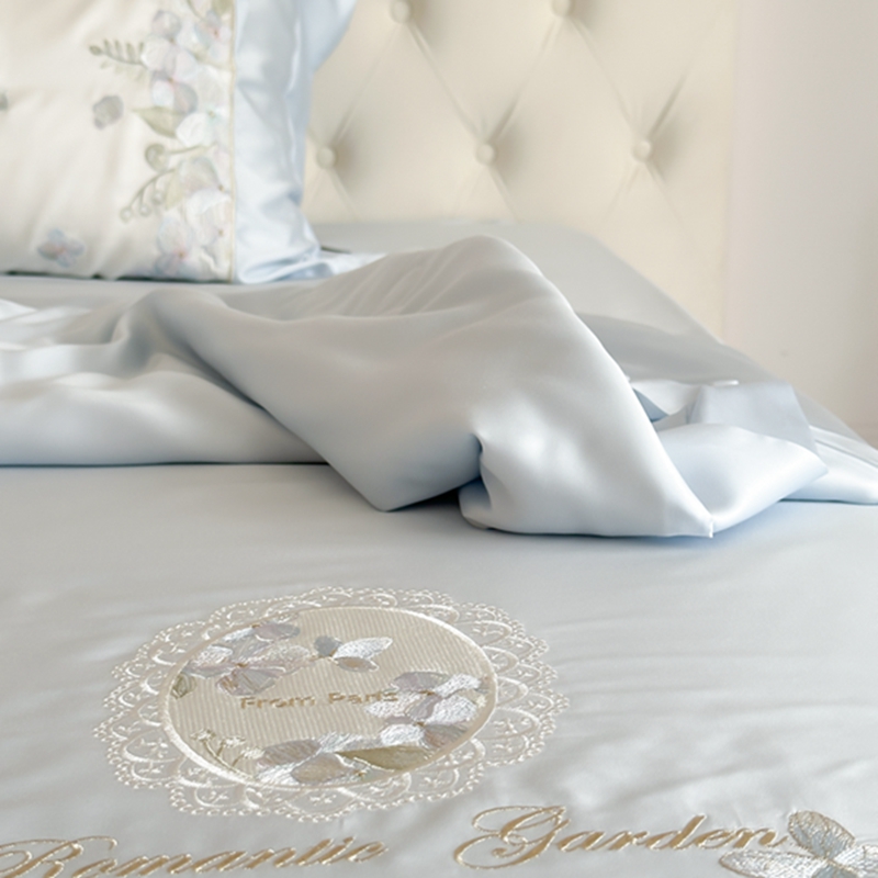 (总)佳汐蓝家纺 2025新款春夏新品TENCEL兰精天丝四件套绣花系列,墨菲花园·珍珠绿