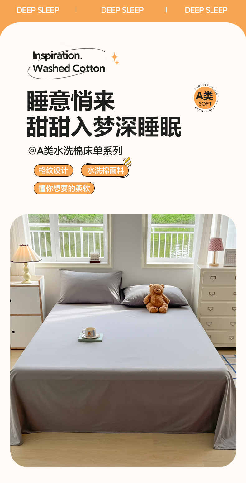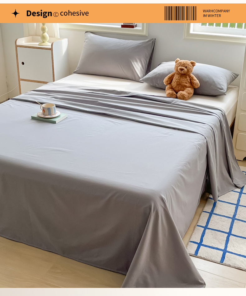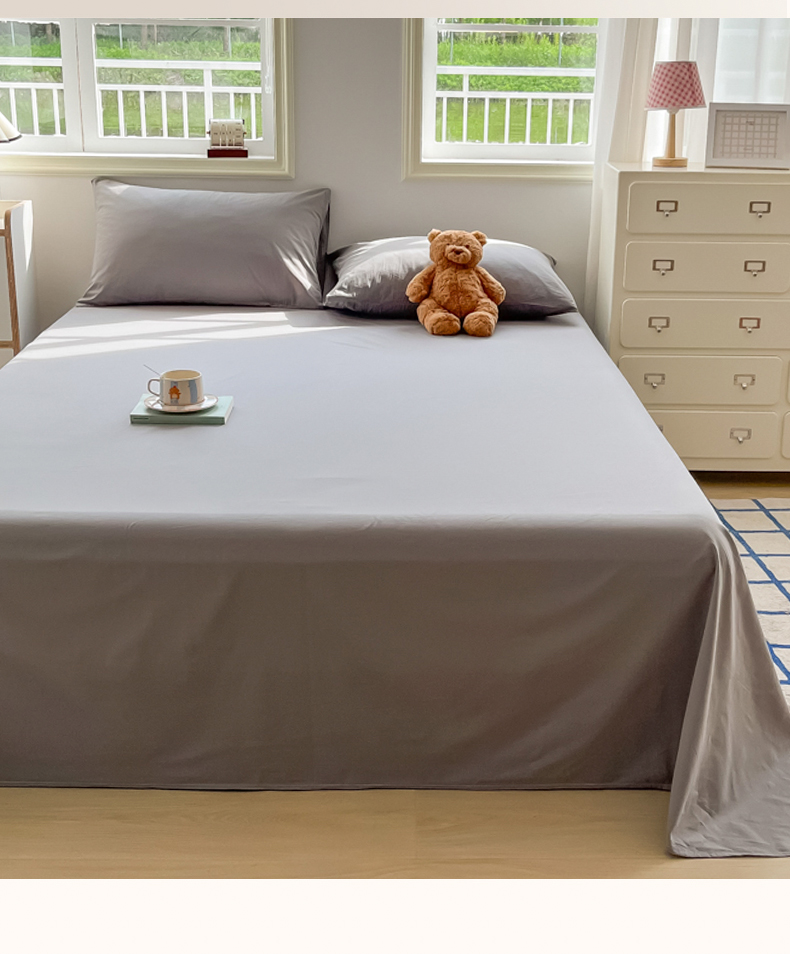 韩巢家纺 2024新款简约格子纯色A类水洗棉床单枕套三件套 A类浅灰-床单