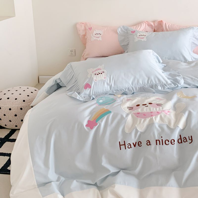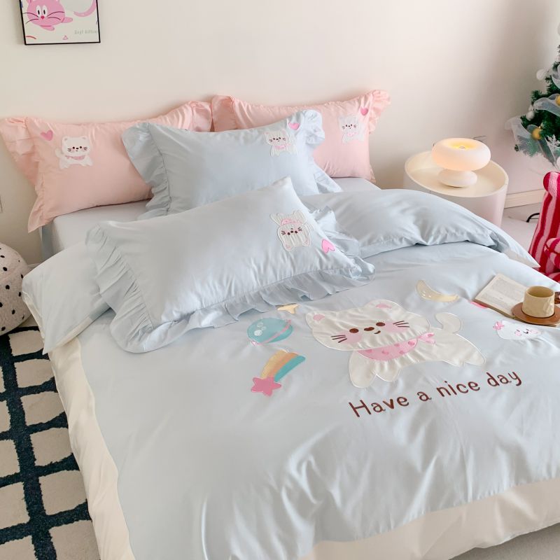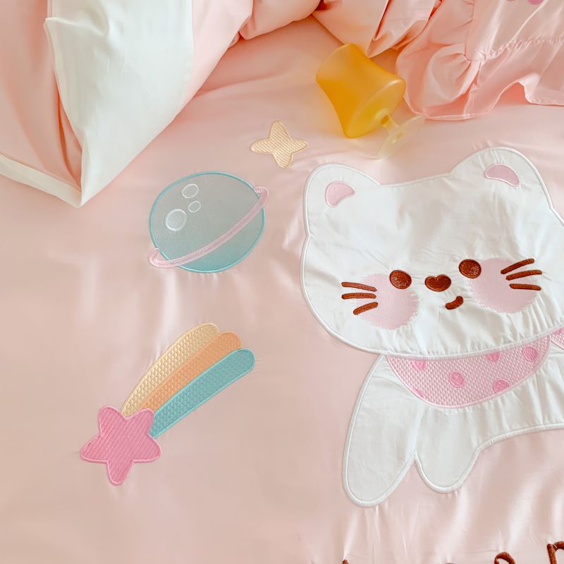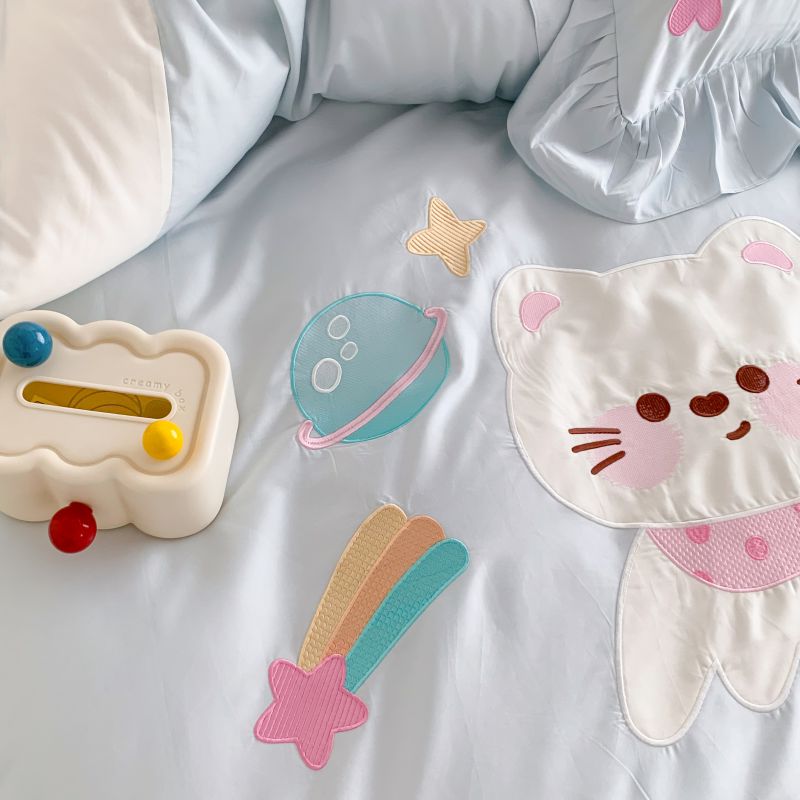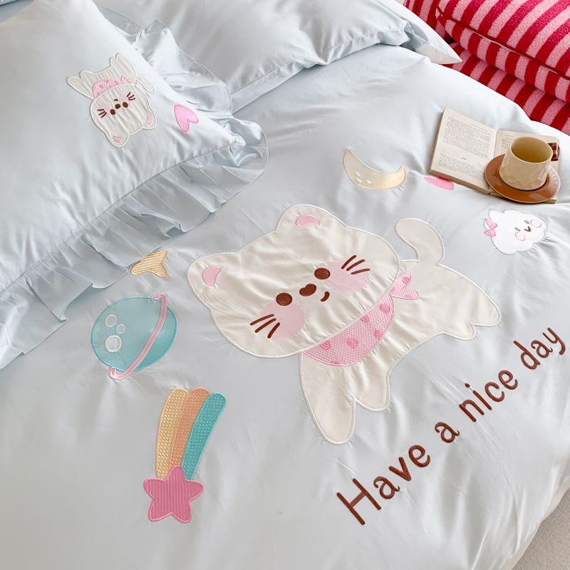 商品名称:曼布缇 2025新品卡通100s长绒棉贴布绣花四件套-猫咪星球 蓝