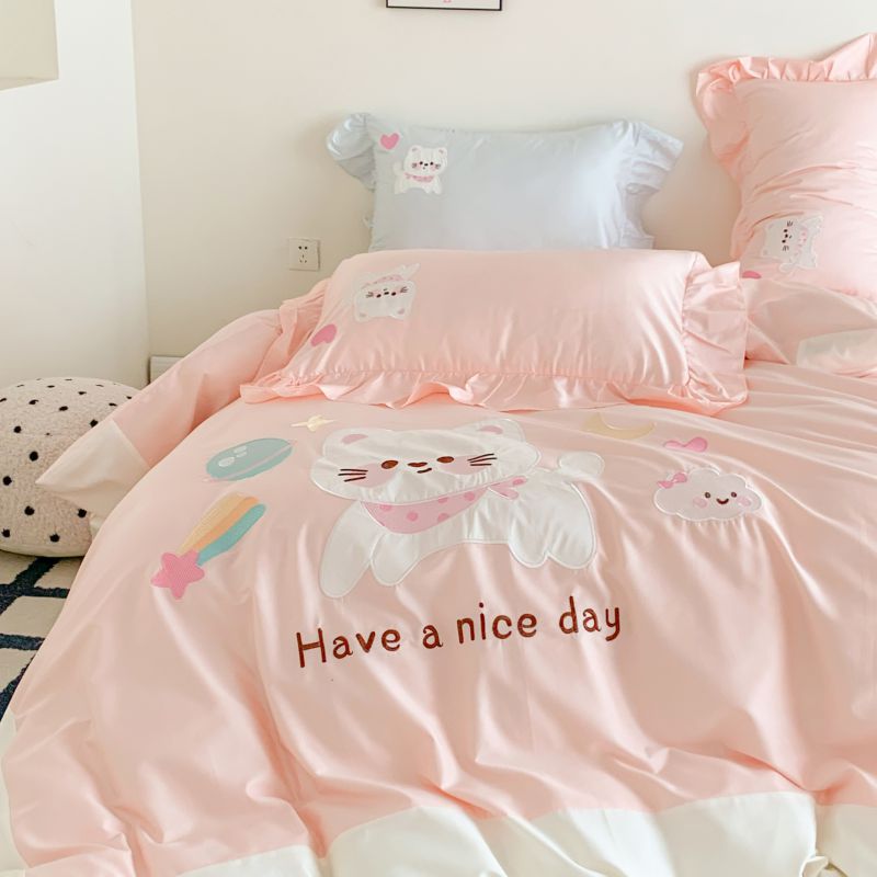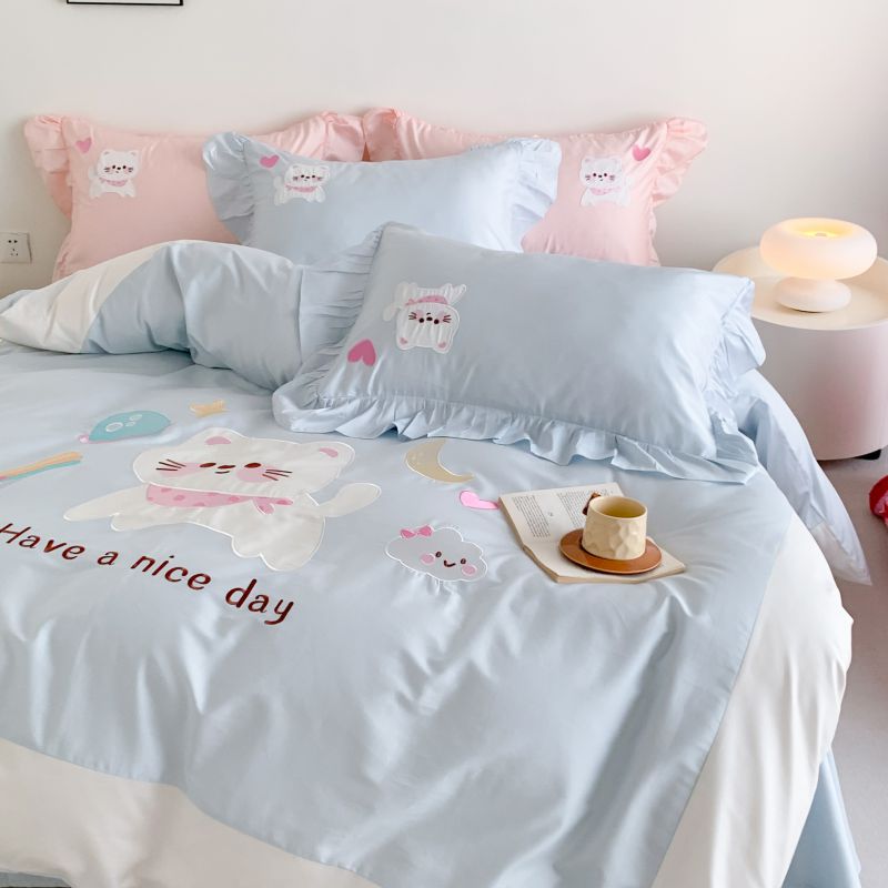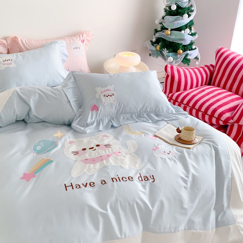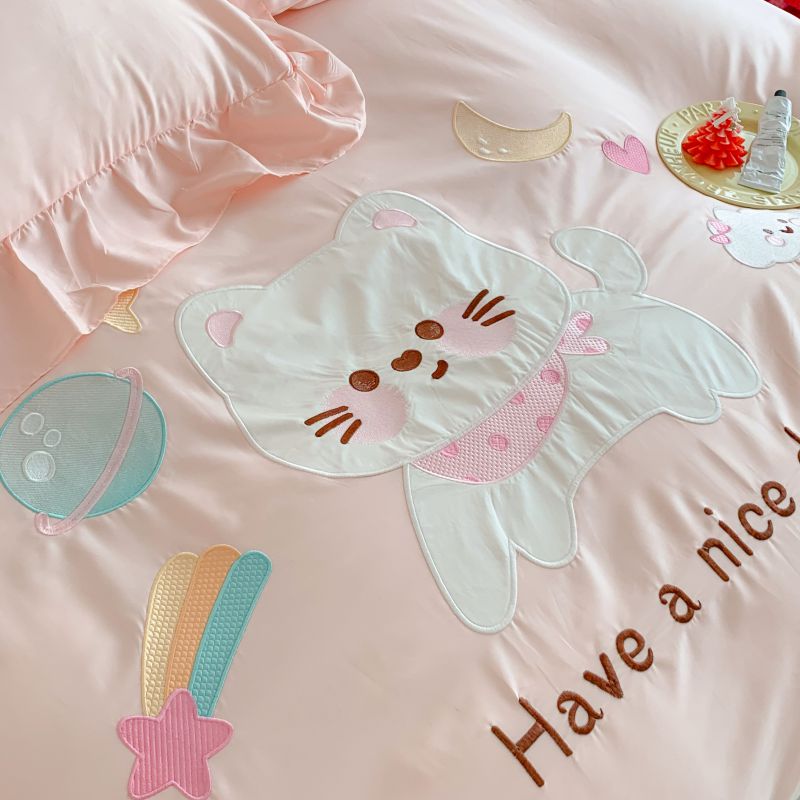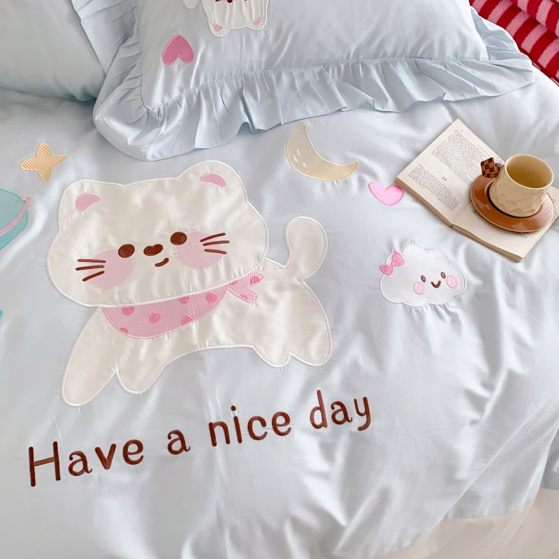 商品名称:曼布缇 2025新品卡通100s长绒棉贴布绣花四件套-猫咪星球 蓝