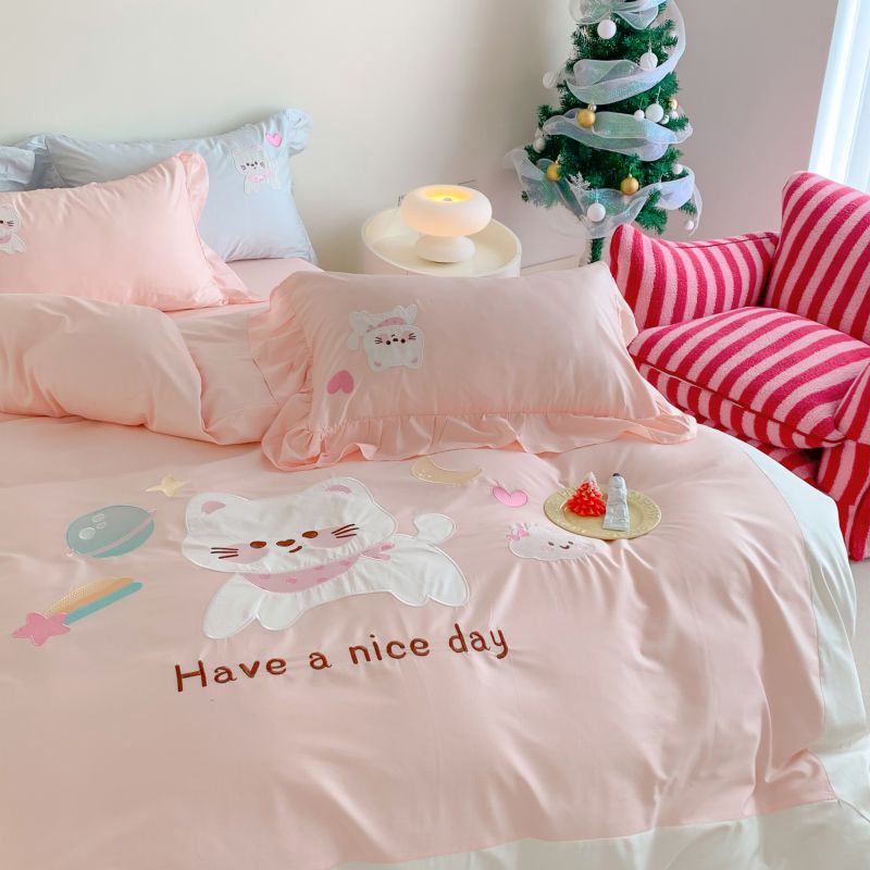 曼布缇 2025新品卡通100s长绒棉贴布绣花四件套-猫咪星球 蓝