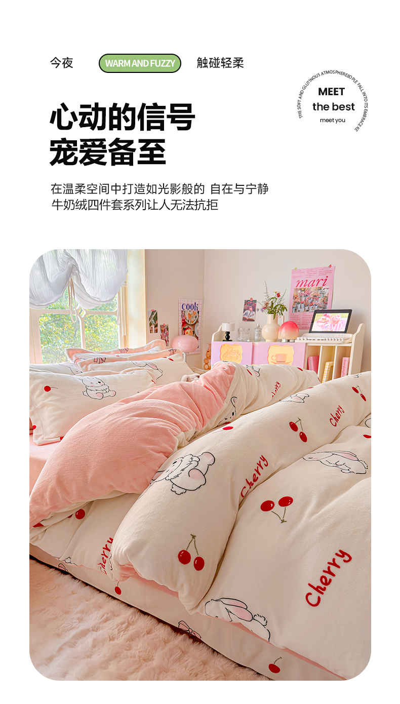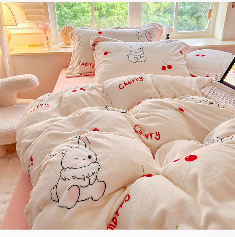 呗旺鹿 2024新款高克重印花牛奶绒四件套 樱桃兔