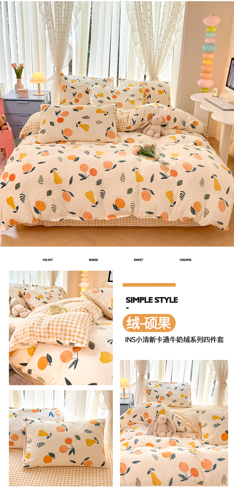 商品名称:桃子家居 2024新款ins小清新花卉少女卡通跑量牛奶绒系列四件套 绒-爱心满满
