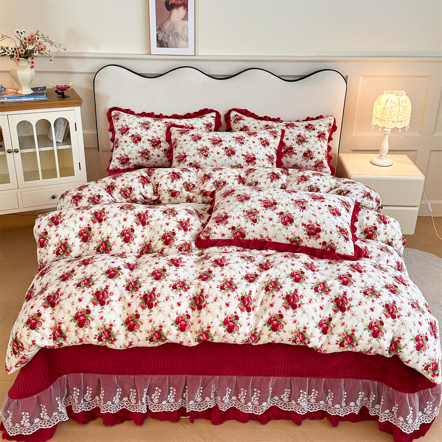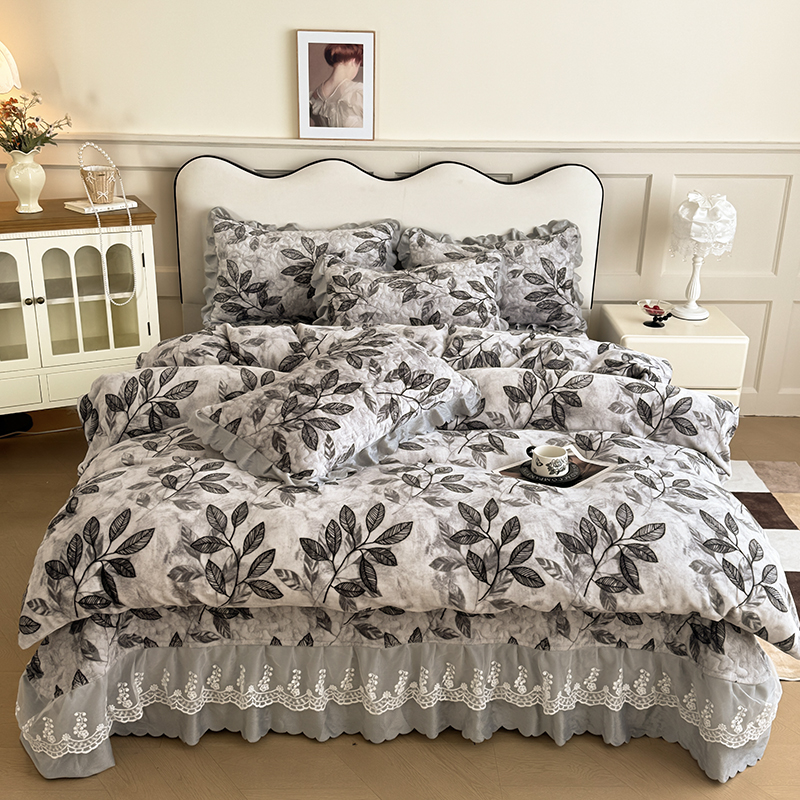 商品名称:(总)雅眠居 2025新款直播爆款牛奶绒印花床盖四件套双层蕾丝花边床裙单件三件套