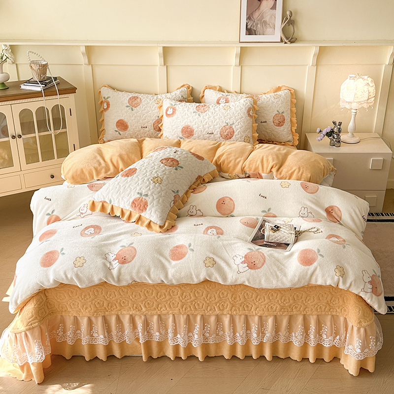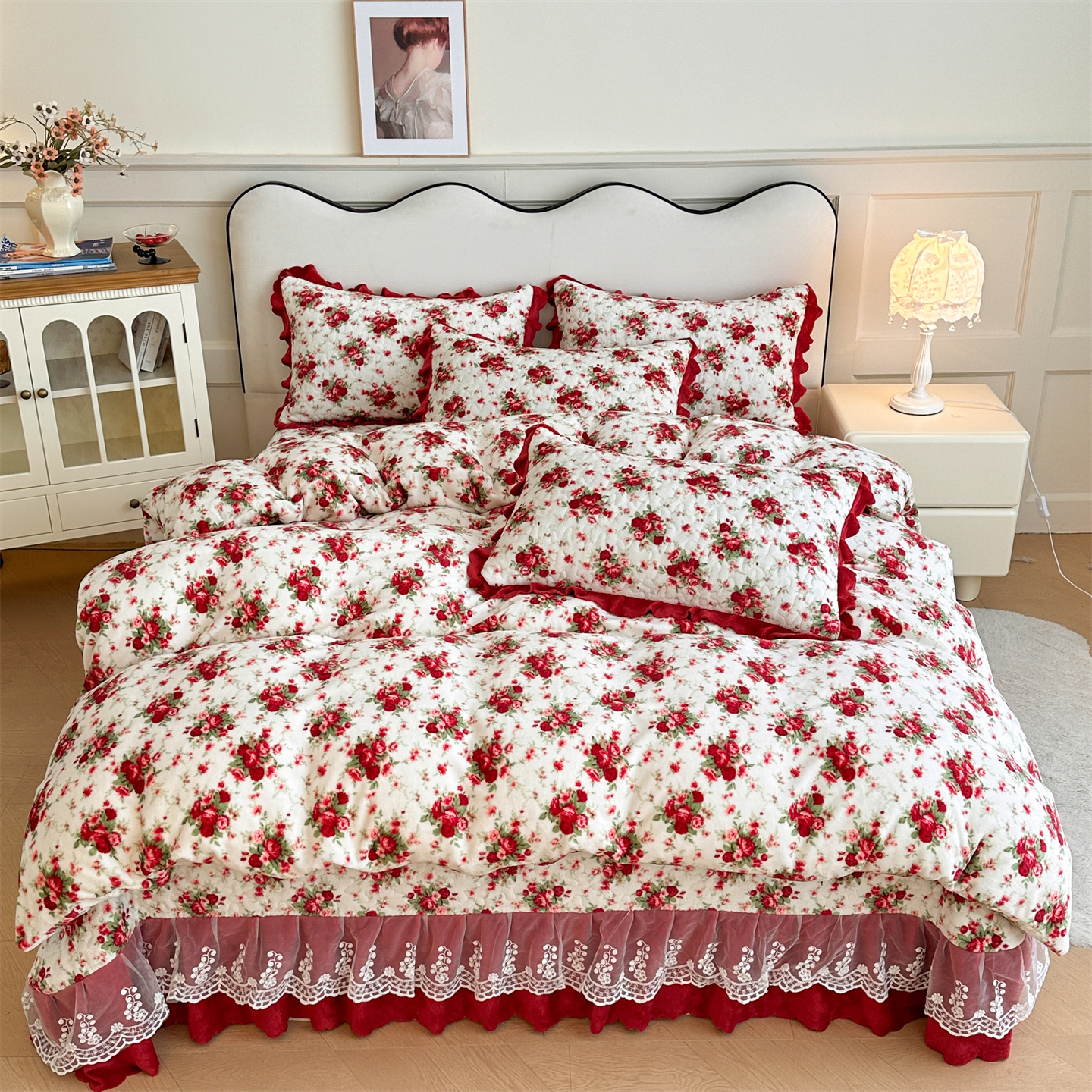(总)雅眠居 2025新款直播爆款牛奶绒印花床盖四件套双层蕾丝花边床裙单件三件套