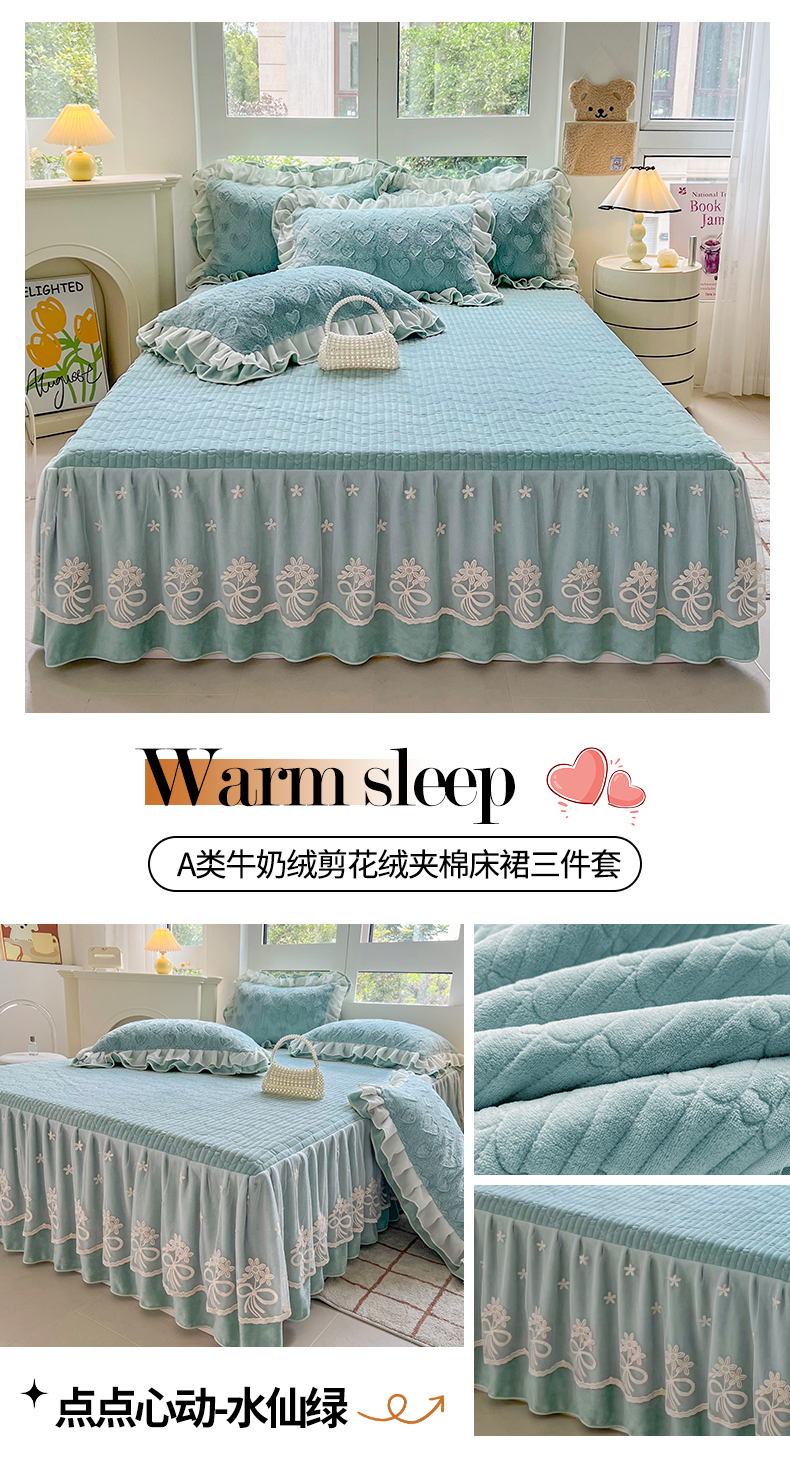 当前位置: 91家纺网 > 商品网购 > 床品套件 > 三件套 > 宜凡家纺 2024新款A类牛奶绒剪花绒床裙三件套 点点心动-海洋蓝