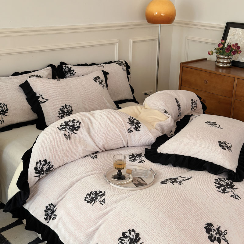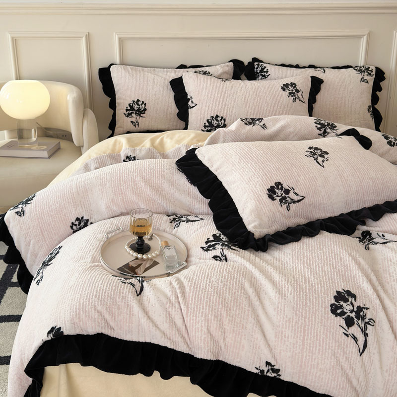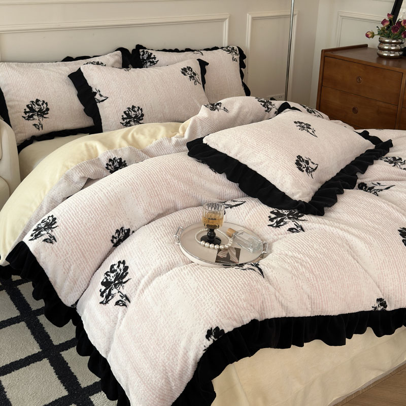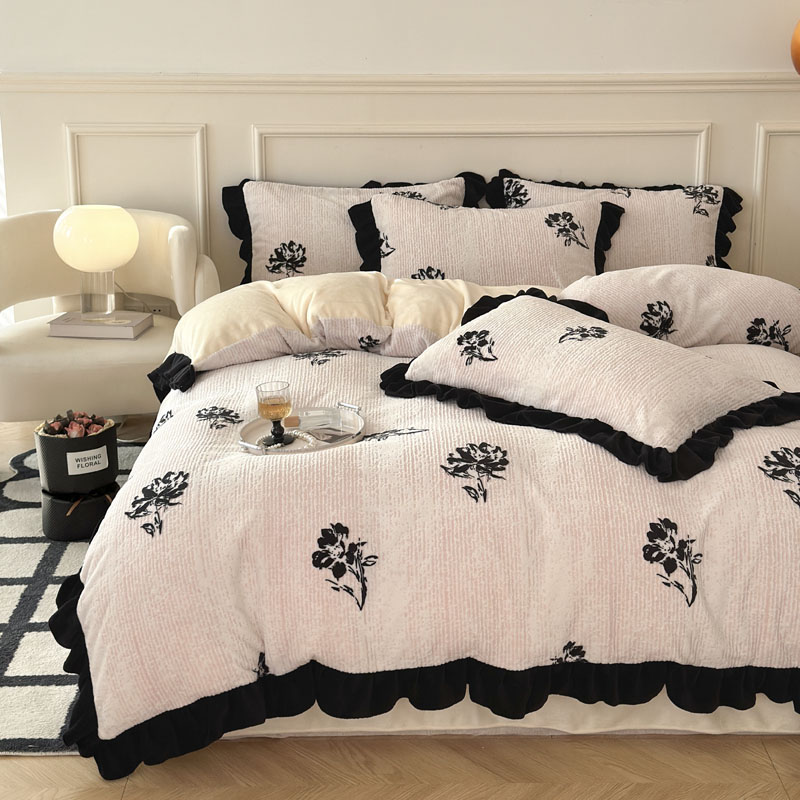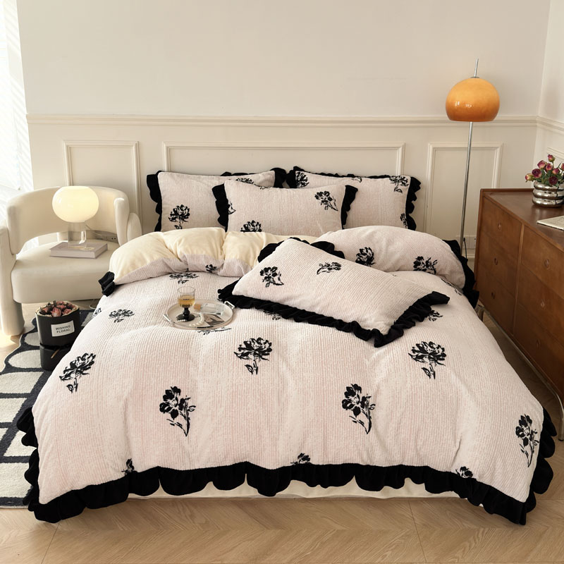 (总)大麦家纺 2025新款高克重牛奶绒花边床盖四件套,玫瑰故事,豹纹,复古樱桃,蝴蝶结紫色,玫瑰之约,美拉德猫,织梦空间