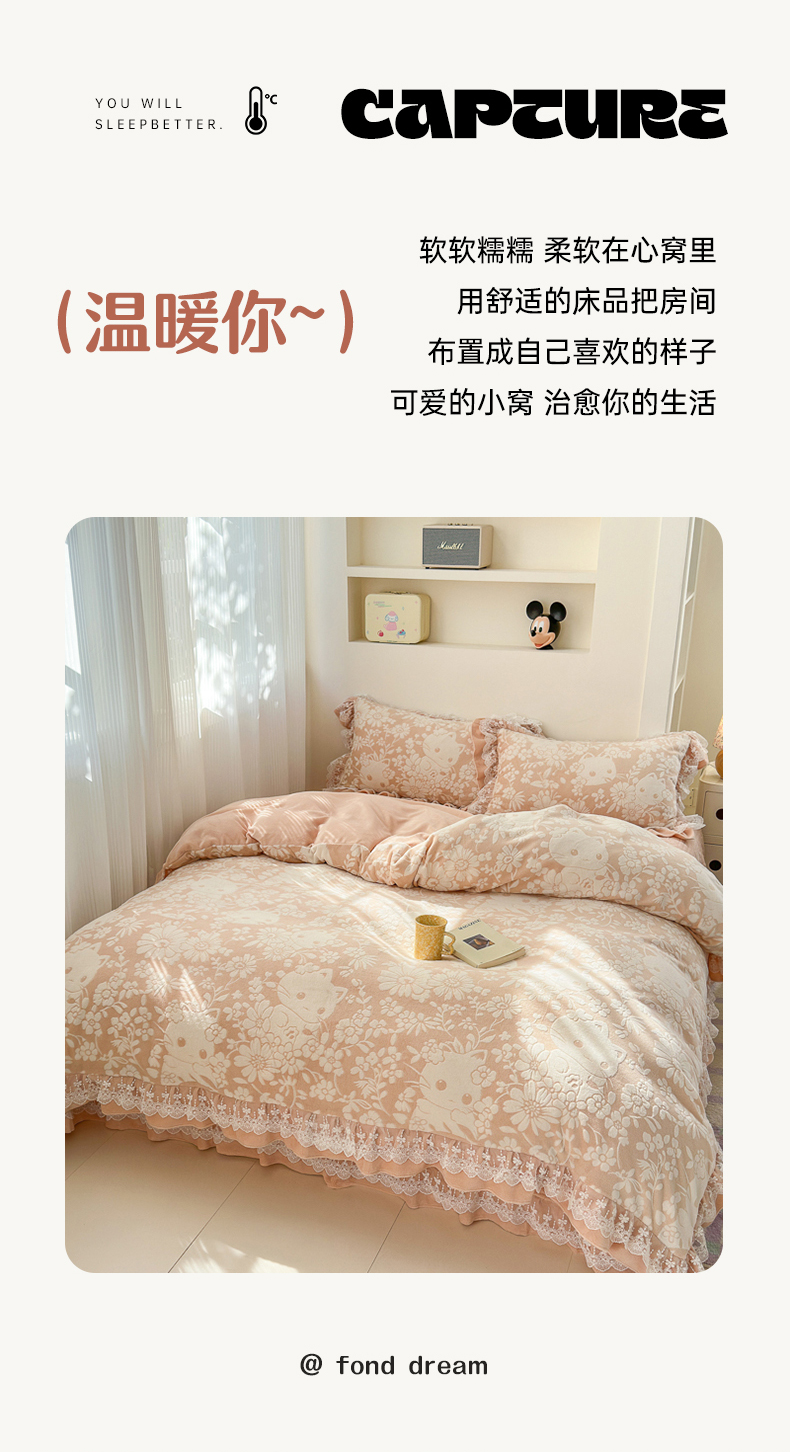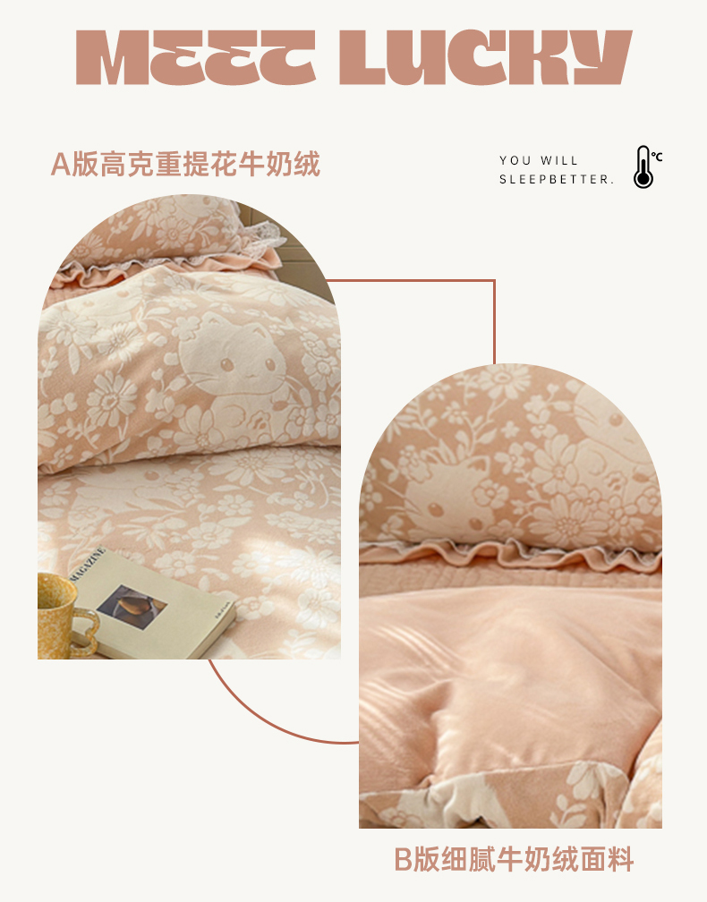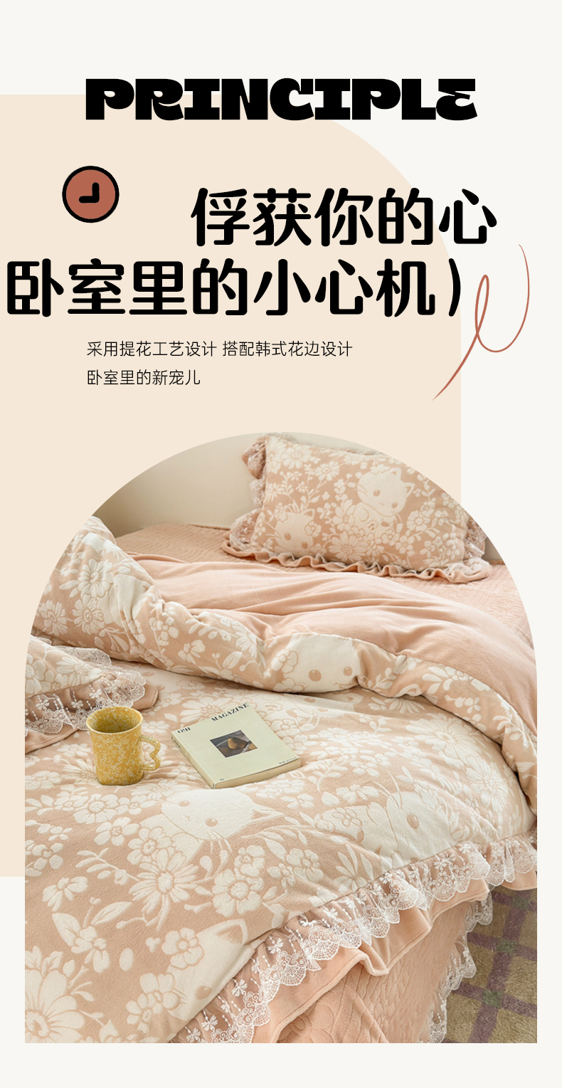 淑女公社家纺 2024秋冬新款提花牛奶绒床盖款四件套 可爱猫 玉色