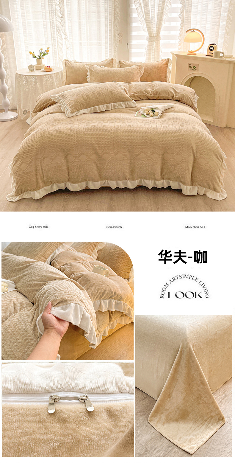 商品名称:雅萱家纺 2024新款高克重牛奶绒雕花四件套-华夫 华夫-咖