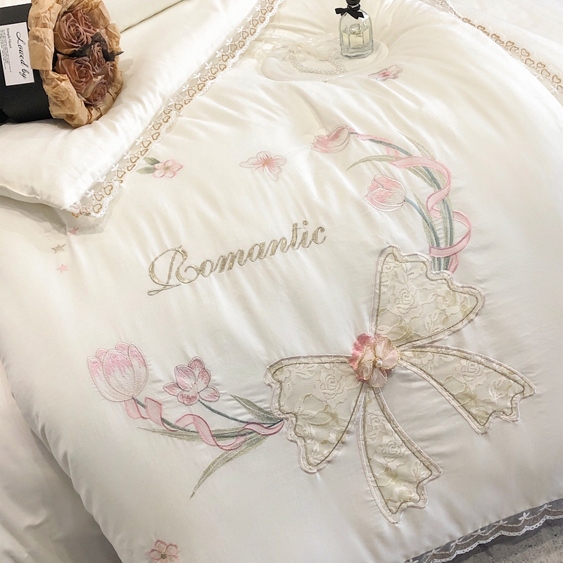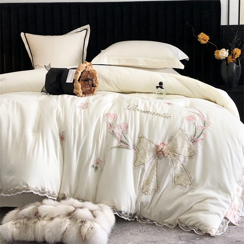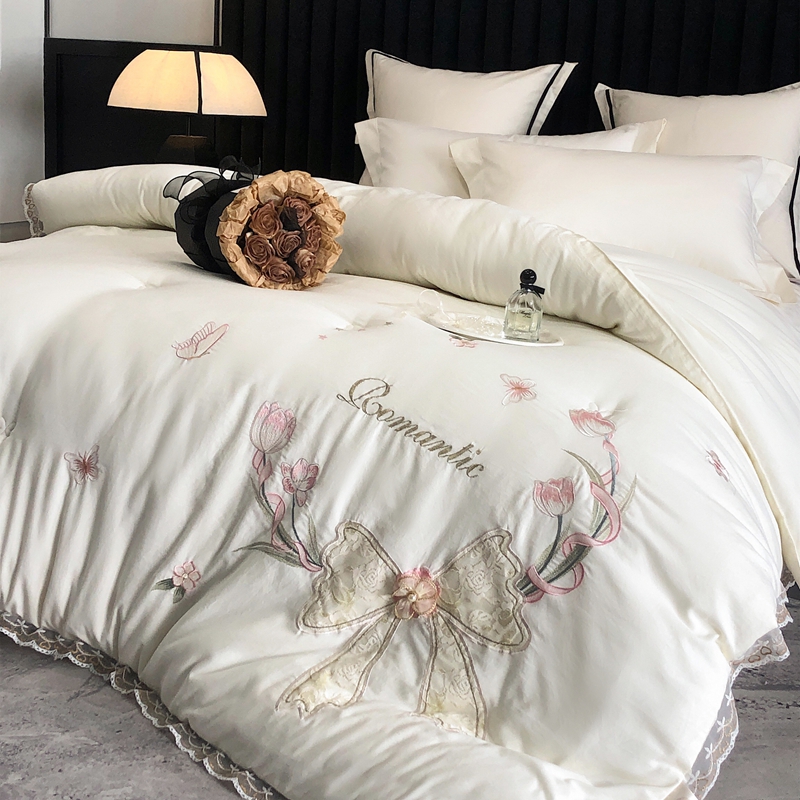 (总)宅家居 2025新款樱花恋系列-轻奢法式小香风双面100%纯棉刺绣拼接款全棉长绒棉四件套,樱花粉,繁星蓝,松石绿,香槟金